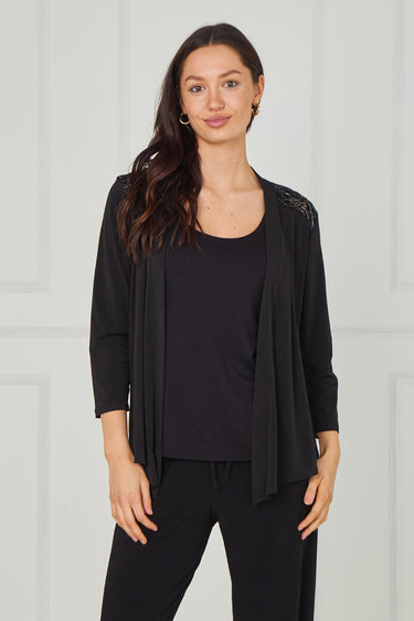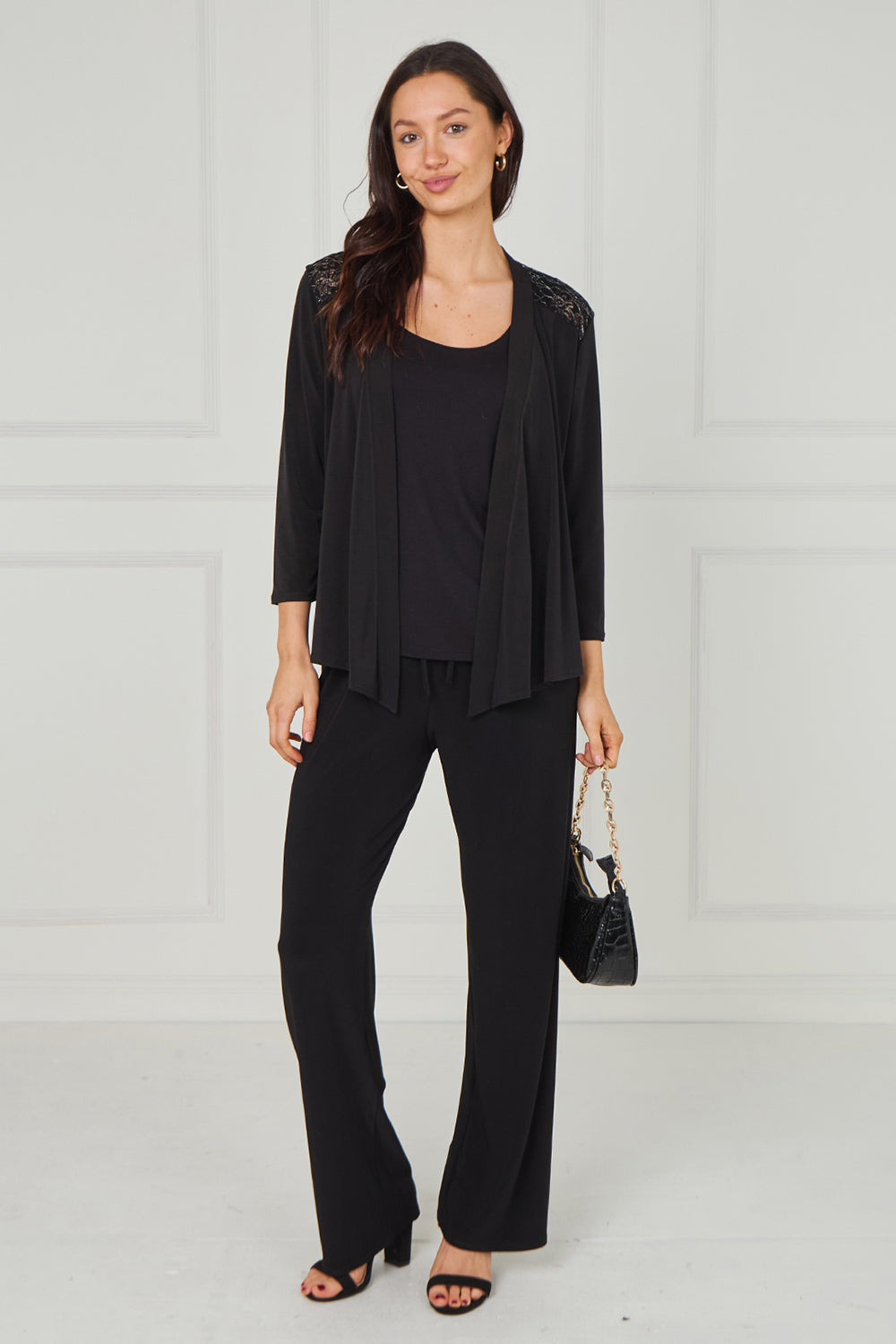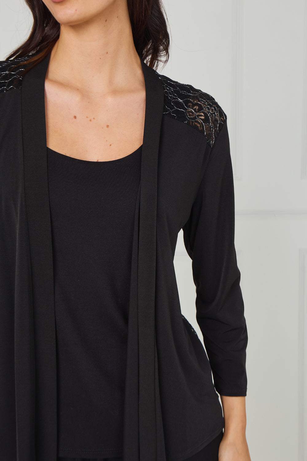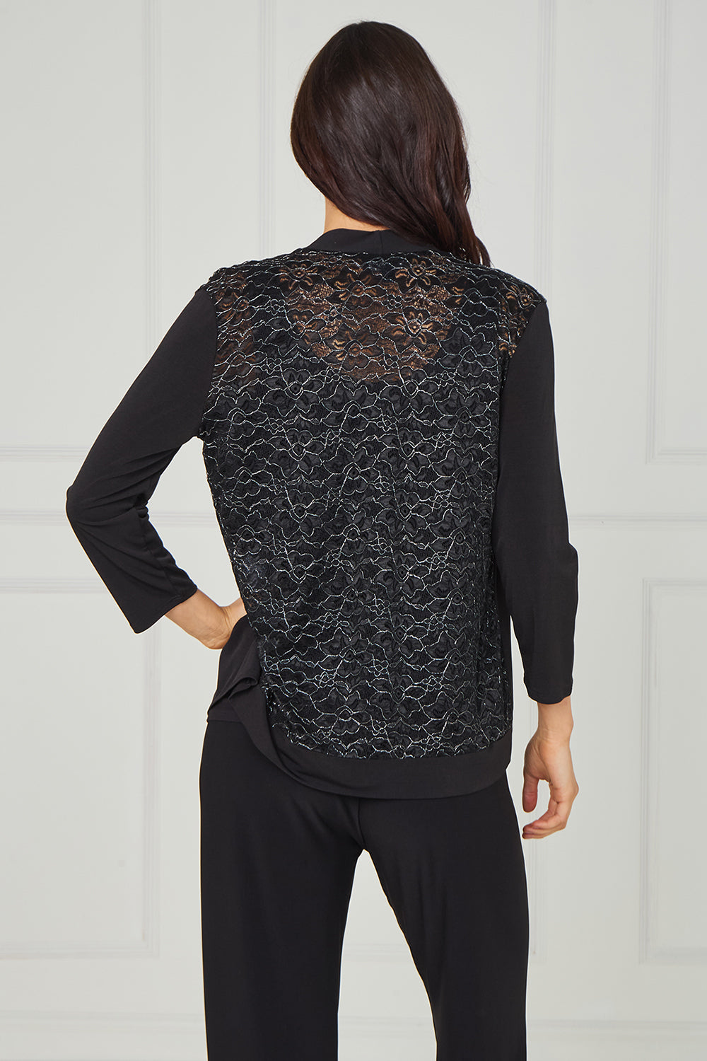 Saloos Women's Black Open-Front Jacket with Sparkle Lace Back – Elegant Layering Piece for Parties & Evenings