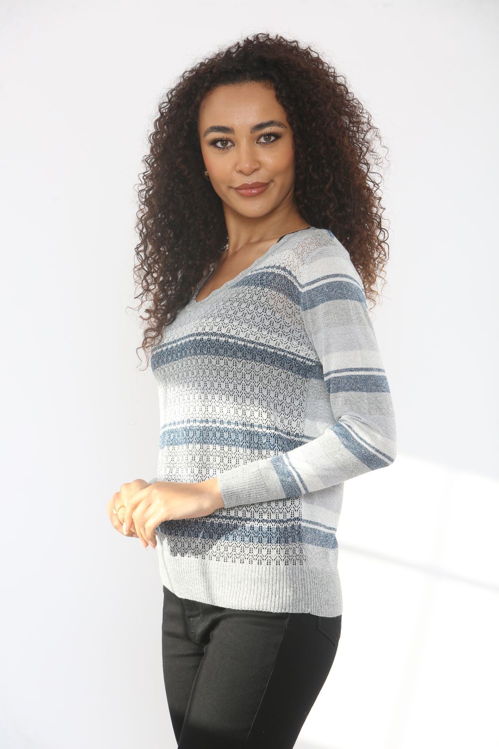 Saloos Women’s Light Grey & Blue Striped V-Neck Knit Sweater – Soft Lightweight Everyday Jumper
