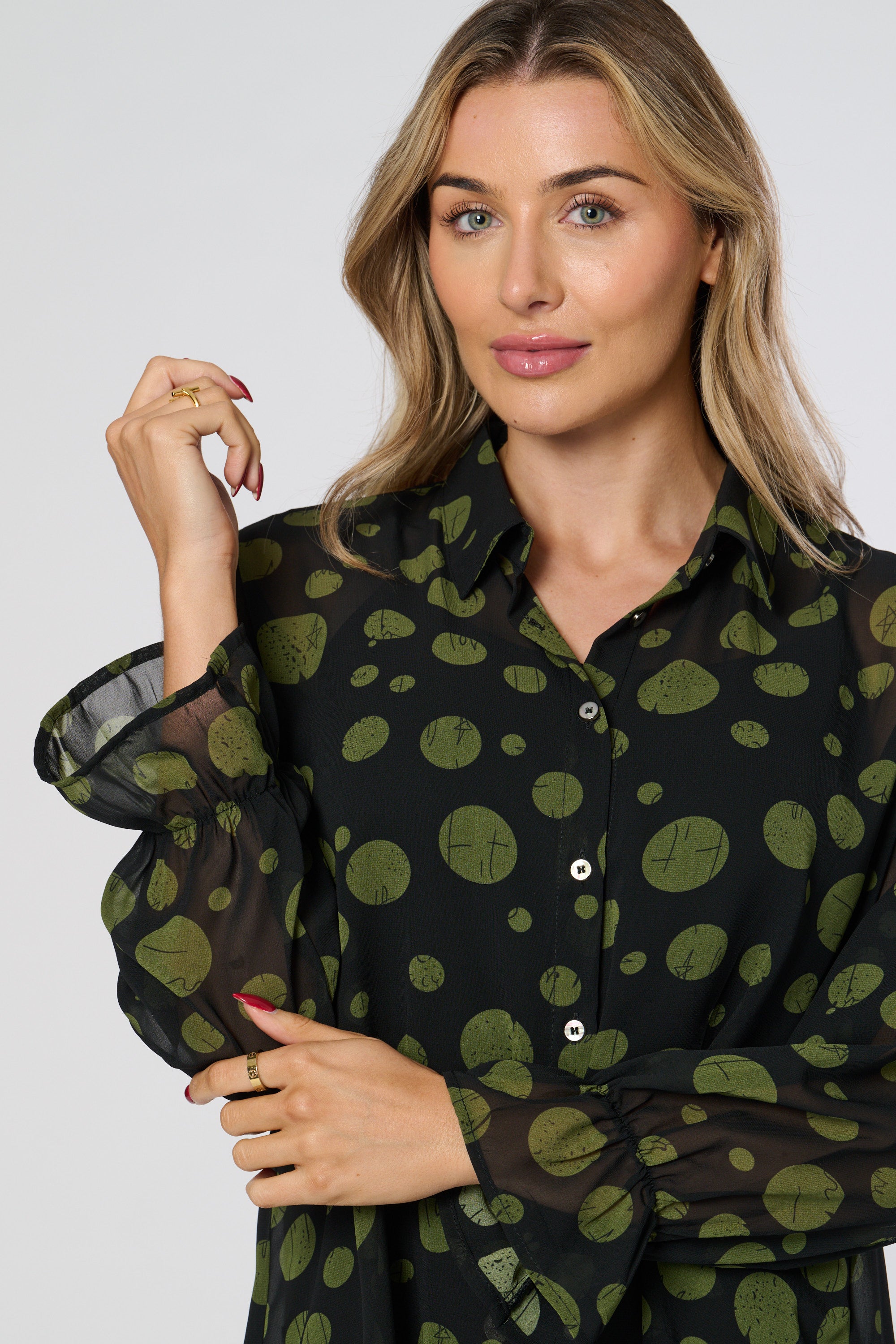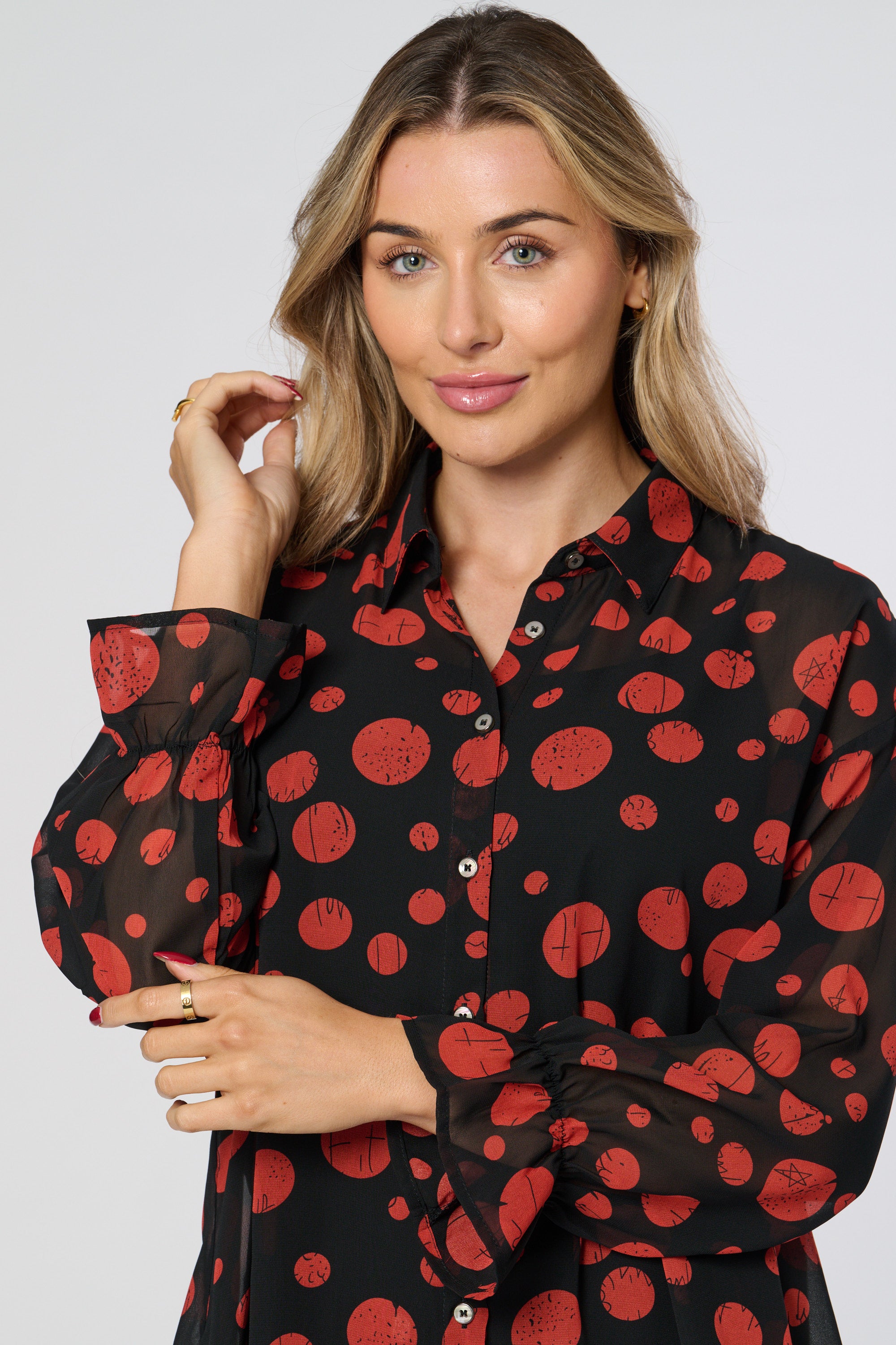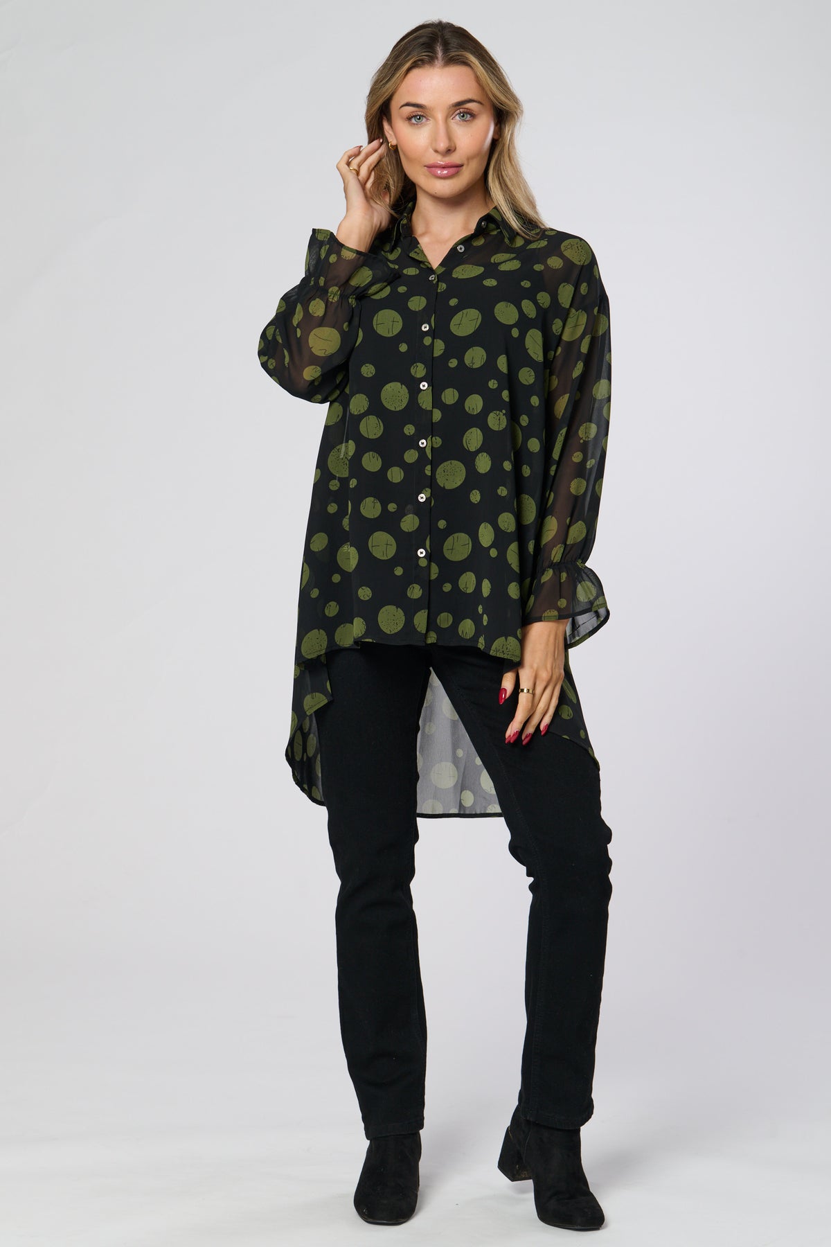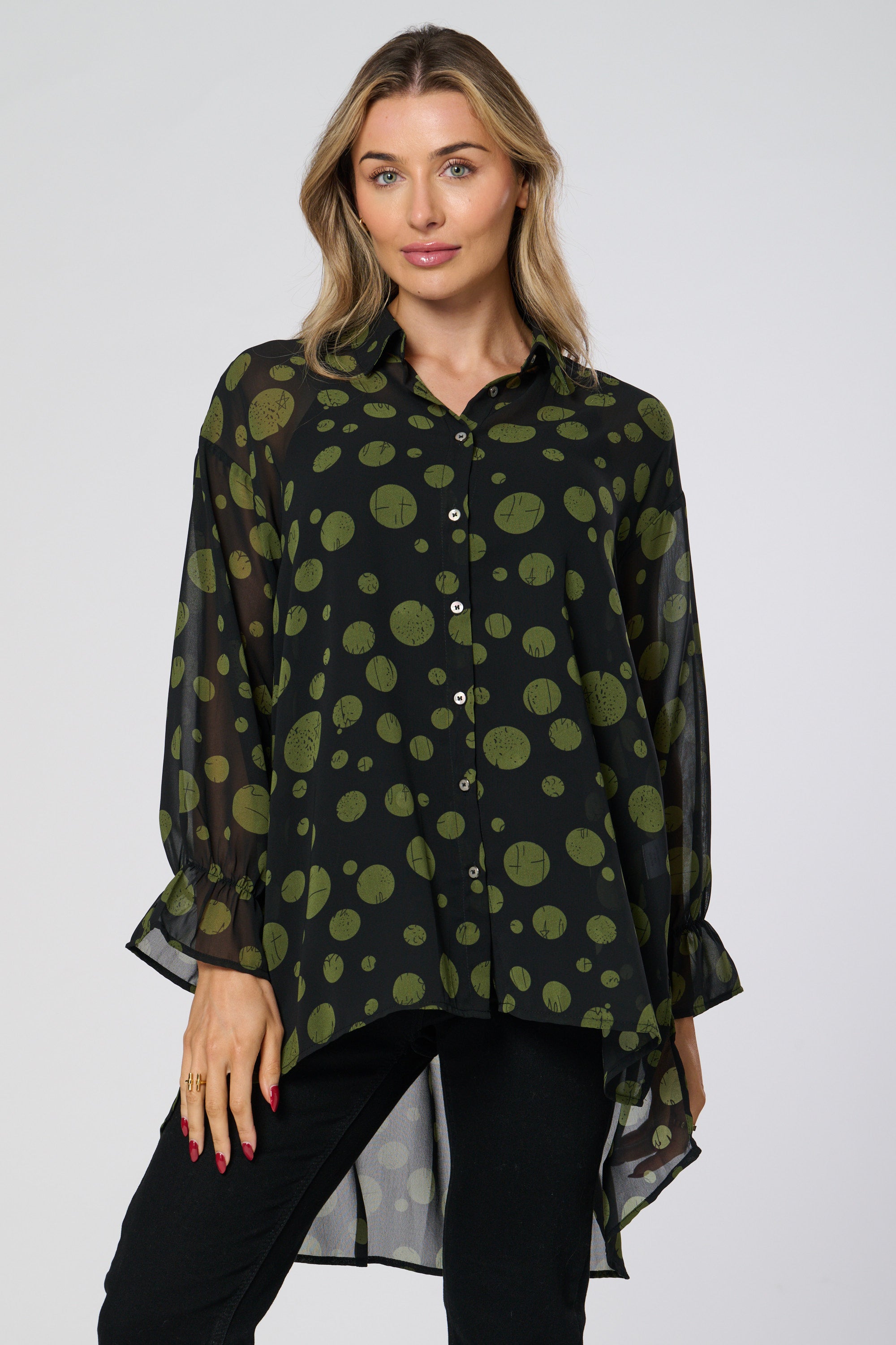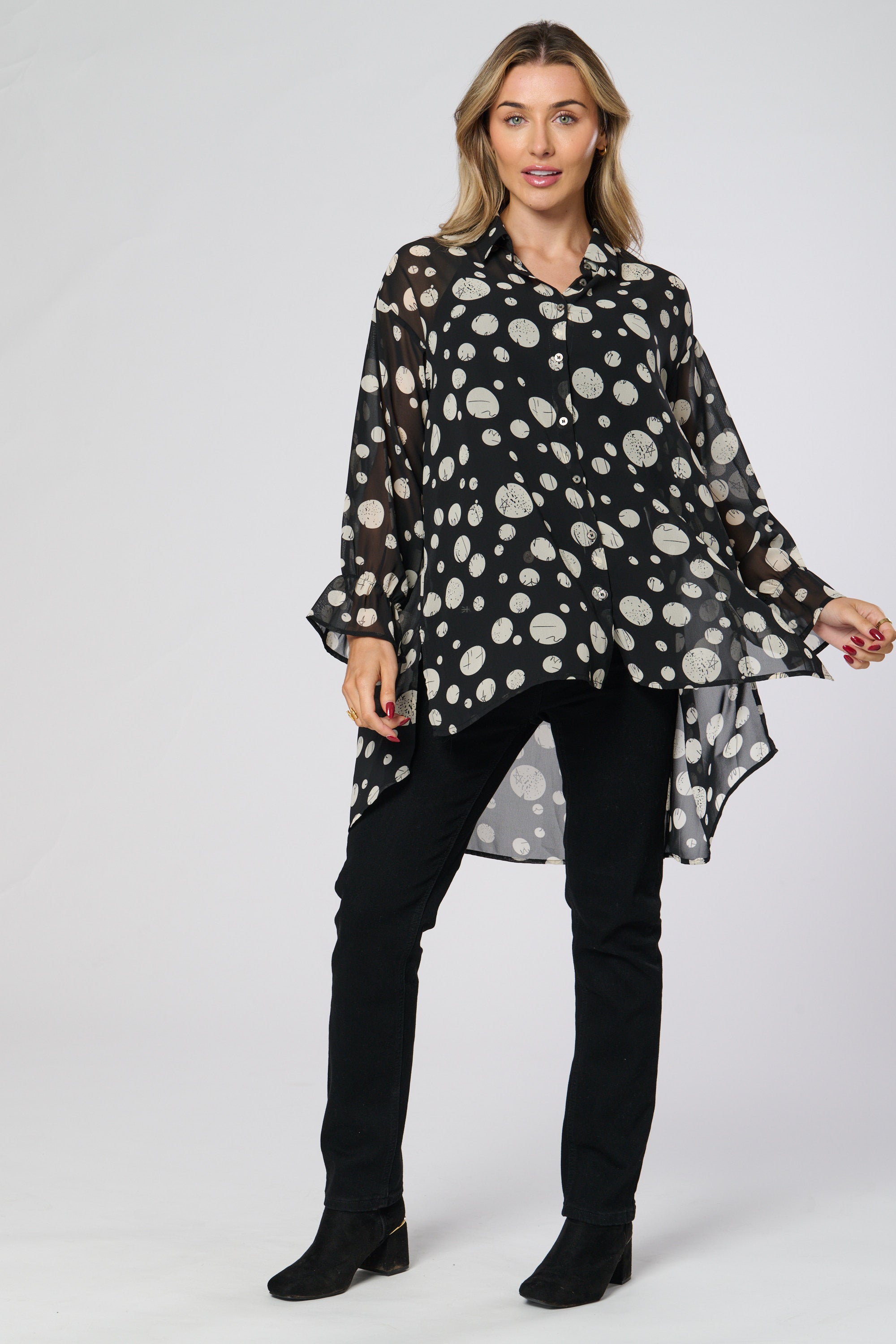 This dip back shirt boasts a sheer fabric, long sleeves, and puff sleeves for a stylish and on-trend look. The sheer fabric adds a touch of femininity, while the long and puff sleeves provide versatility. Perfect for any fashion-forward individual looking to elevate their wardrobe.