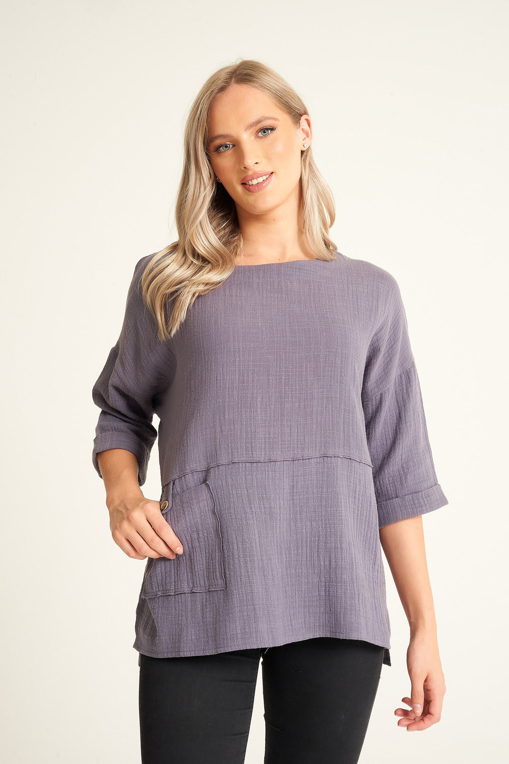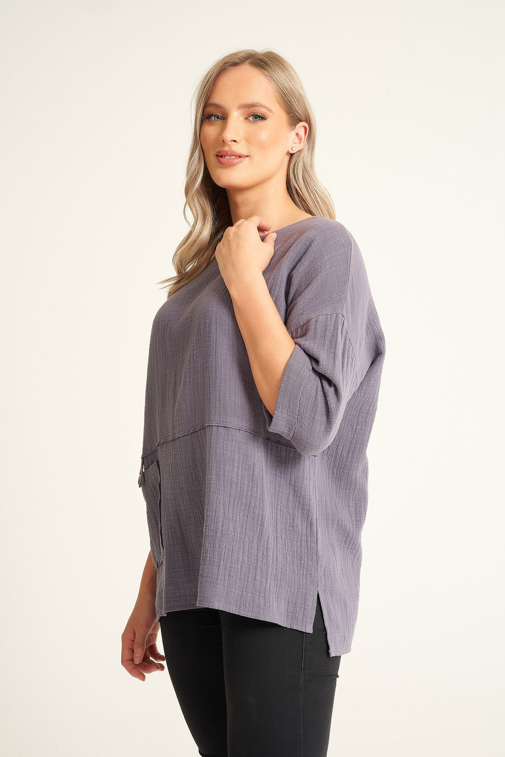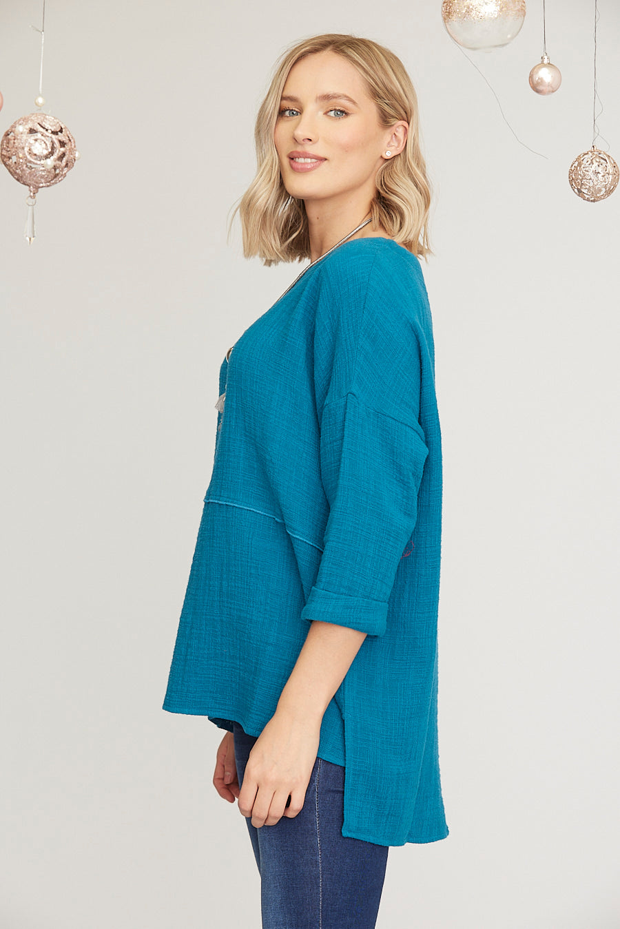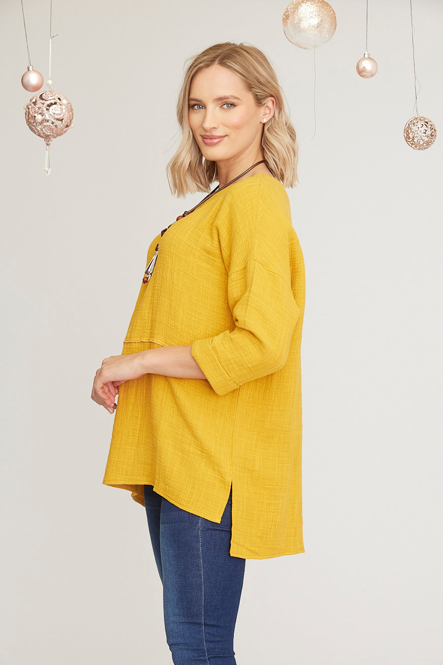 A stylish top made from cotton fabric with a textured finish. It features extended shoulder, three-quarter sleeves, and side slits for ease of movement. There is also a side pocket and a matching necklace*, creating a polished look. Enjoy a comfortable fit and up-to-date style.