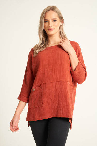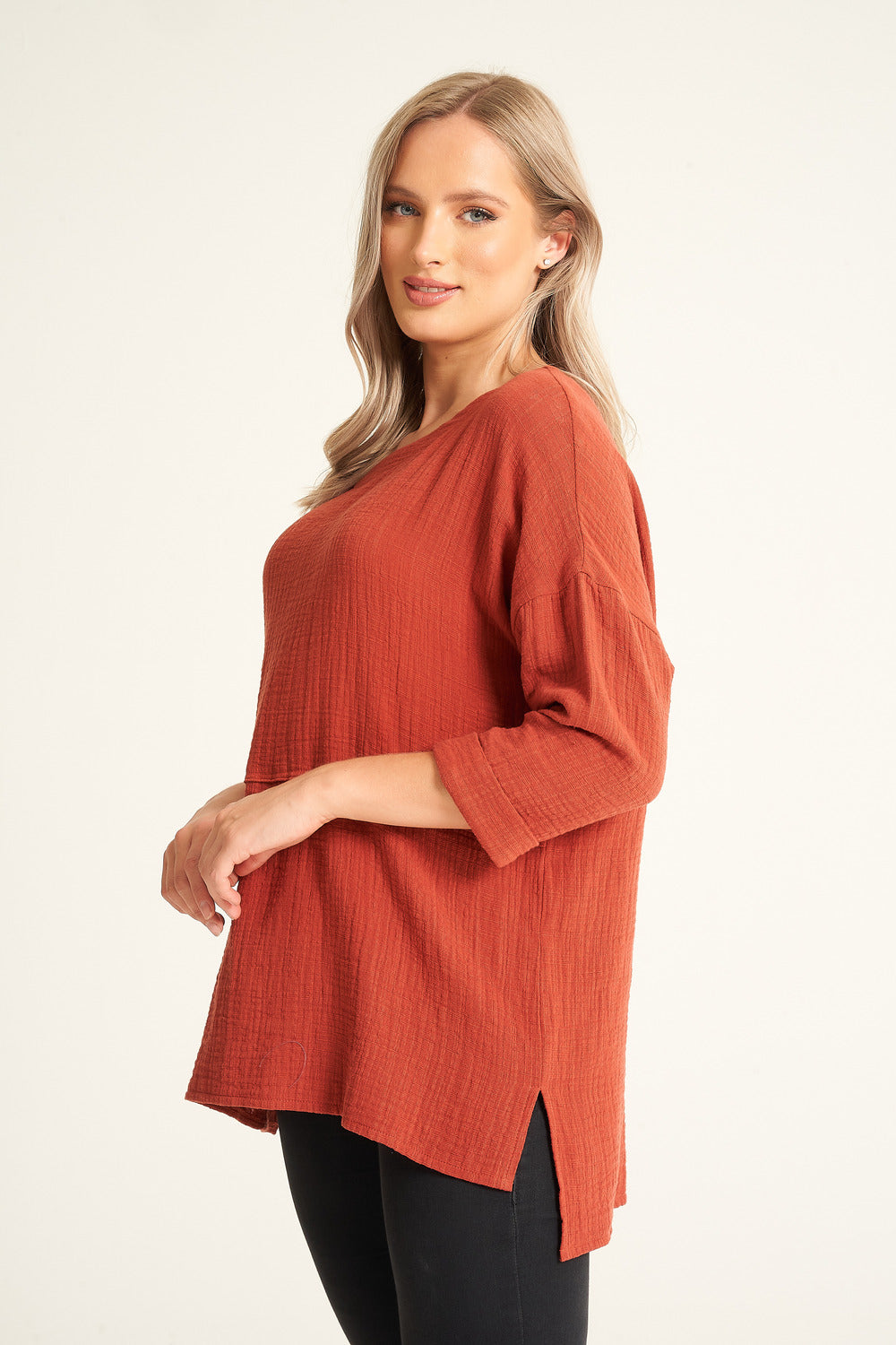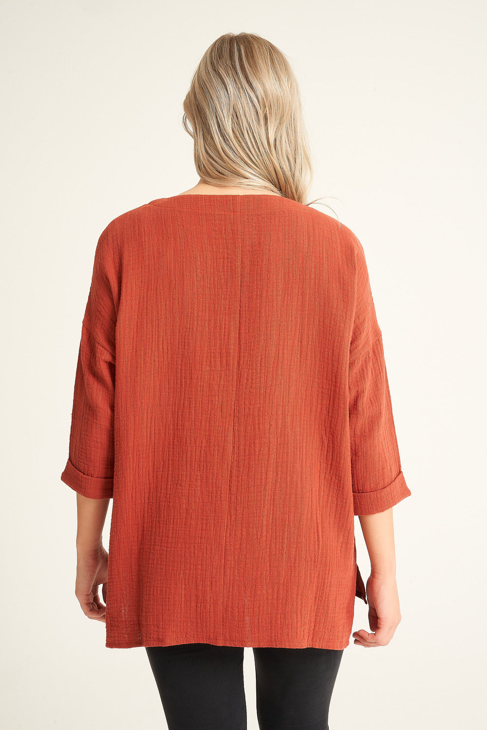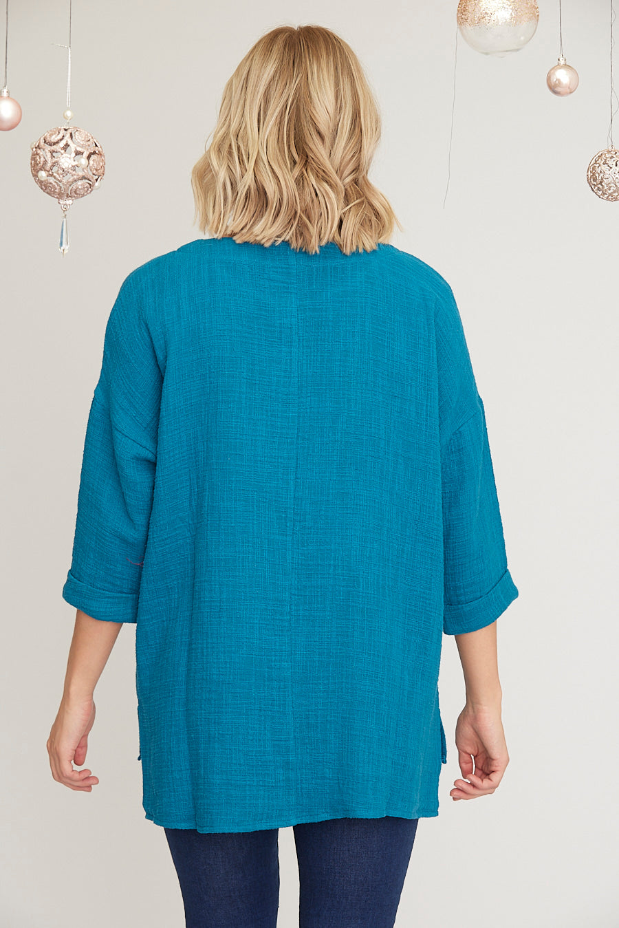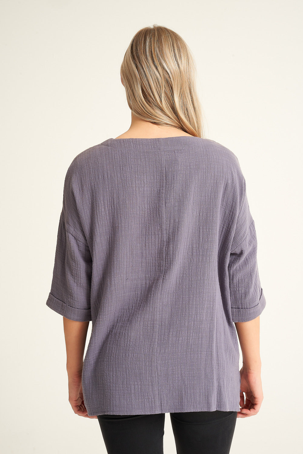 A stylish top made from cotton fabric with a textured finish. It features extended shoulder, three-quarter sleeves, and side slits for ease of movement. There is also a side pocket and a matching necklace*, creating a polished look. Enjoy a comfortable fit and up-to-date style.