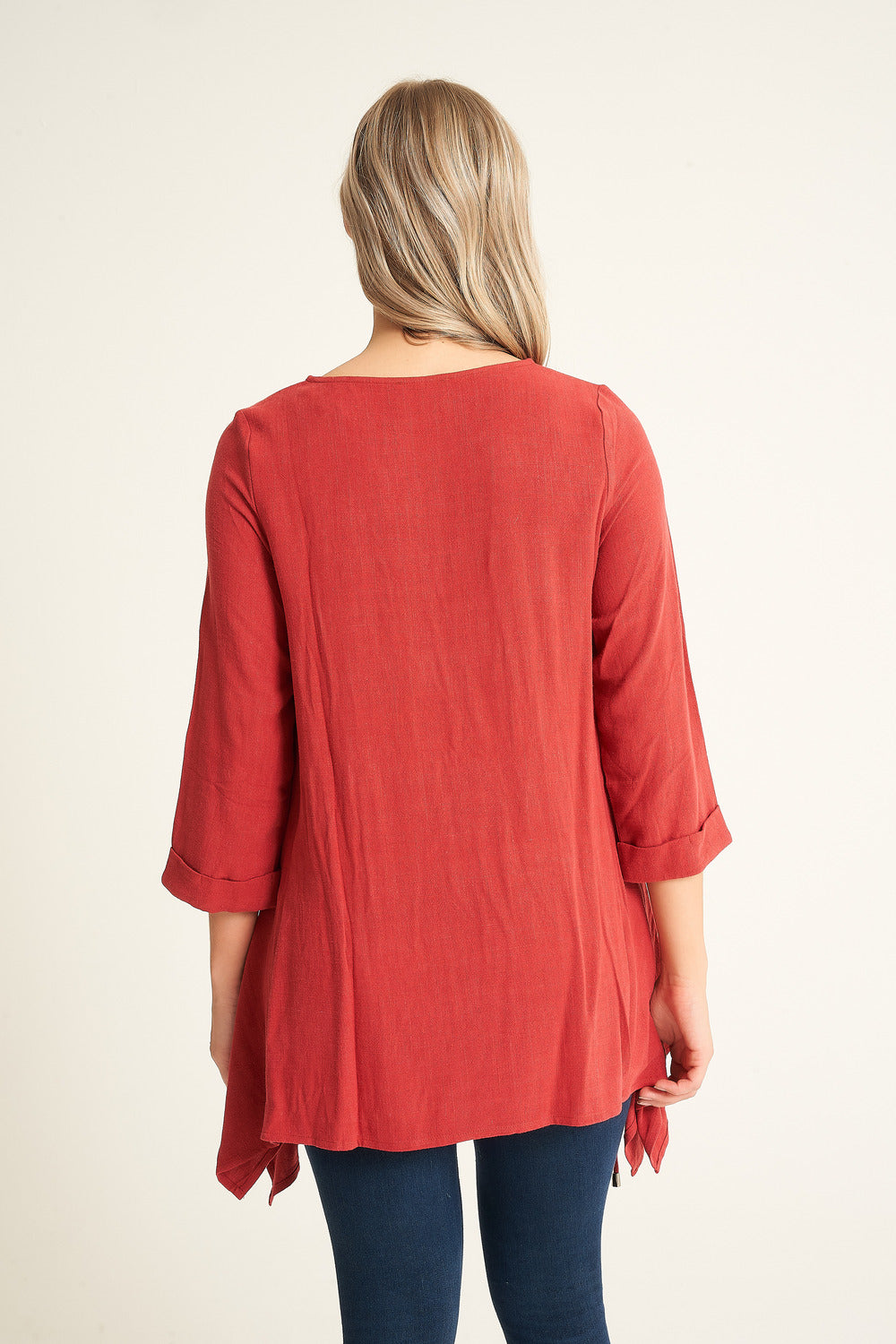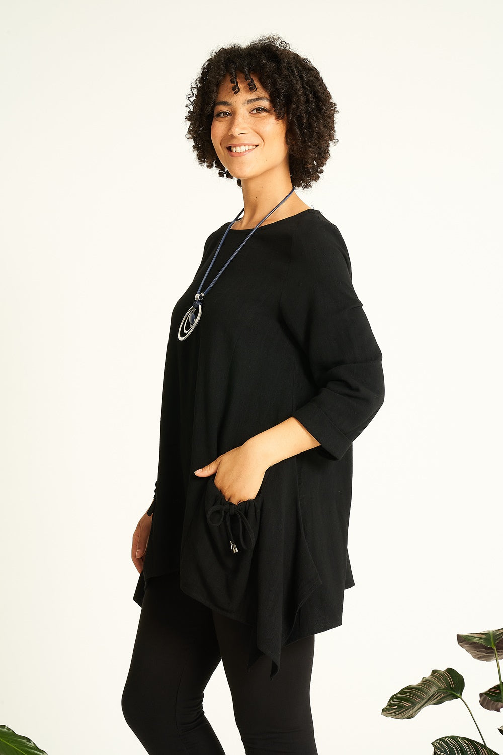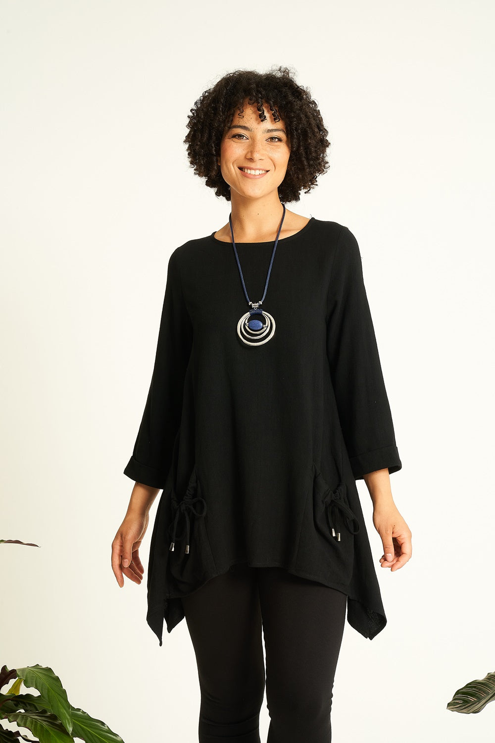 Look cool and stylish. This fashionable, frilled top features a boat neckline, three-quarter sleeves, and an elliptical hemline. It is detailed with ties on the front pockets, with a complementary necklace* included. Enjoy the ultimate comfort and elegance.
