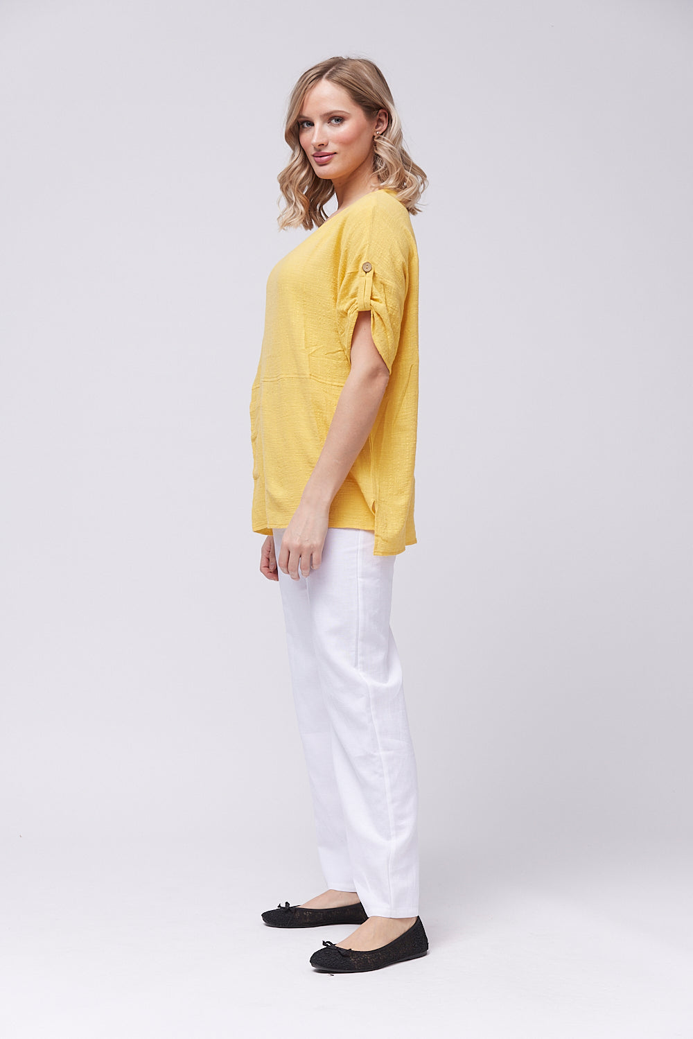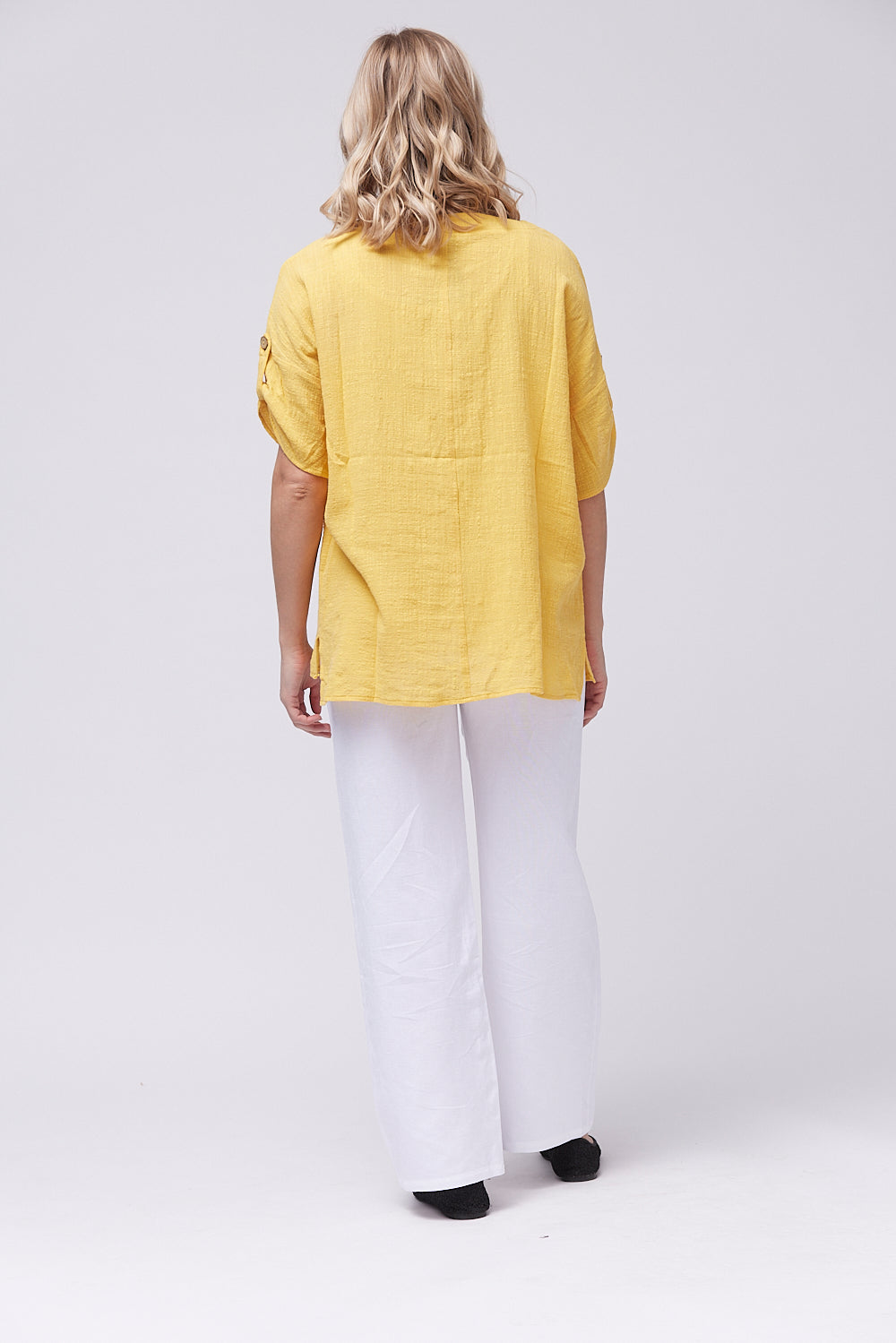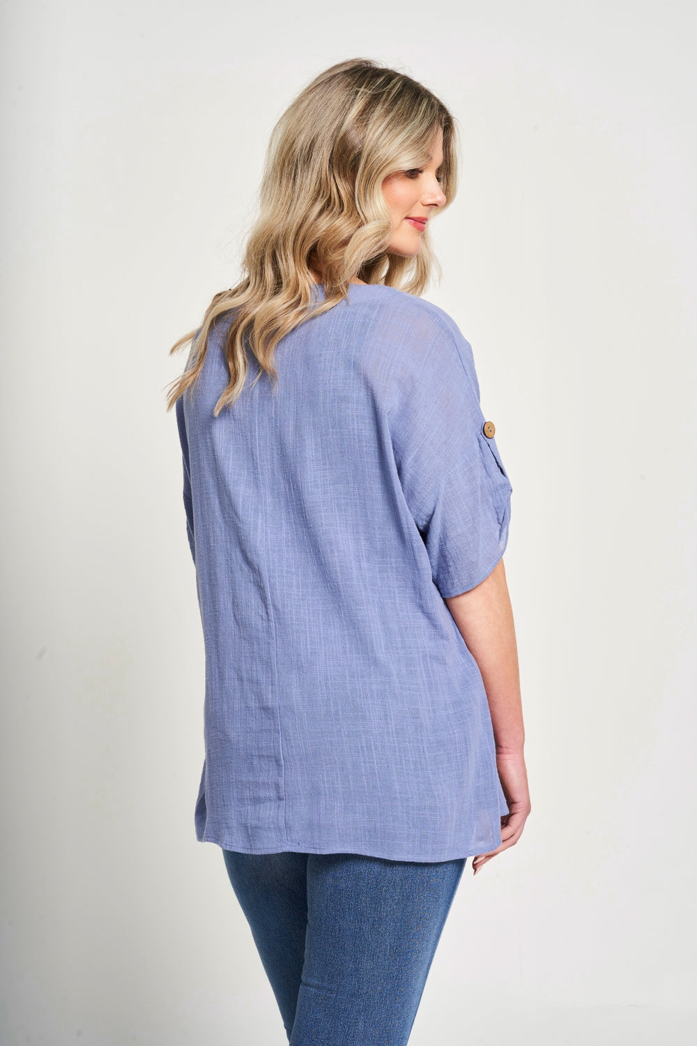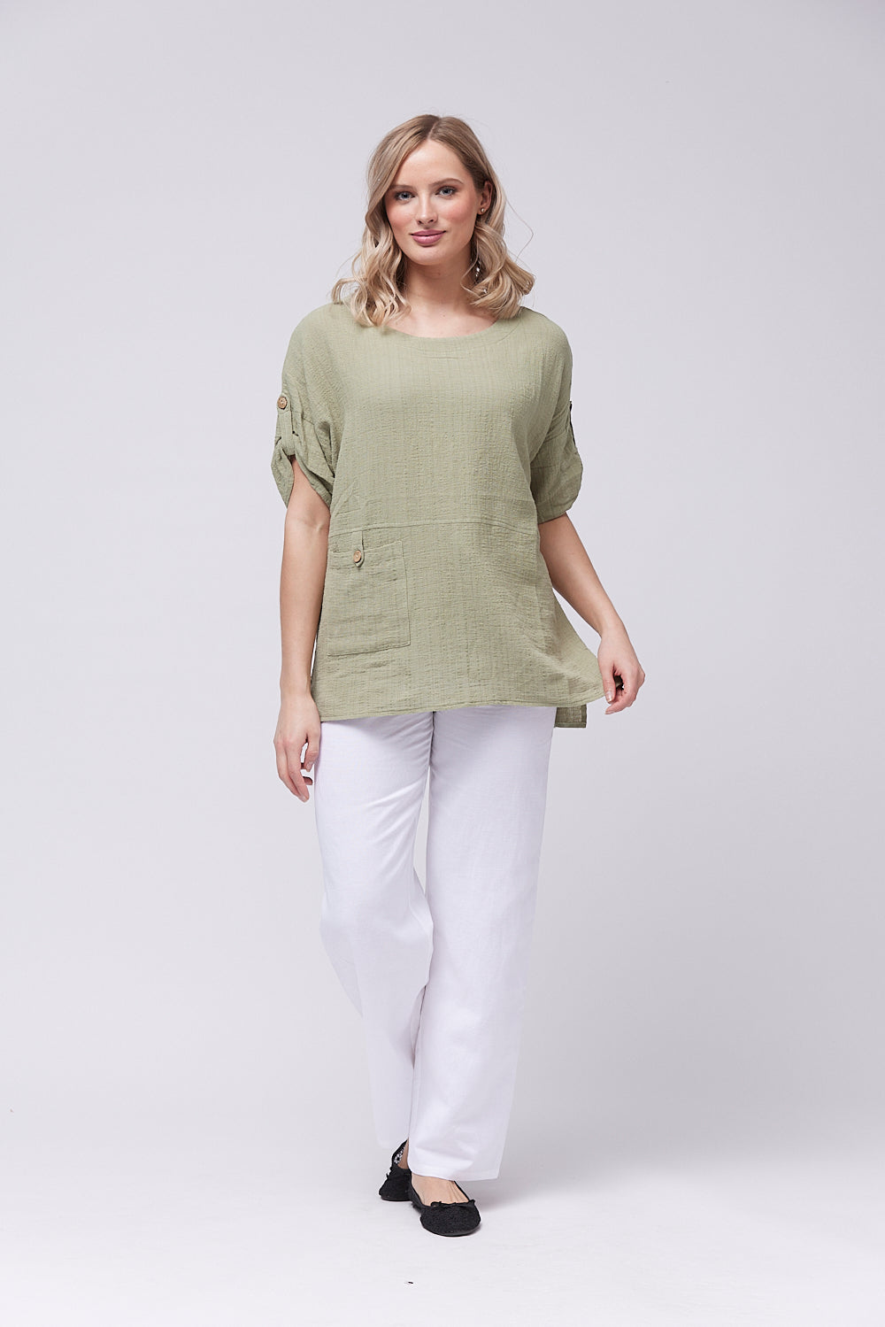 Introducing the boxy shaped top made with cotton fabric. The front pocket features a loop closure for added sophistication. The gathered sleeves with button tab and the side slits add a touch of elegance. Elevate your wardrobe with this exclusive design.