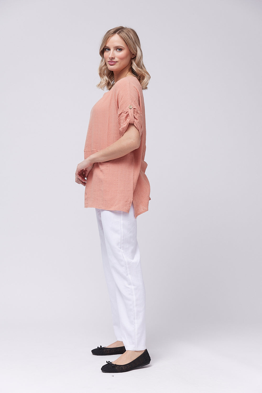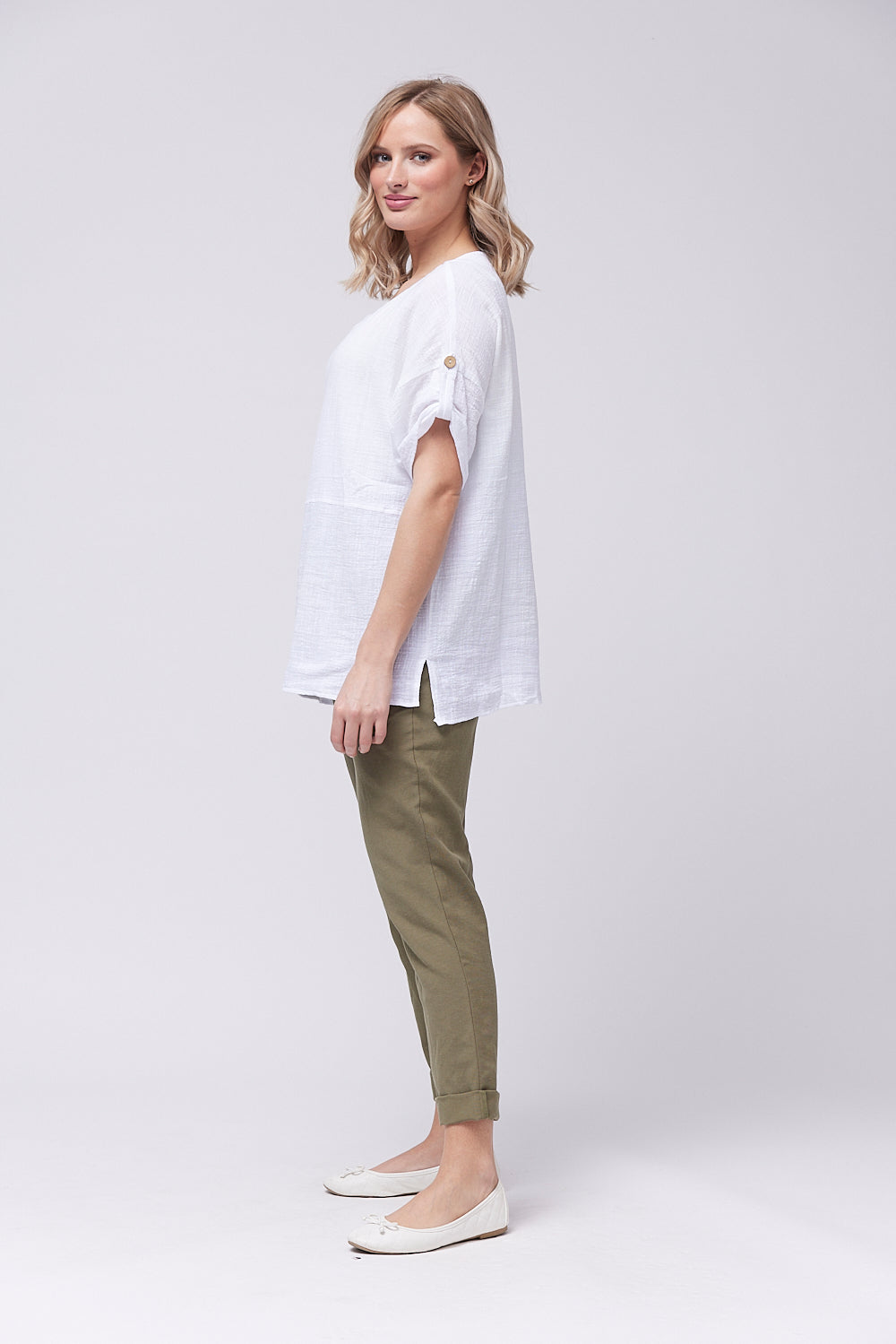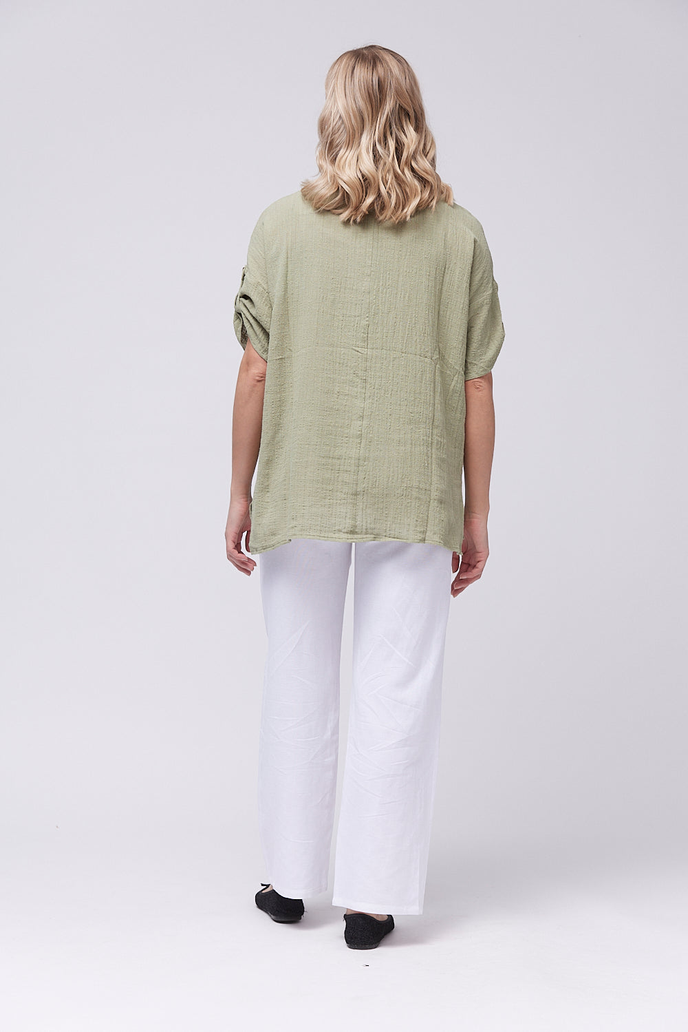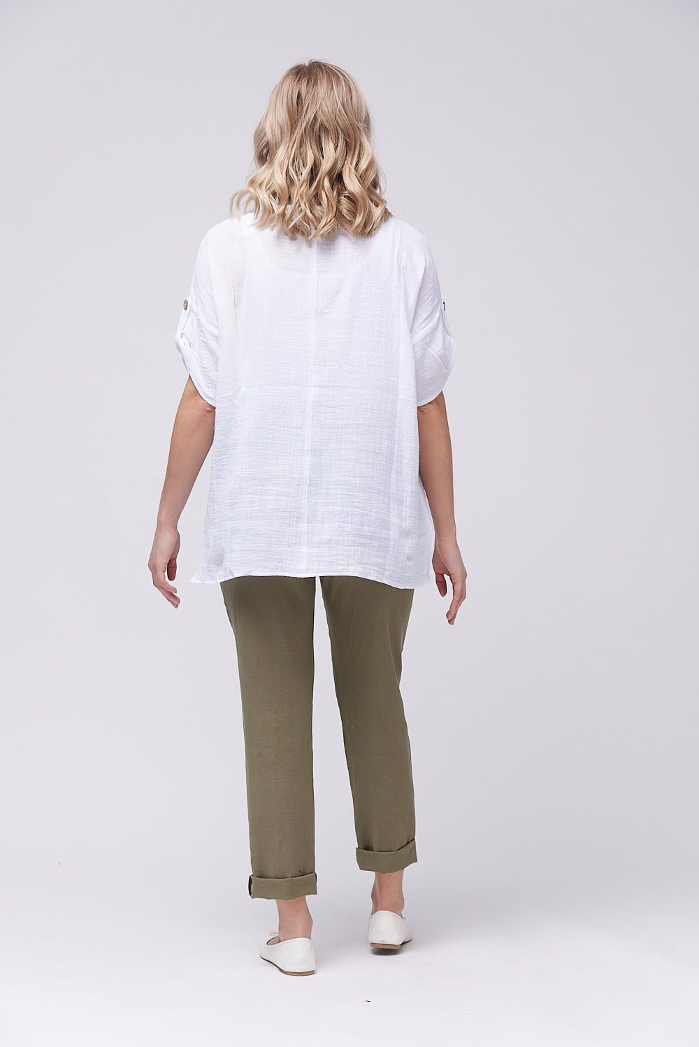 Introducing the boxy shaped top made with cotton fabric. The front pocket features a loop closure for added sophistication. The gathered sleeves with button tab and the side slits add a touch of elegance. Elevate your wardrobe with this exclusive design.