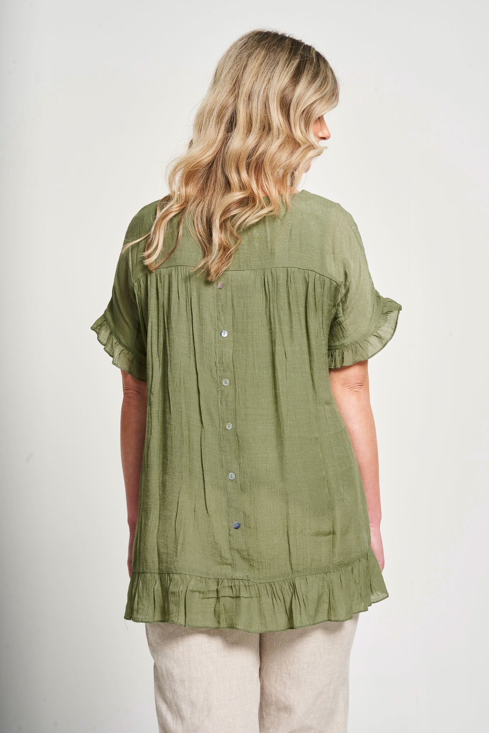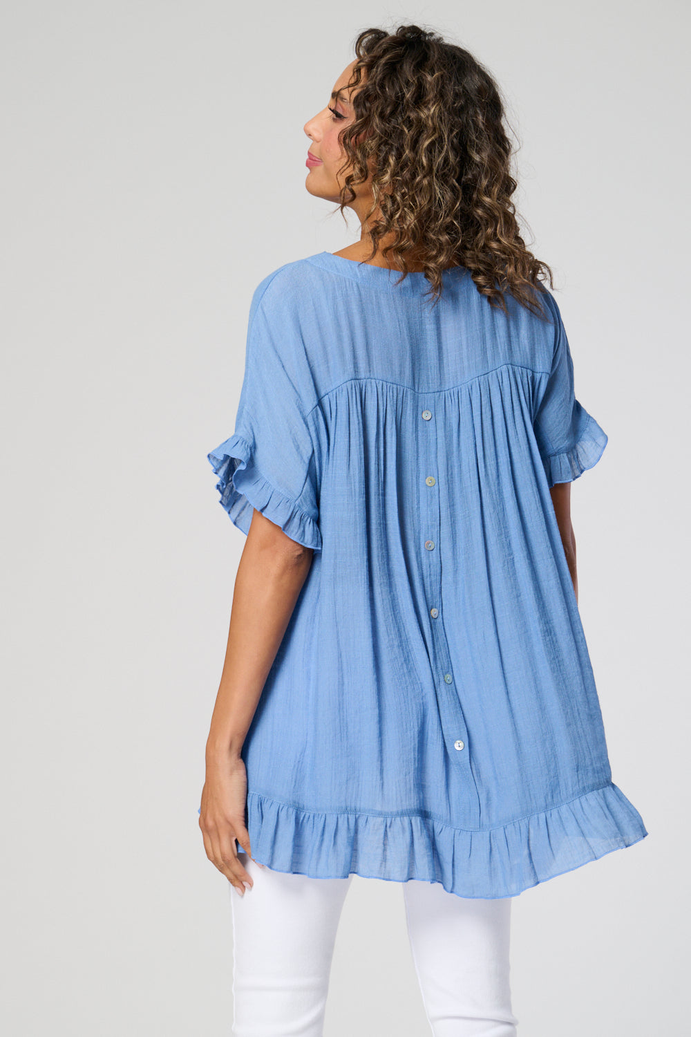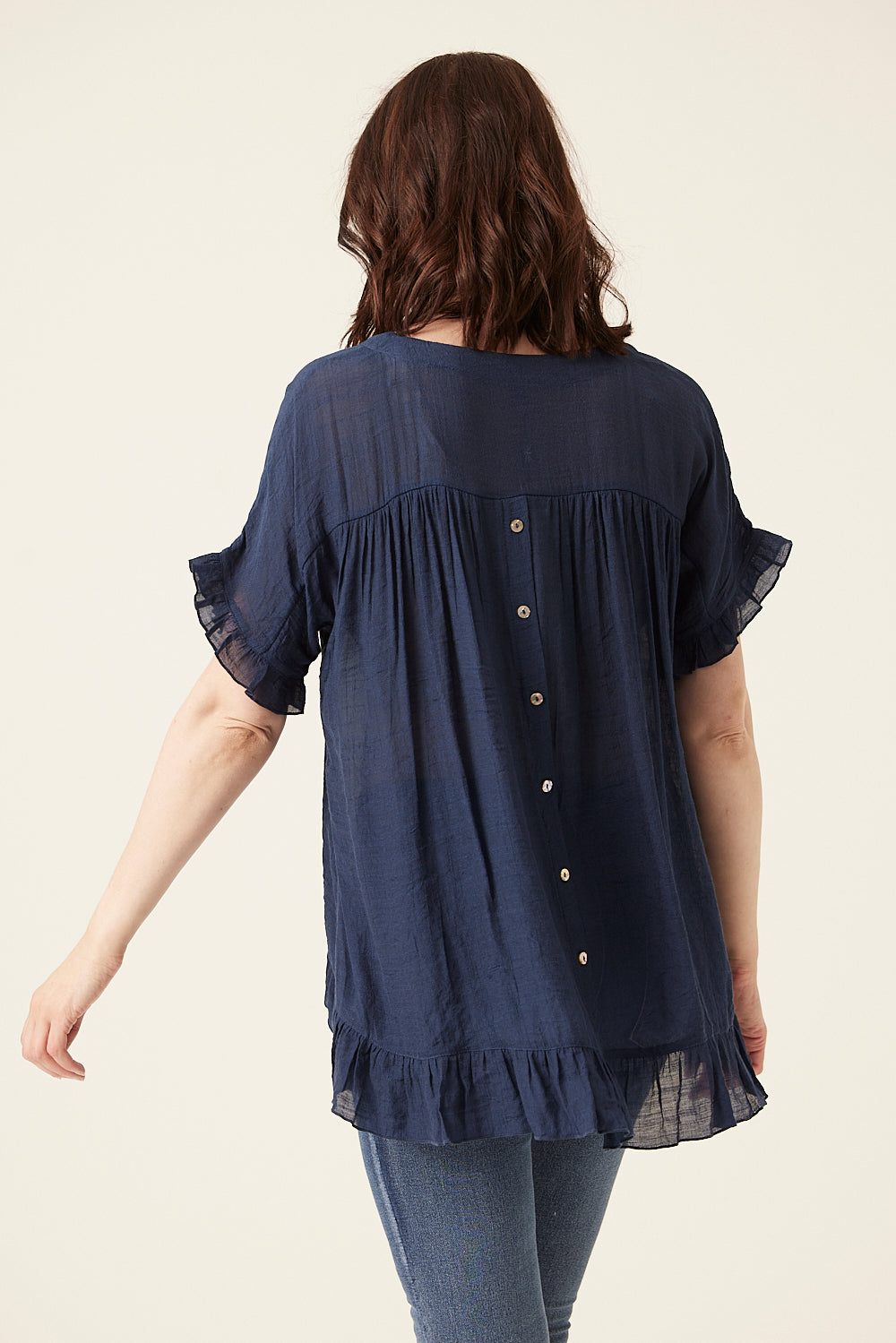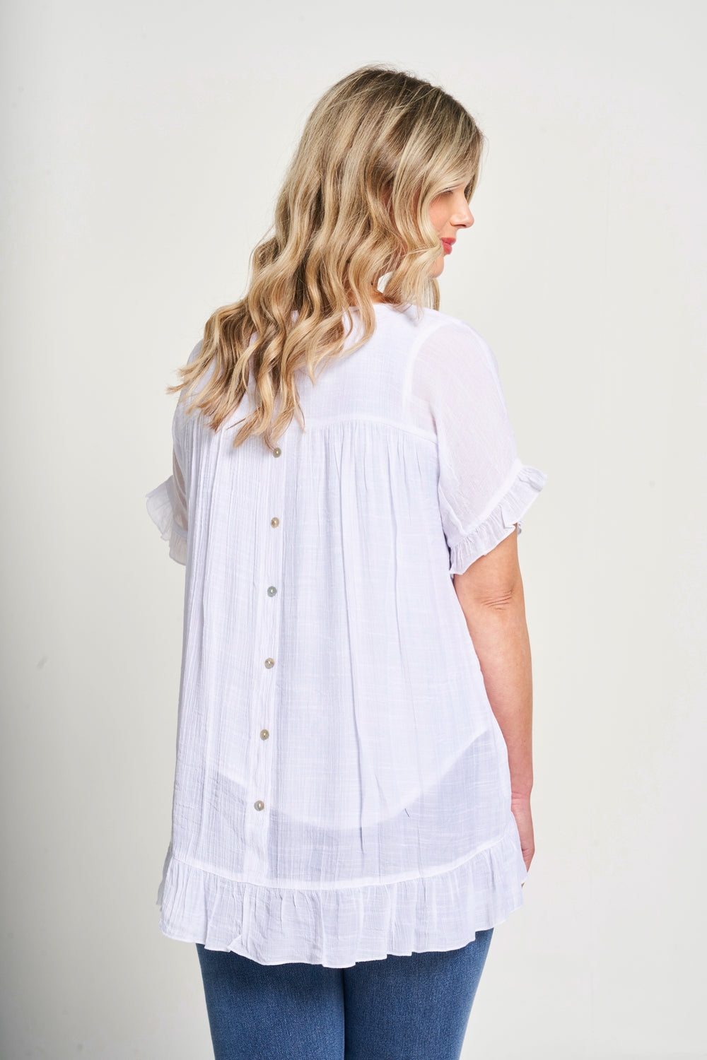Elevate your wardrobe with this top. Its double layer design and frilled hem add dimension and charm, while the button detail on the back and frilled short sleeves exude sophistication. The V-neck adds a touch of allure. Indulge in luxury and style with this exclusive piece.