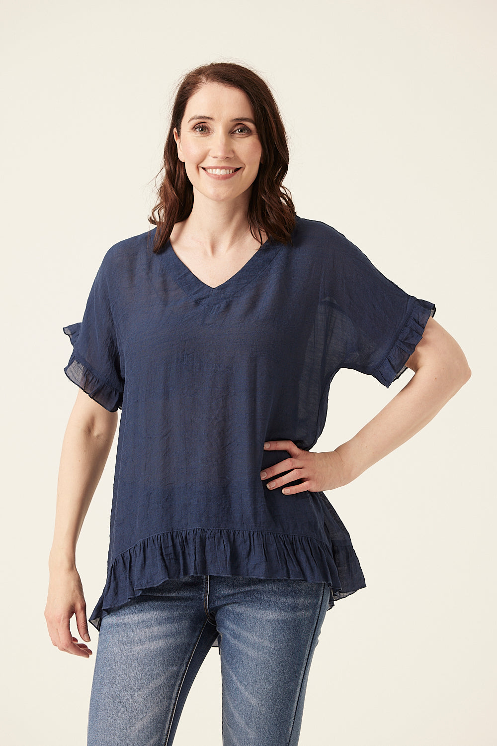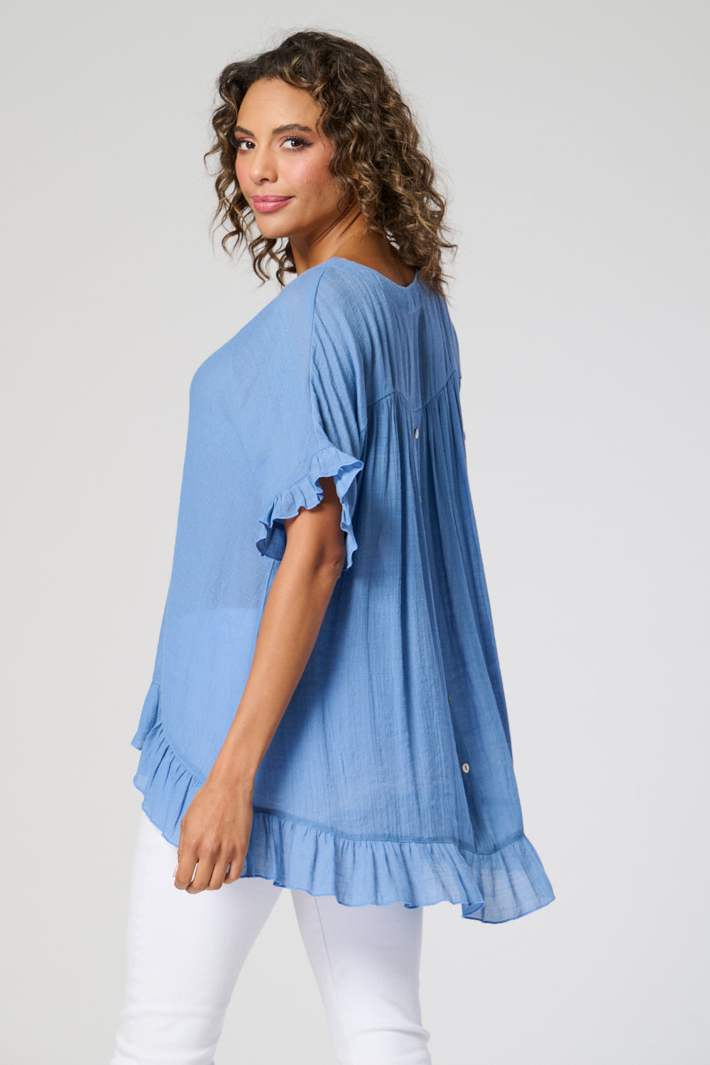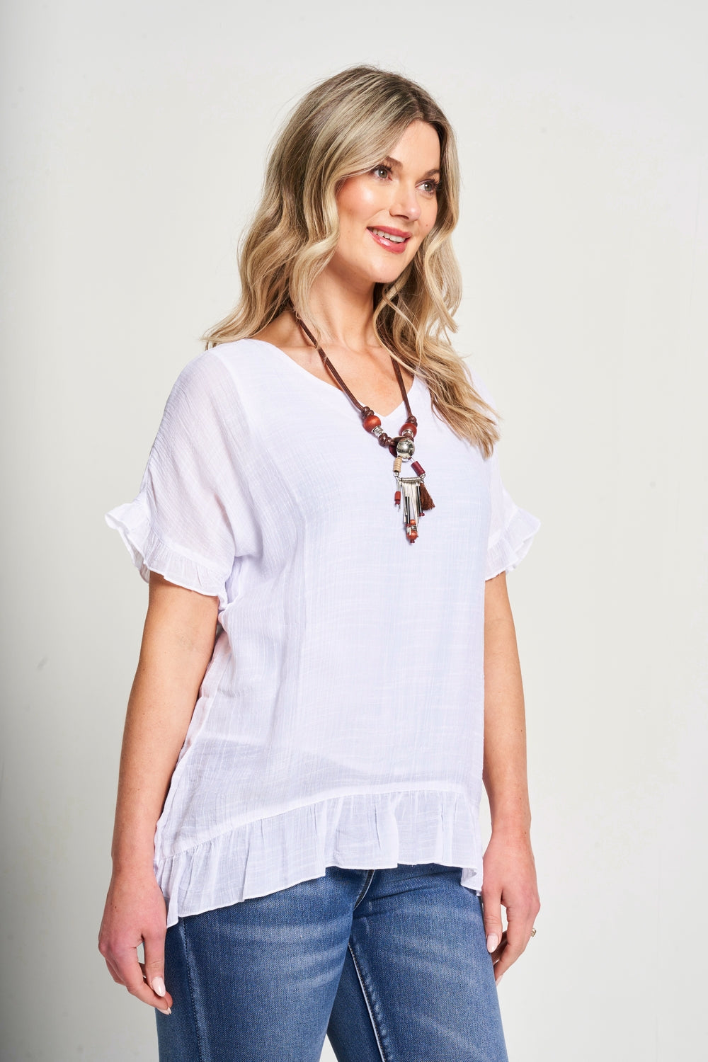 Elevate your wardrobe with this top. Its double layer design and frilled hem add dimension and charm, while the button detail on the back and frilled short sleeves exude sophistication. The V-neck adds a touch of allure. Indulge in luxury and style with this exclusive piece.