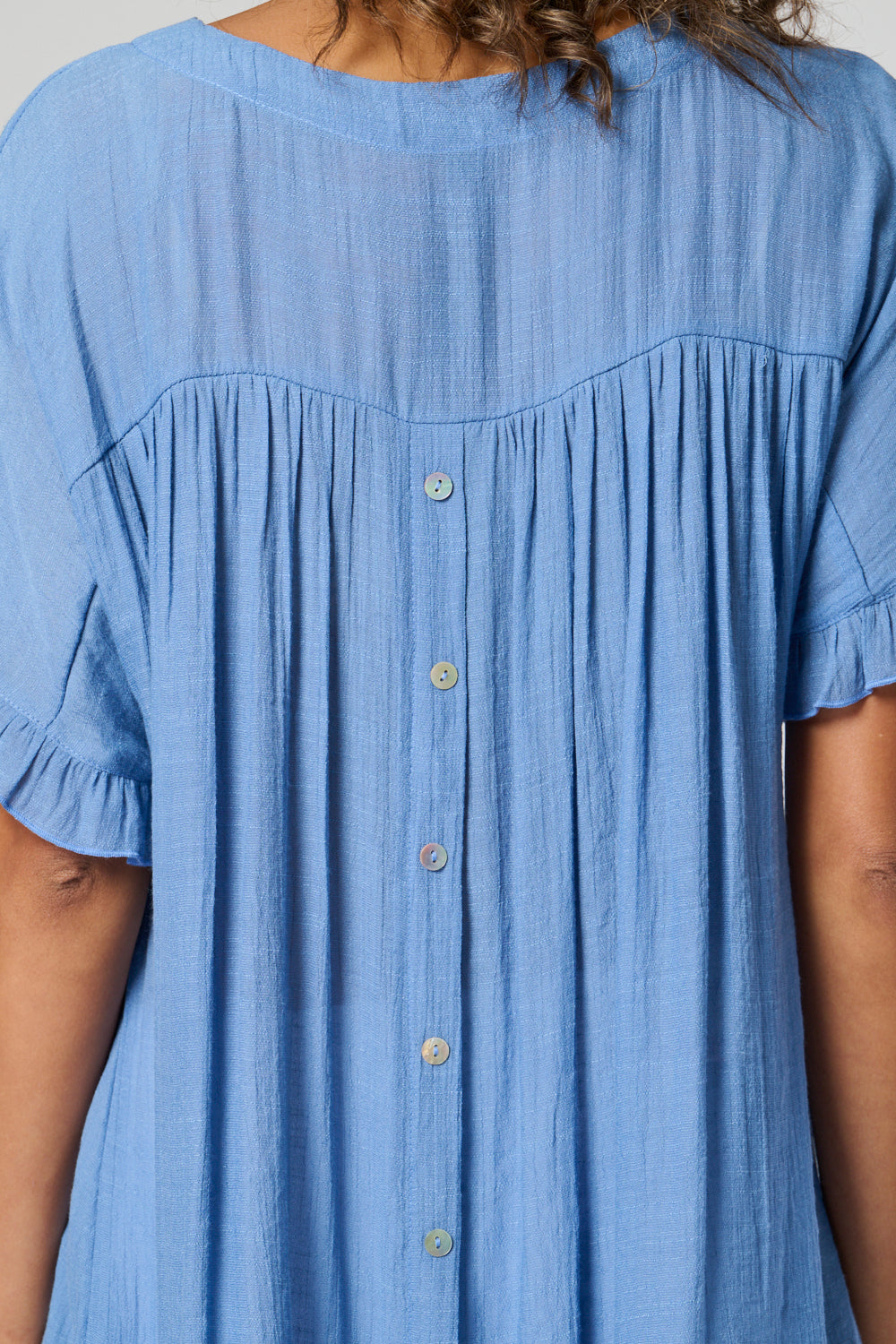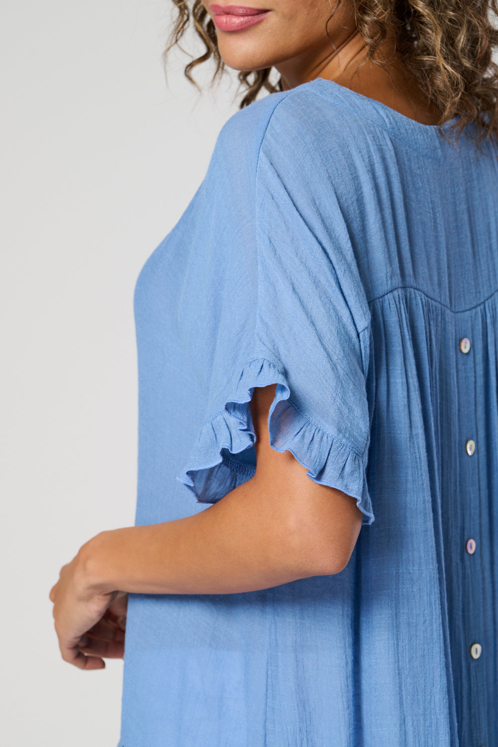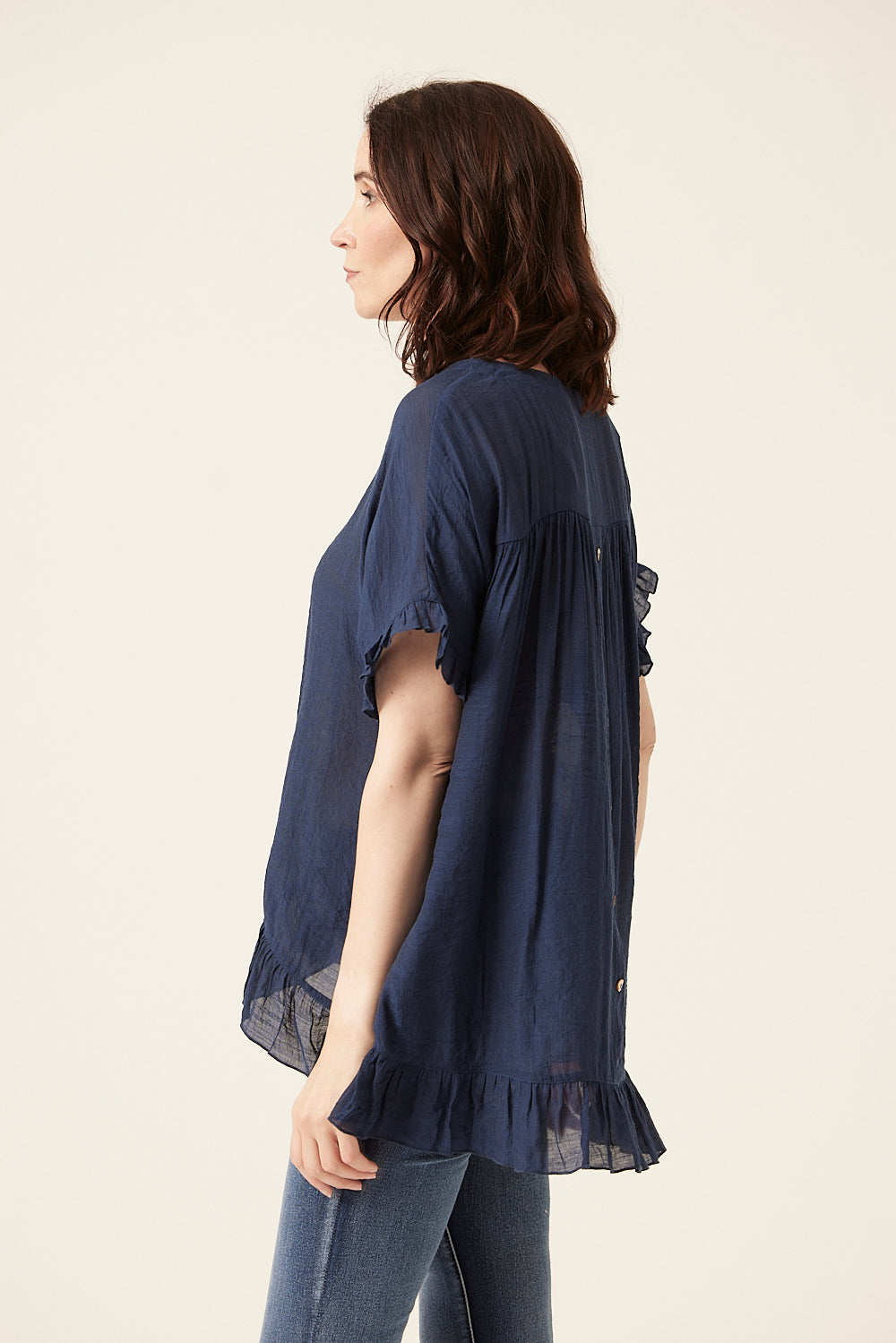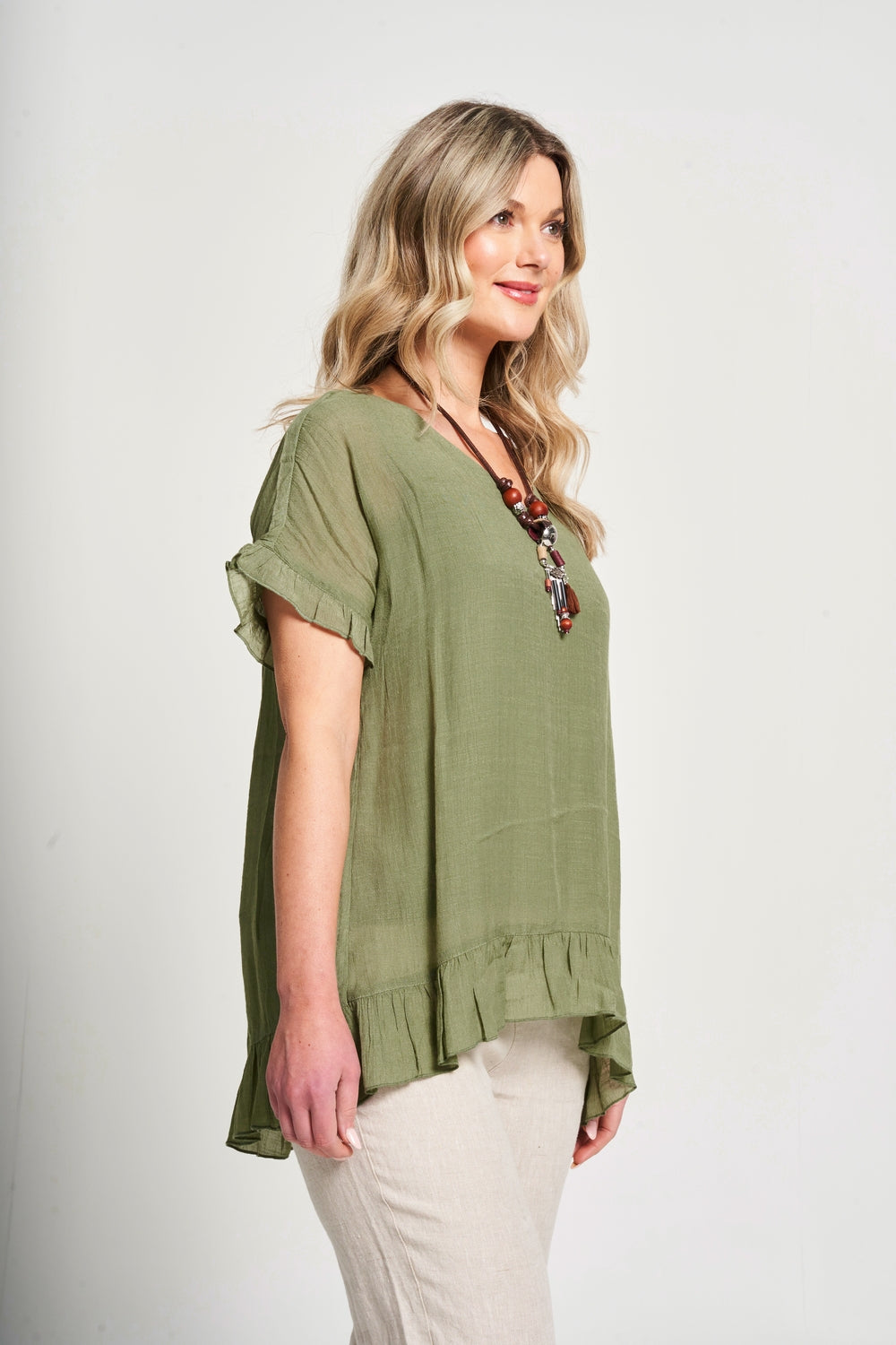 Elevate your wardrobe with this top. Its double layer design and frilled hem add dimension and charm, while the button detail on the back and frilled short sleeves exude sophistication. The V-neck adds a touch of allure. Indulge in luxury and style with this exclusive piece.