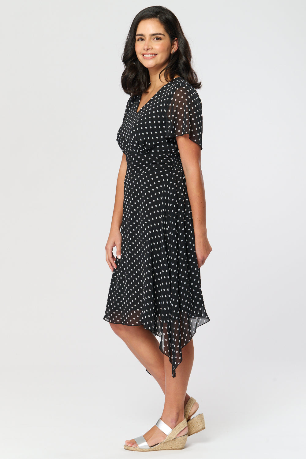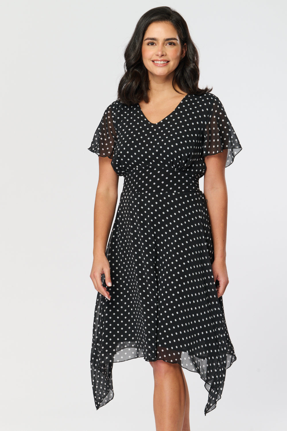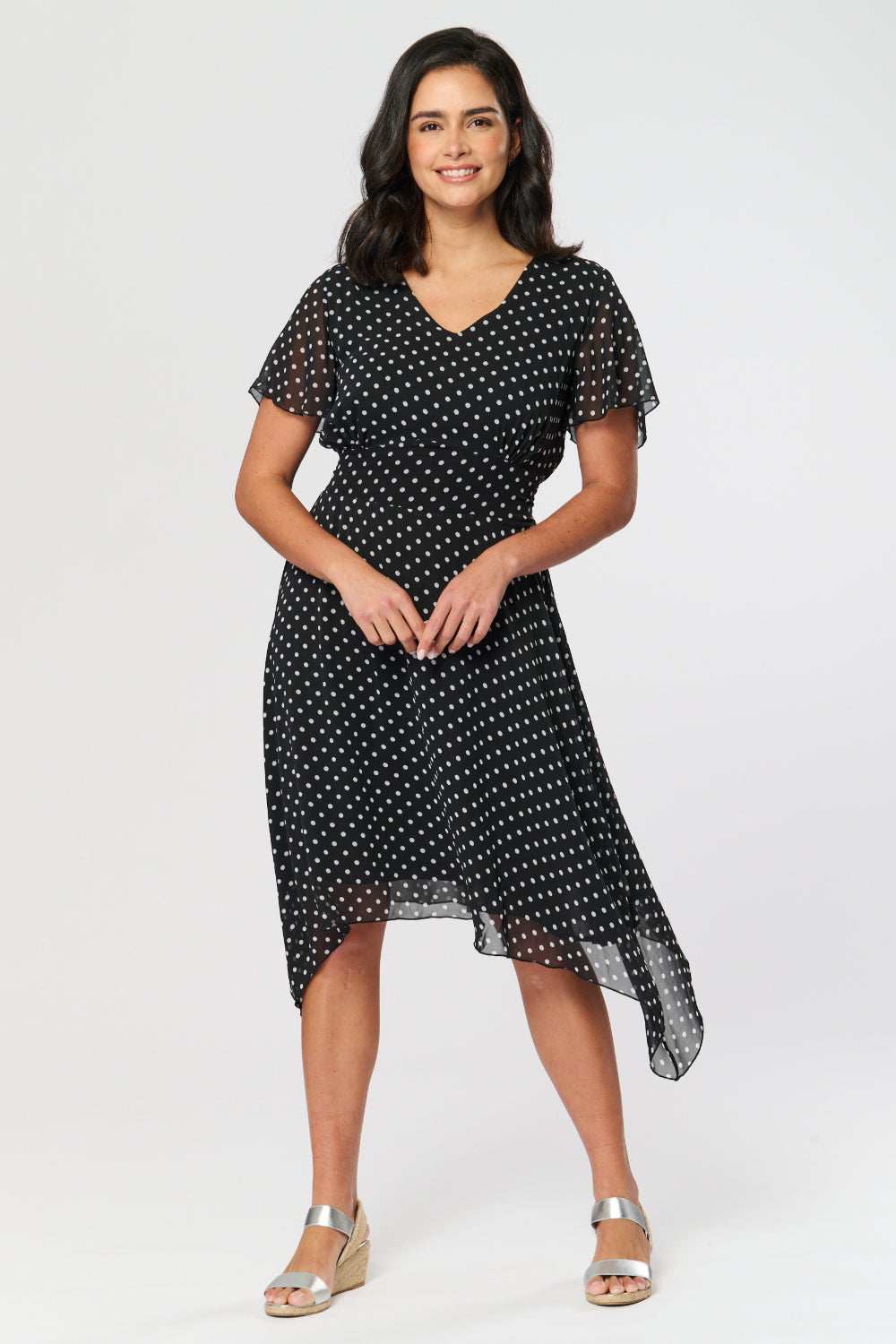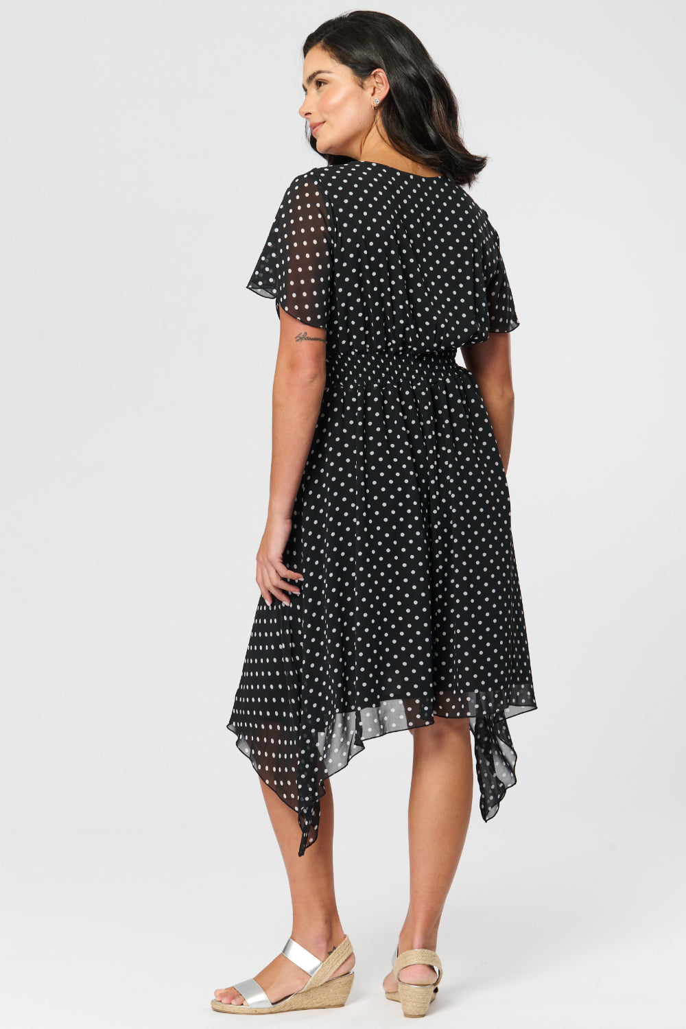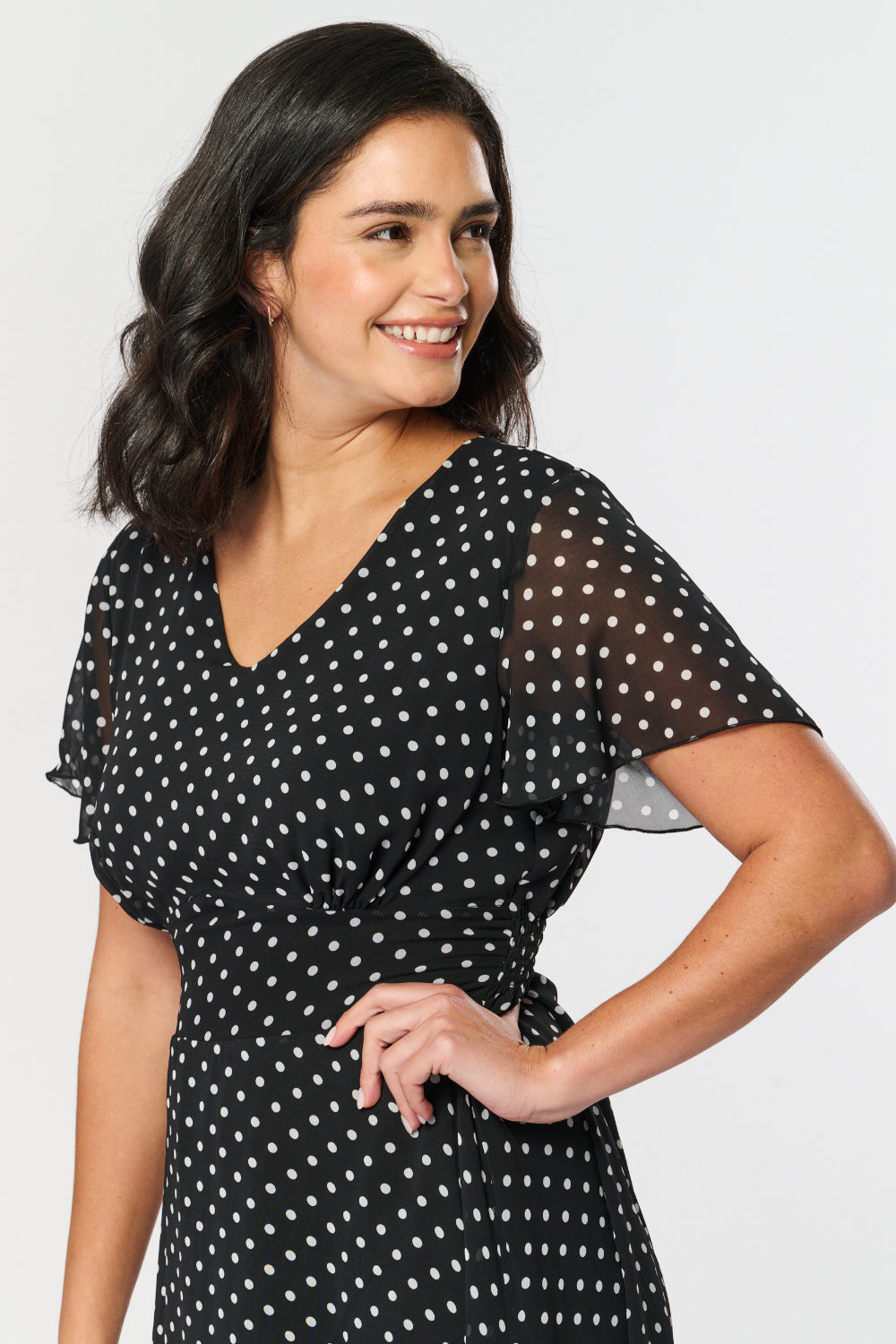 Dress elegantly for your next special occasion in the Polka Dots Evening Dress. This dress exudes glamour and sophistication with its flowy mesh, polka dot print, and flattering silhouette. The side dips hemline and relaxed, flutter sleeve only add to the overall charm. Additionally, this fully lined dress comes in a versatile colour, making it a timeless option for any event.