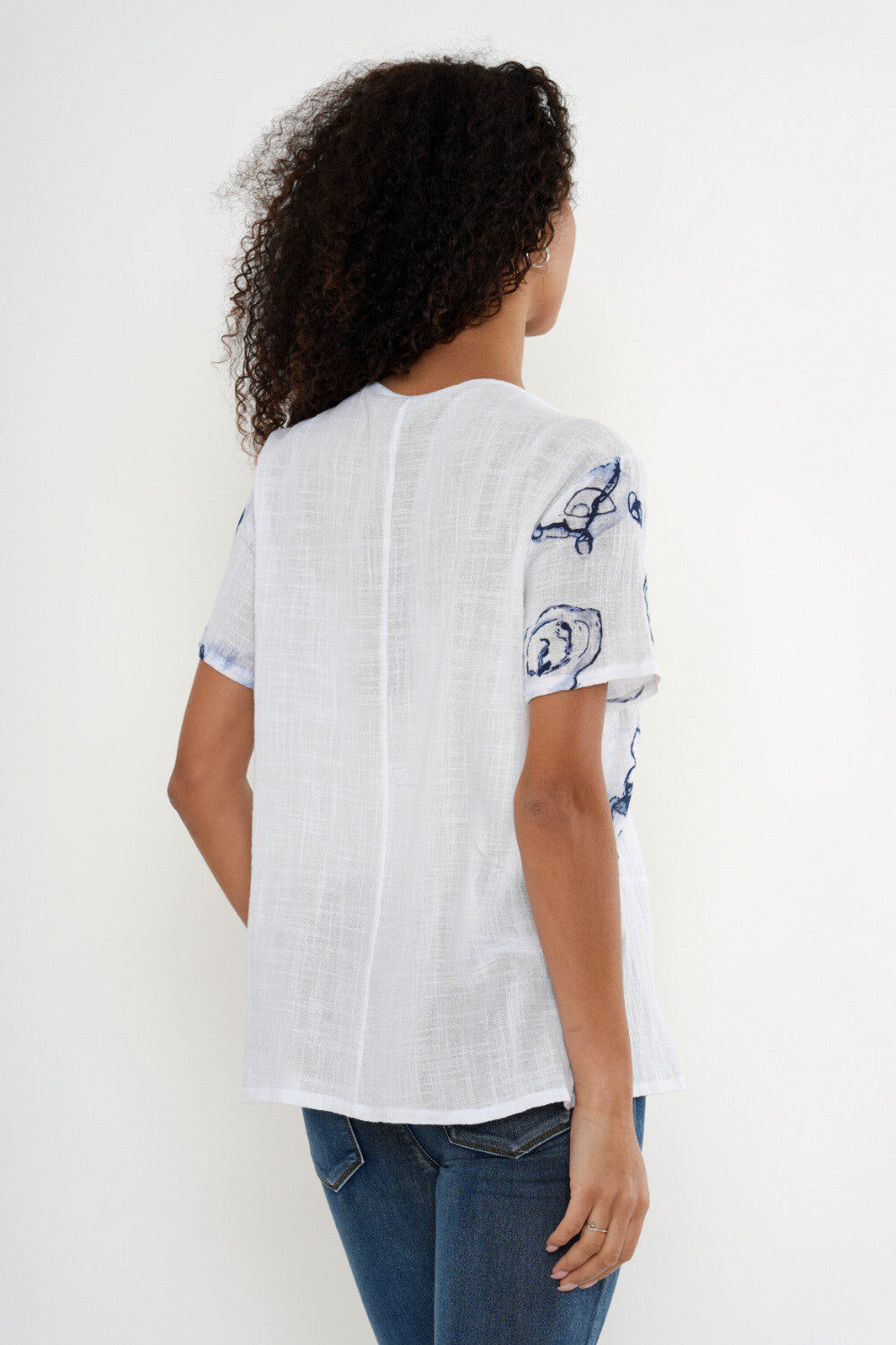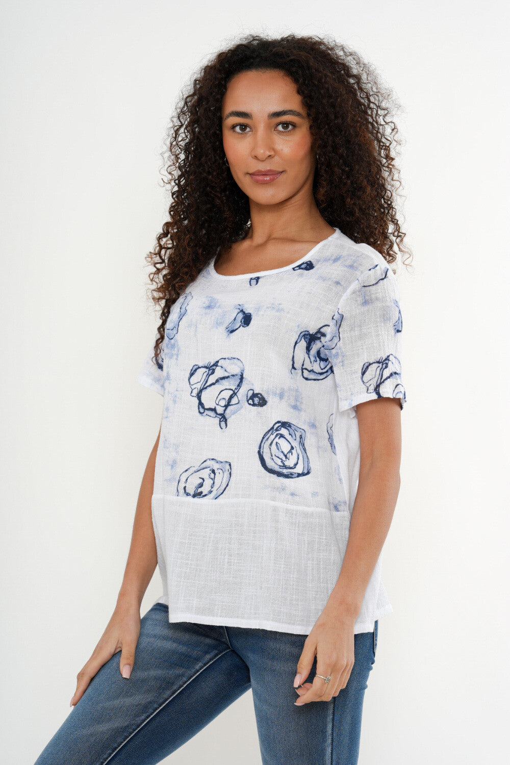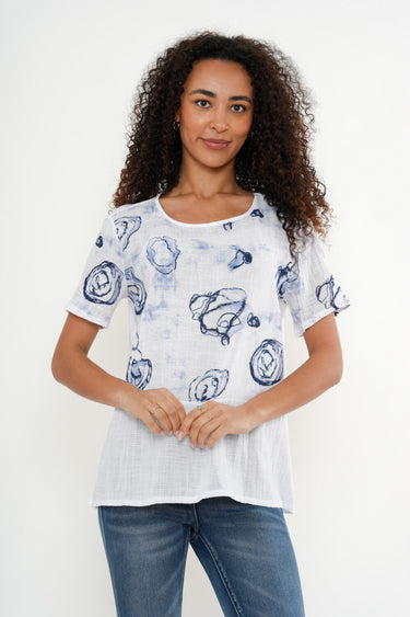 Fresh, lightweight, and effortlessly chic, this printed short sleeve top is a versatile wardrobe staple. Crafted from a breathable cotton fabric, it features a relaxed silhouette with a classic round neckline and an easy, flattering fit. The soft white base is accented with an artistic blue abstract print, adding a modern, coastal-inspired feel.