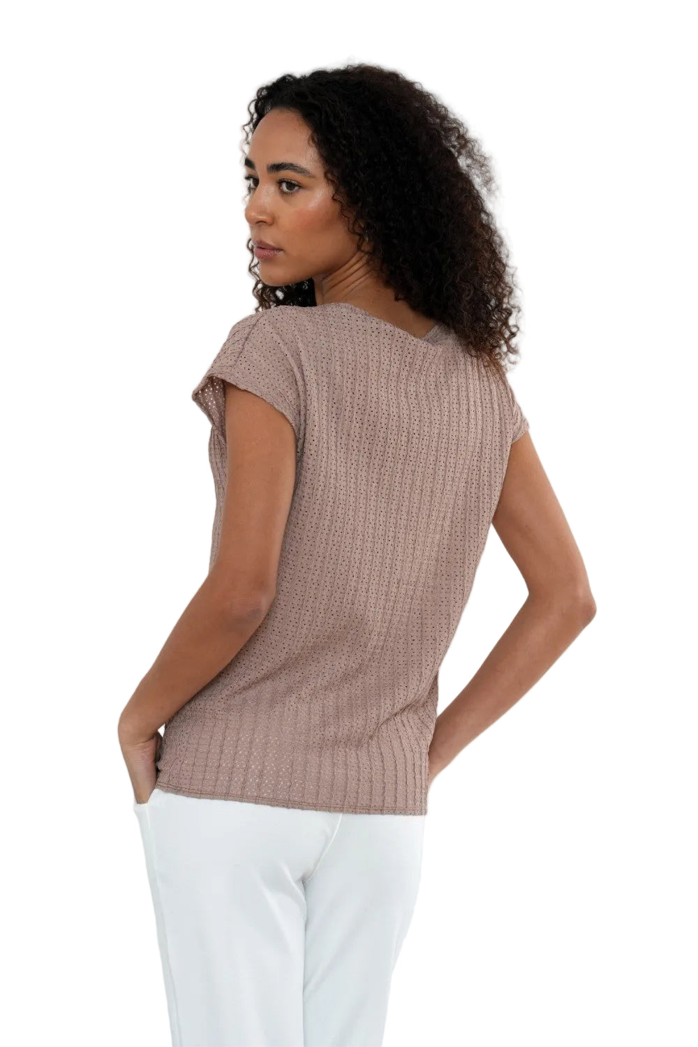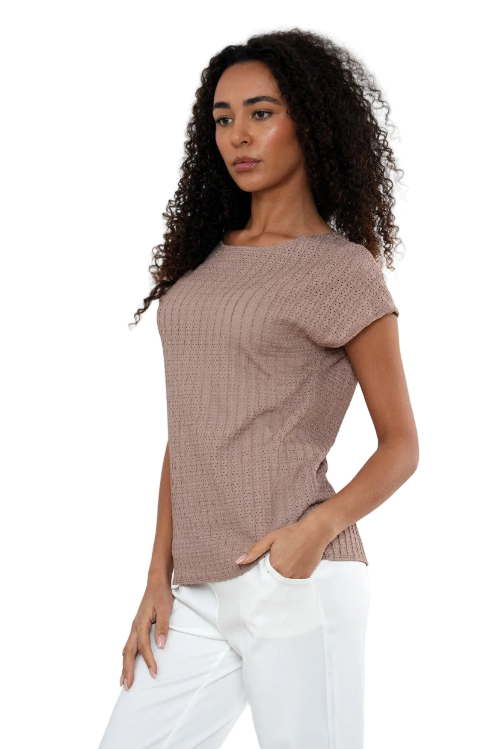 Refresh your everyday essentials with this stylish textured short sleeve top in a soft mocha brown shade. Designed with a subtle vertical ribbed texture and delicate detailing throughout, this top offers an elevated take on a classic silhouette.