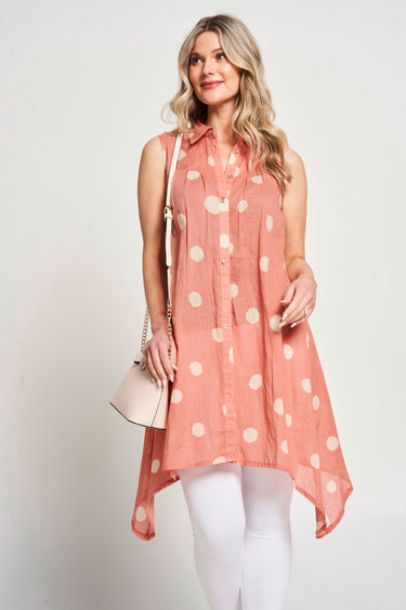 Featuring a dot print, this sleeveless button-up shirt has a drop-corner hemline and a collared neck for a chic summer look. It pairs perfectly with white jeans or leggings and your favourite sandals, making it a stylish and comfortable choice for hot summer days.