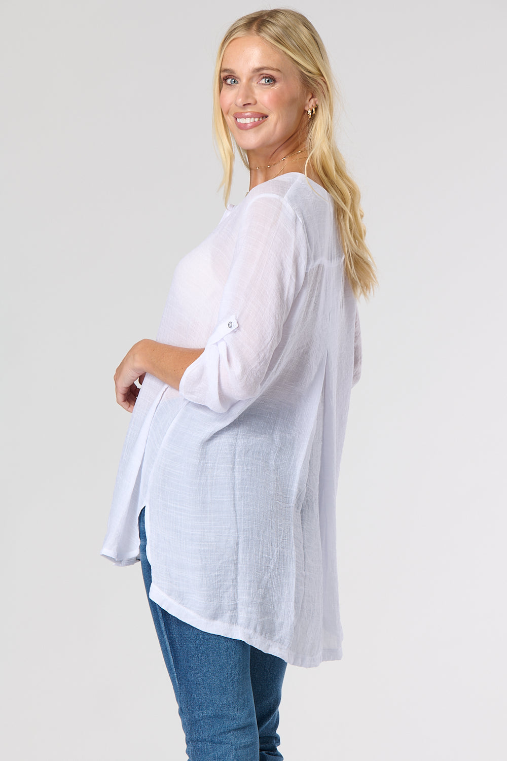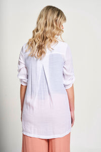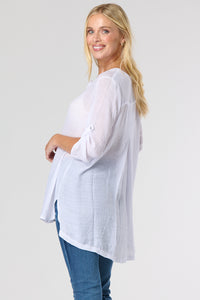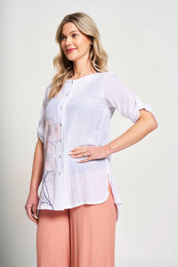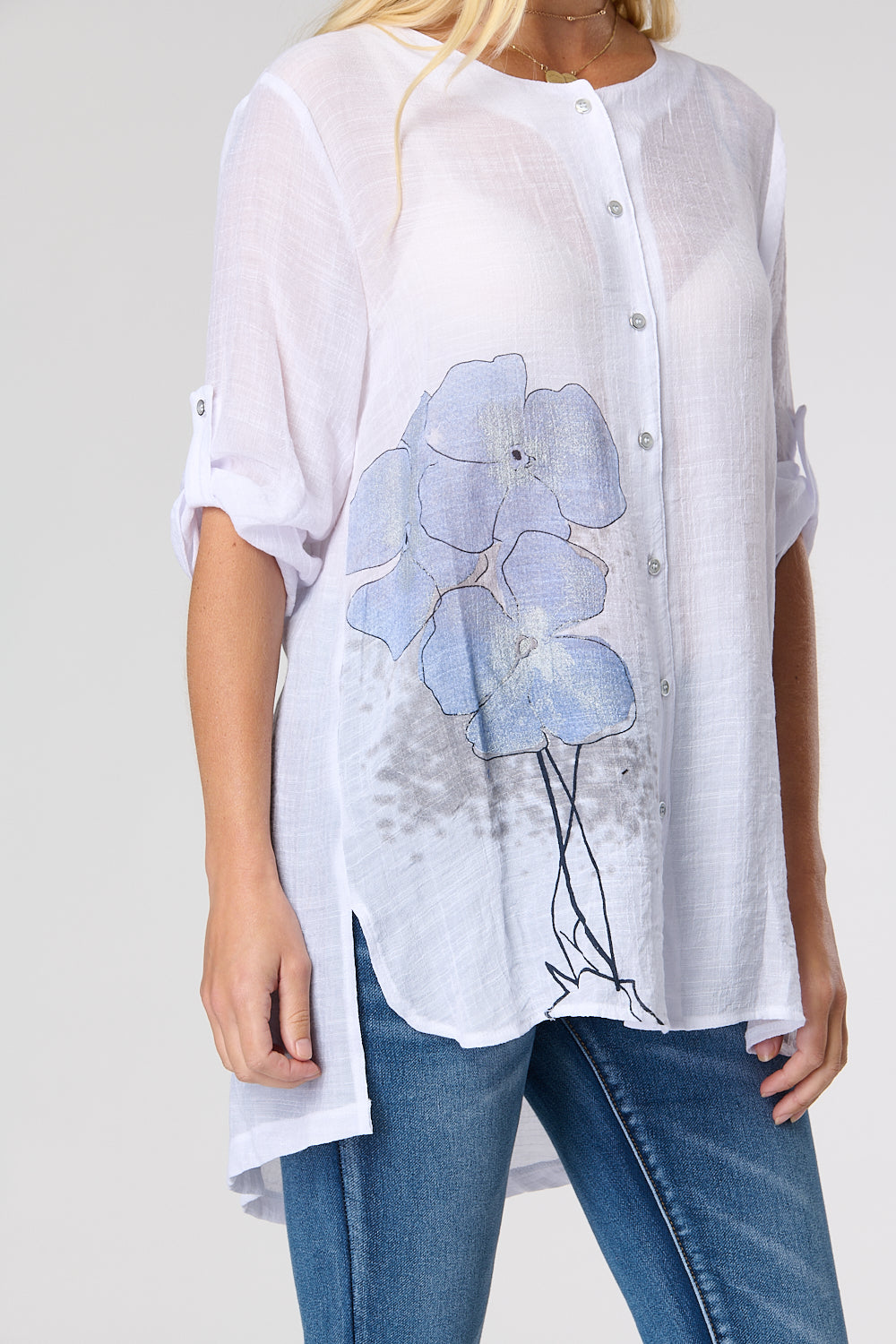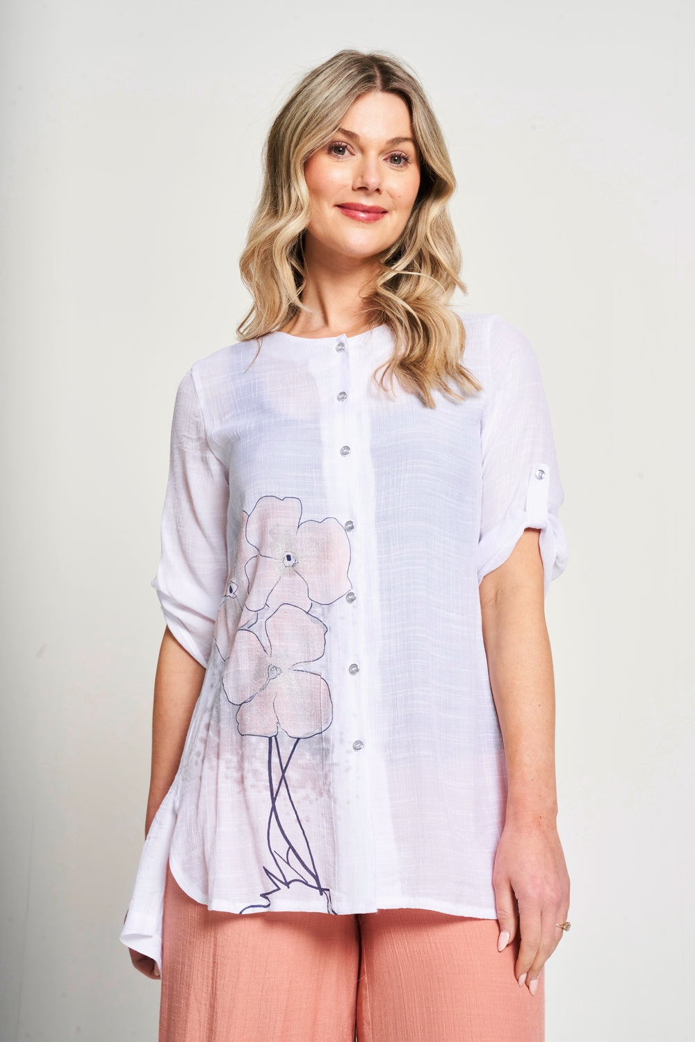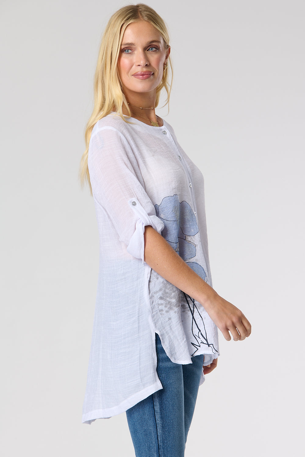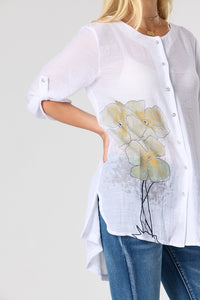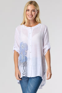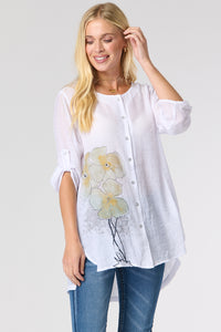 A button through tunic shirt featuring a high-low hemline and front flower motif. Made from a light linen look fabric, with 3/4 button tab sleeves and a loose fit for ultimate comfort. Elevate your wardrobe with this versatile and stylish piece.