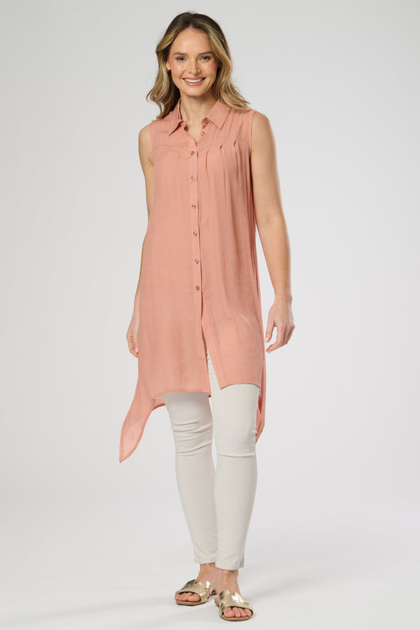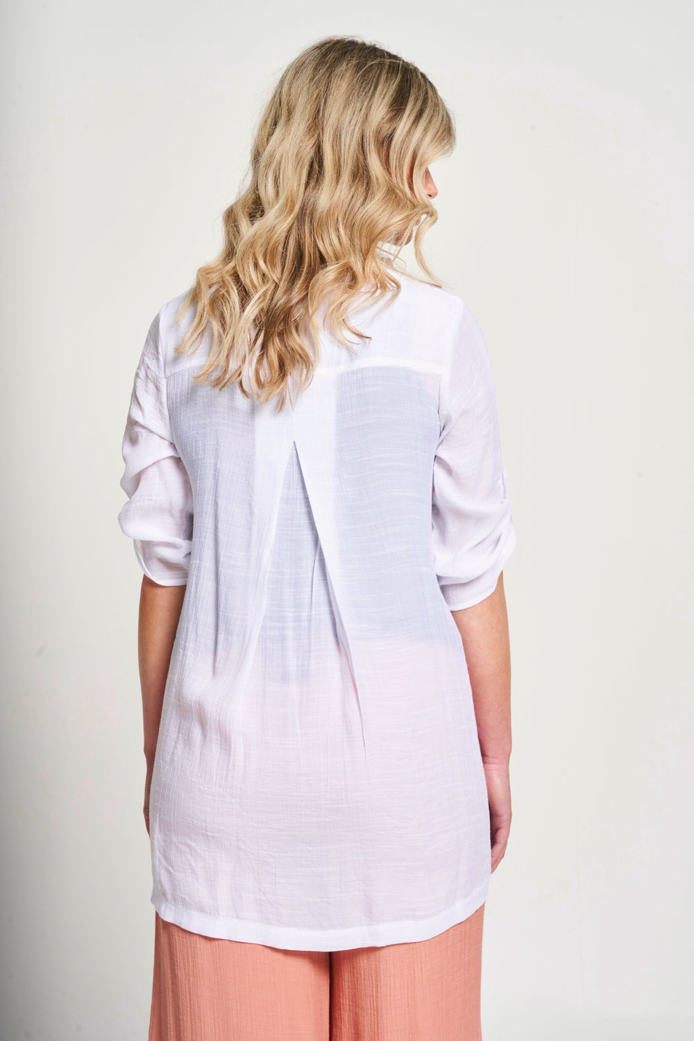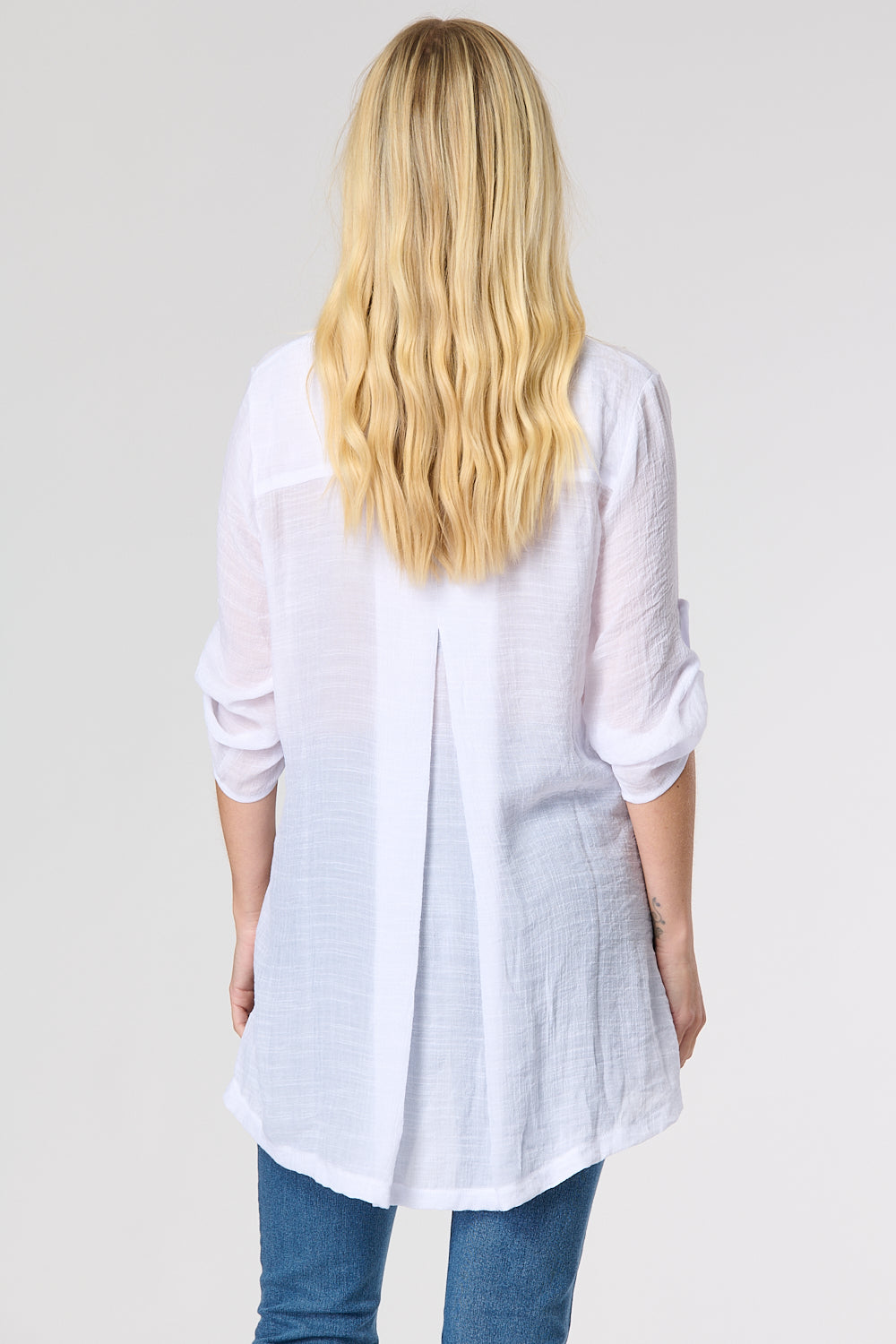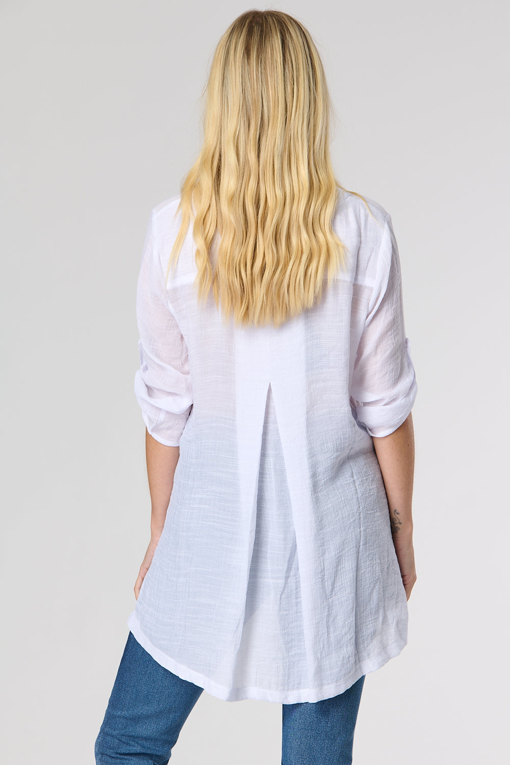 A button through tunic shirt featuring a high-low hemline and front flower motif. Made from a light linen look fabric, with 3/4 button tab sleeves and a loose fit for ultimate comfort. Elevate your wardrobe with this versatile and stylish piece.