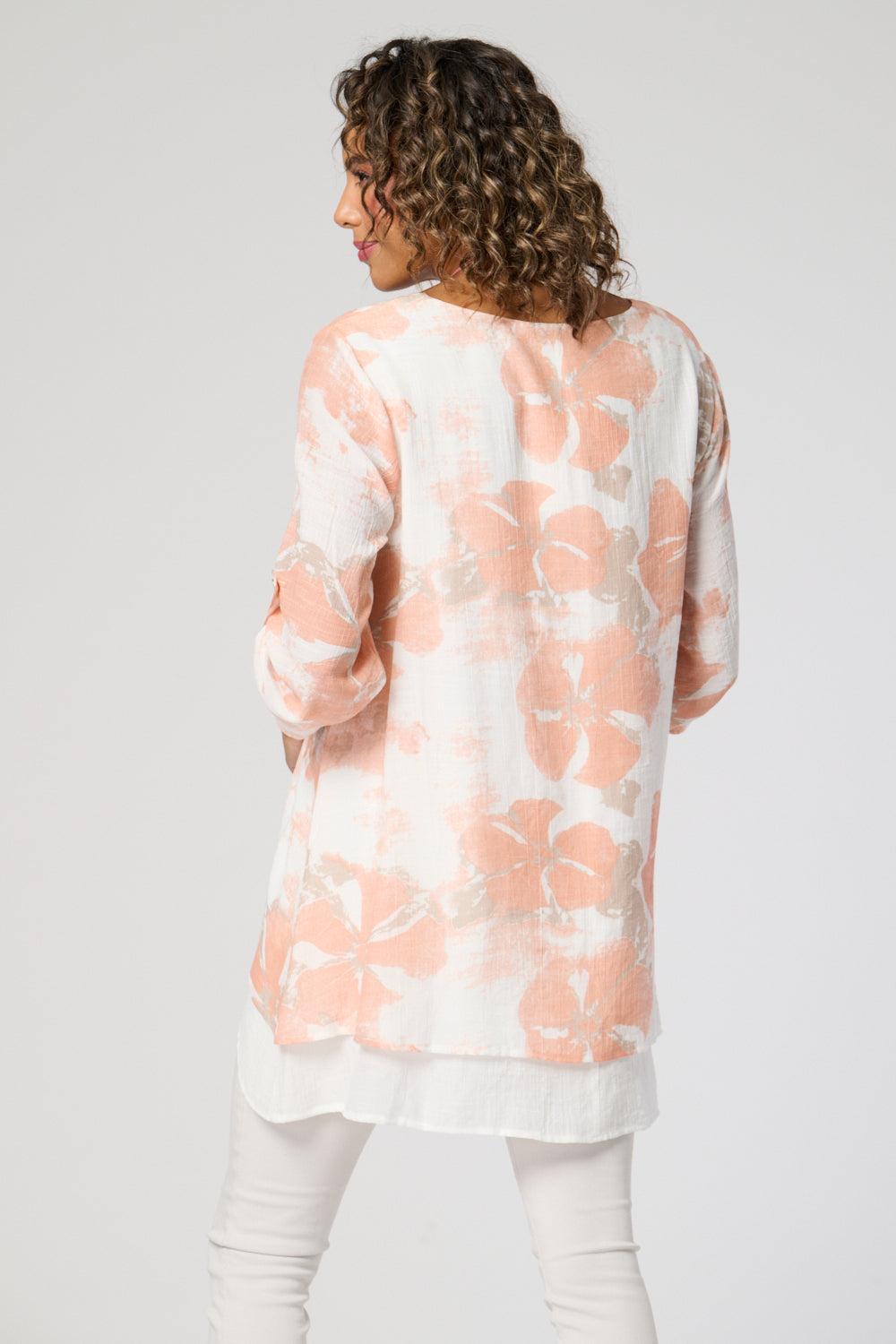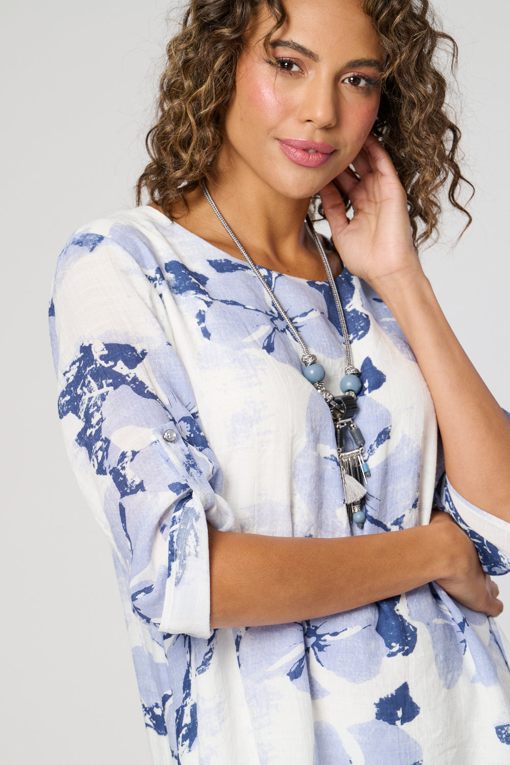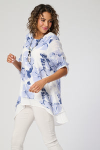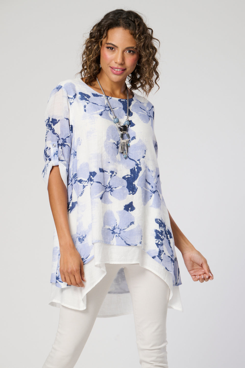 A sophisticated double layer top with flattering ruched sleeves and a high-low hemline for added style. Complete the look with the included matching necklace*. Elevate your wardrobe with this must-have piece.