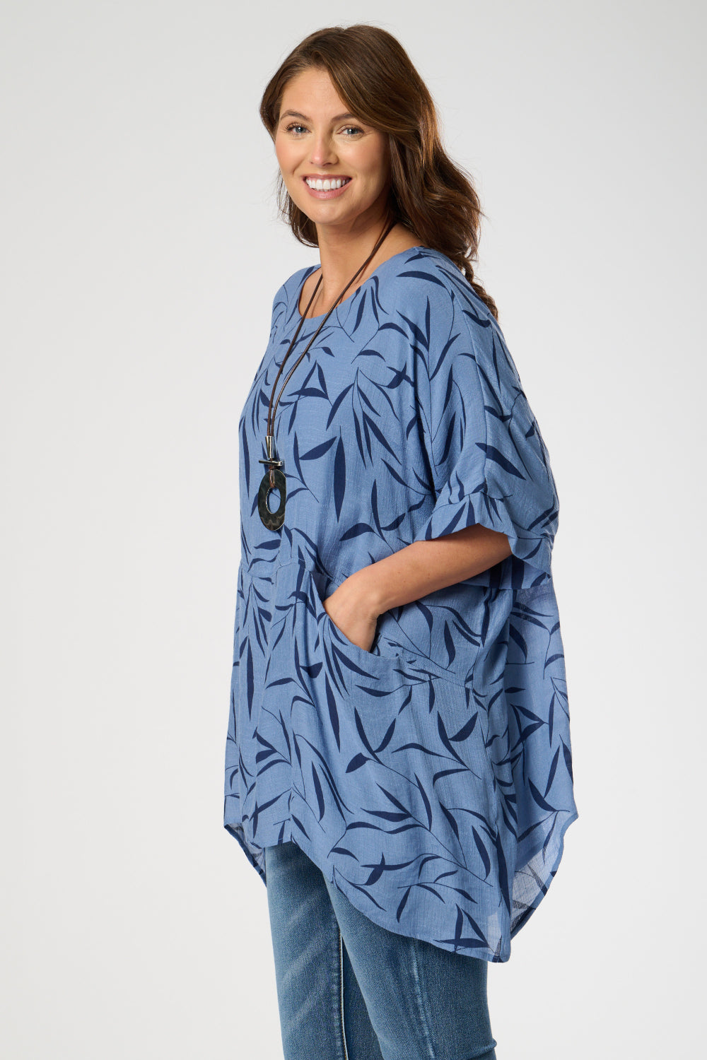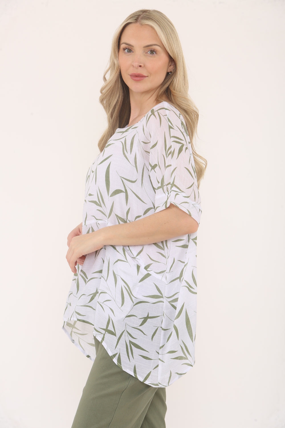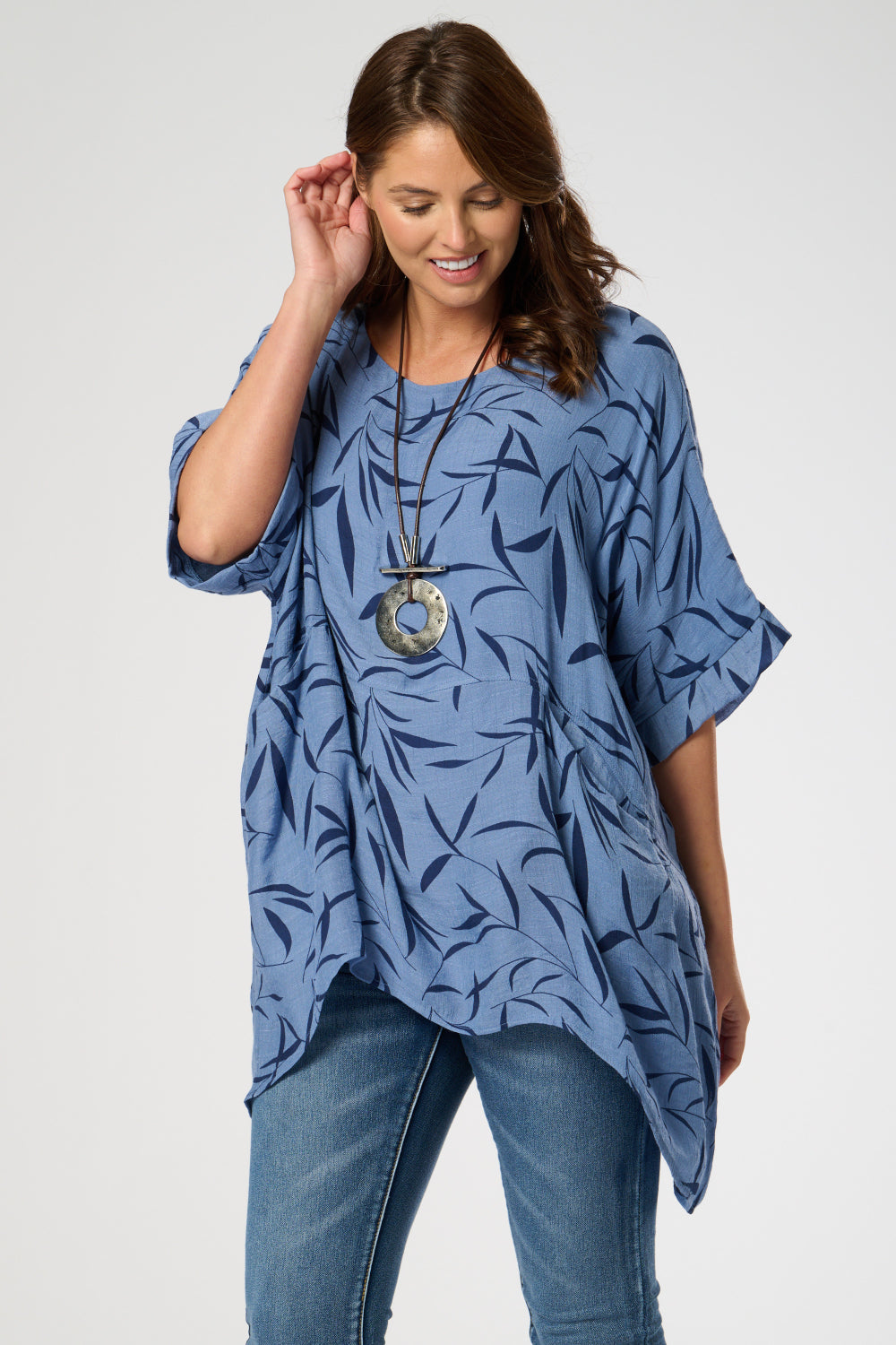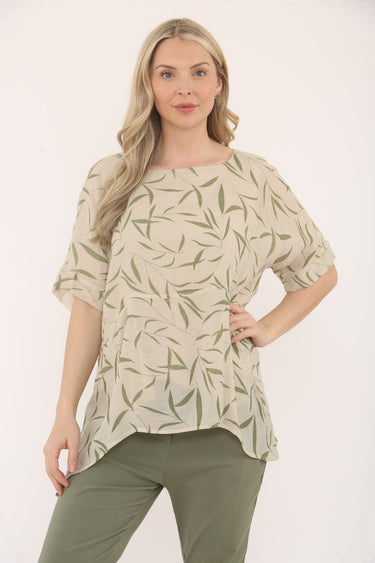 Refresh your everyday wardrobe with this effortlessly stylish leaf print top. Designed with a relaxed, flattering silhouette, this lightweight top features a soft white, stone or denim base accented with an all-over olive leaf pattern for a fresh, natural look. The round neckline and short sleeves offer easy comfort, while the gently draped hem creates a flattering fit for all body shapes. Finished with functional side pockets, this top blends practicality with laid-back elegance.