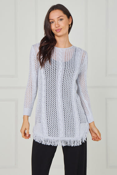 Elevate your wardrobe with this stunning long metallic knit tunic top, designed to bring effortless elegance to any outfit. Crafted from a lightweight, shimmering open-knit fabric, this top drapes beautifully and adds a touch of sparkle without feeling heavy. The chic tassel hem gives it a stylish, modern finish that moves gracefully with every step.