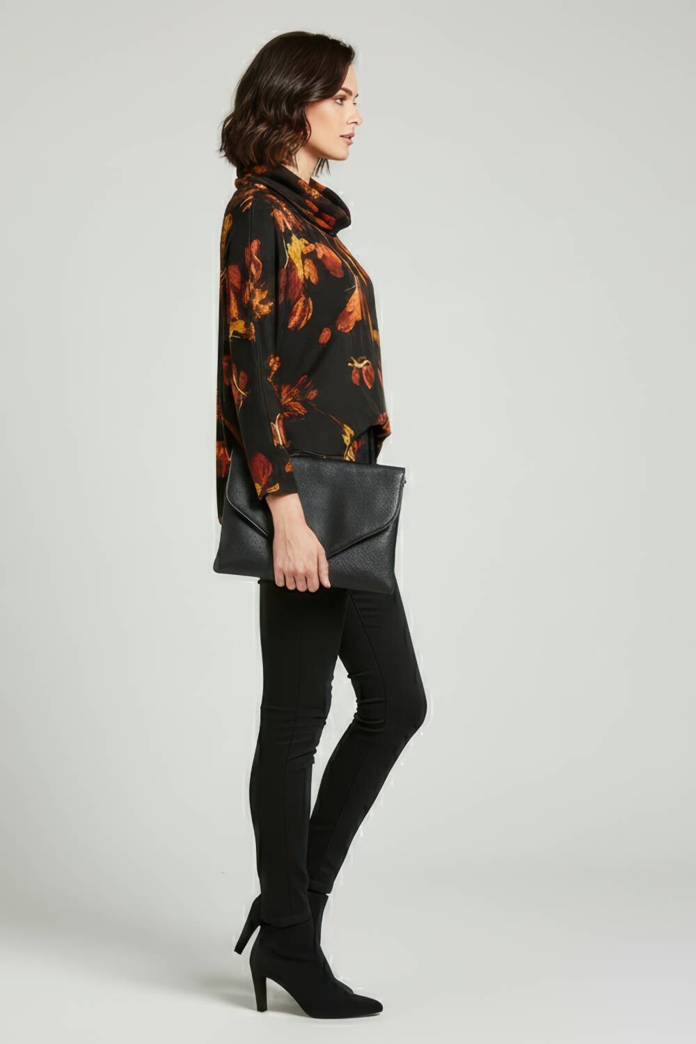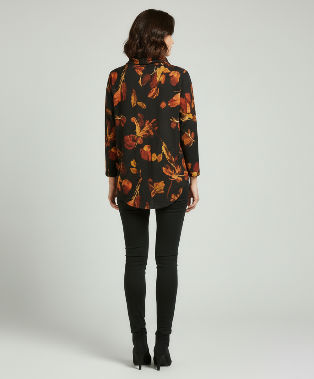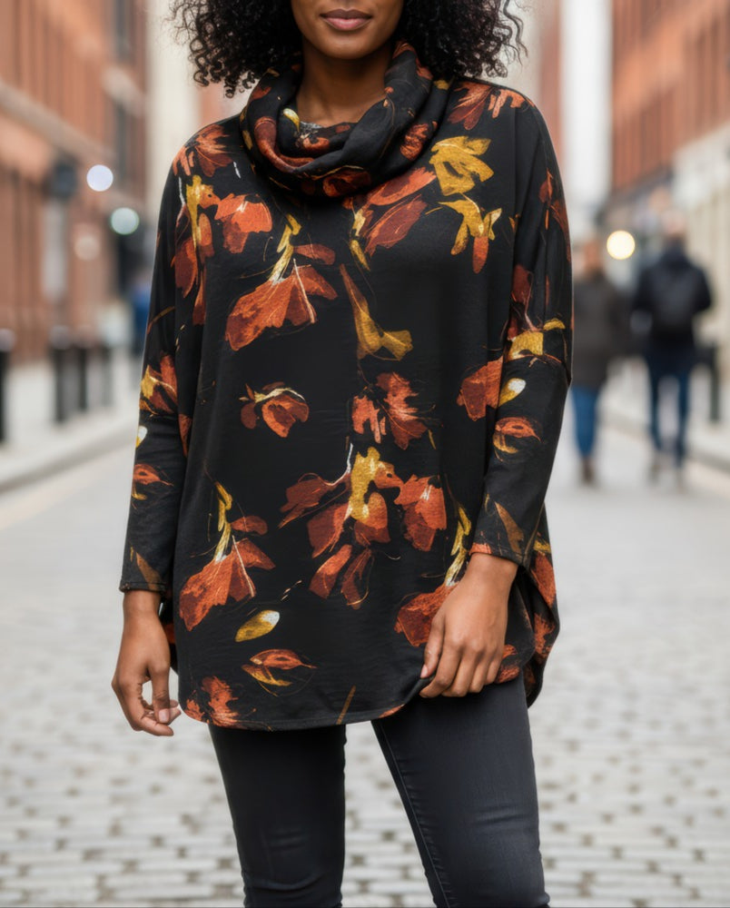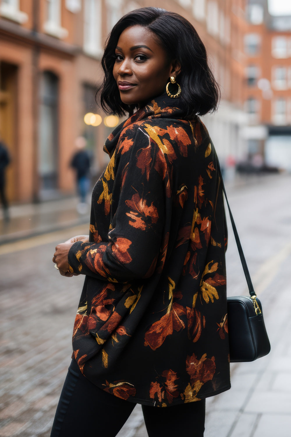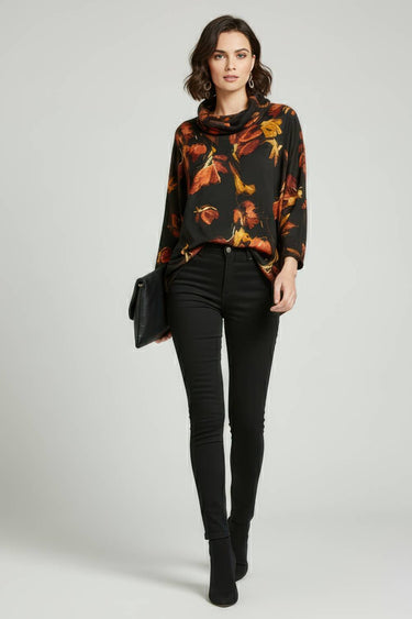 Elevate your everyday style with this Autumn Floral Cowl-Neck Top. Crafted from a soft touch fabric, this relaxed-fit top features a rich black base adorned with warm, painterly floral prints in golden, amber, and rust hues. The soft draped cowl neckline adds an elegant touch, while the three-quarter sleeves keep it versatile for any season. Perfect for pairing with tailored pants or sleek denim, this blouse seamlessly transitions from office chic to evening out.