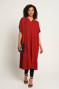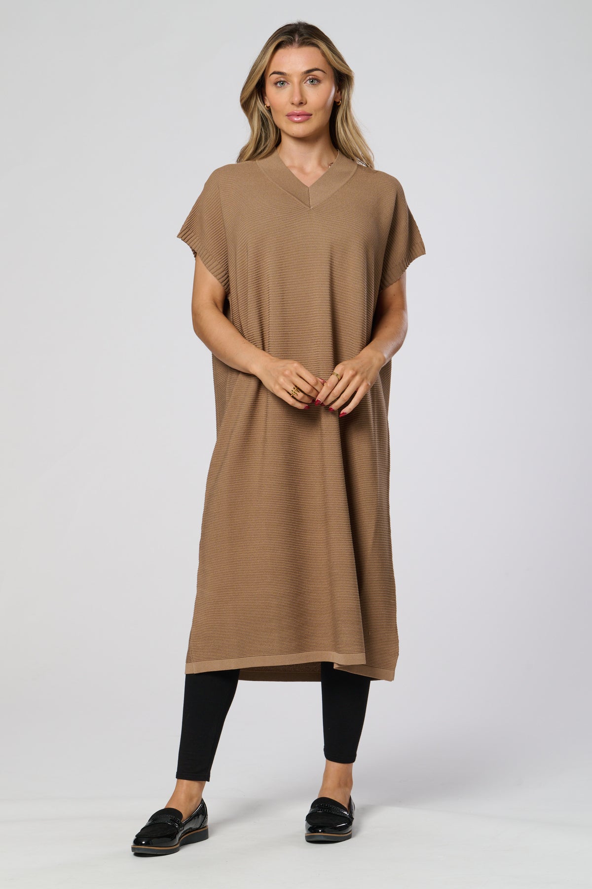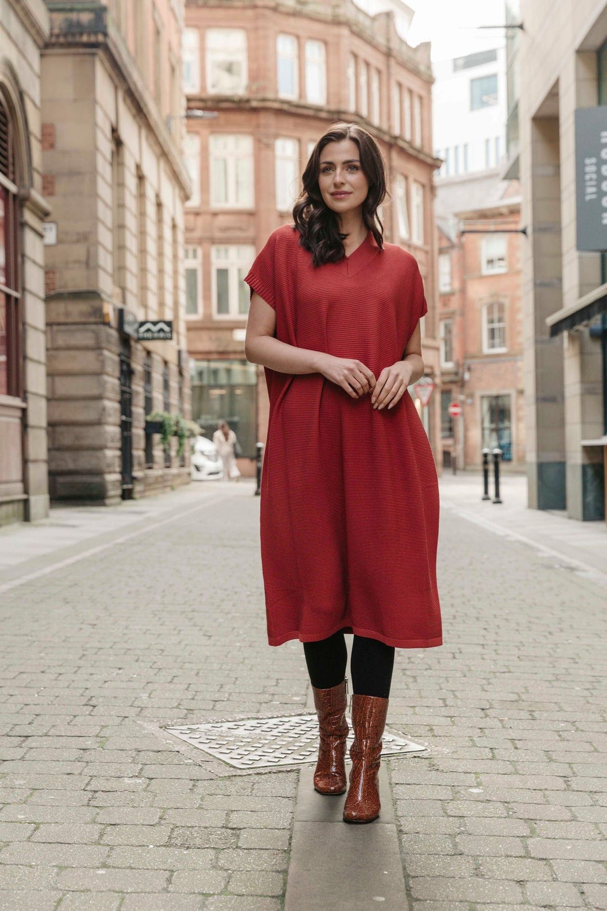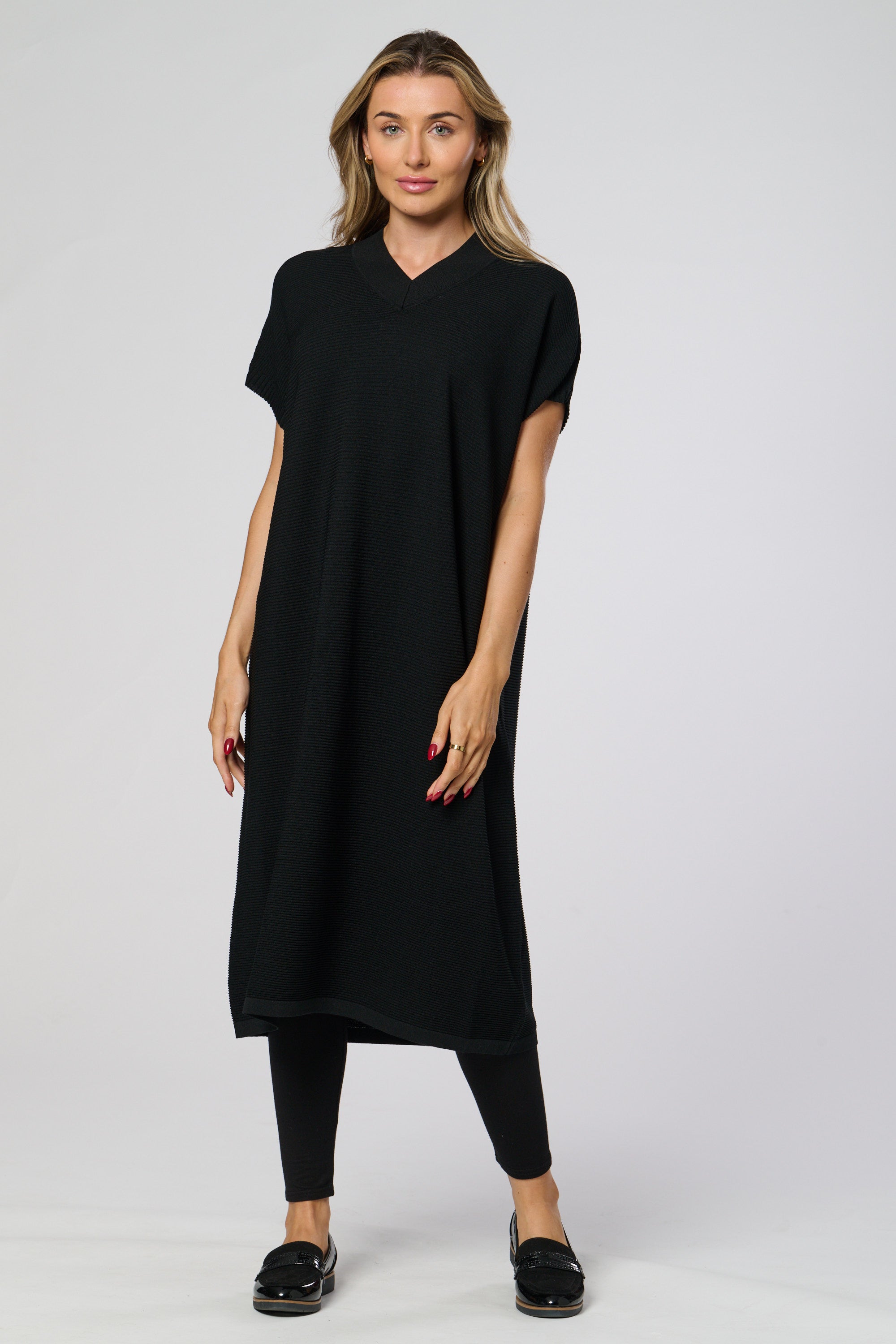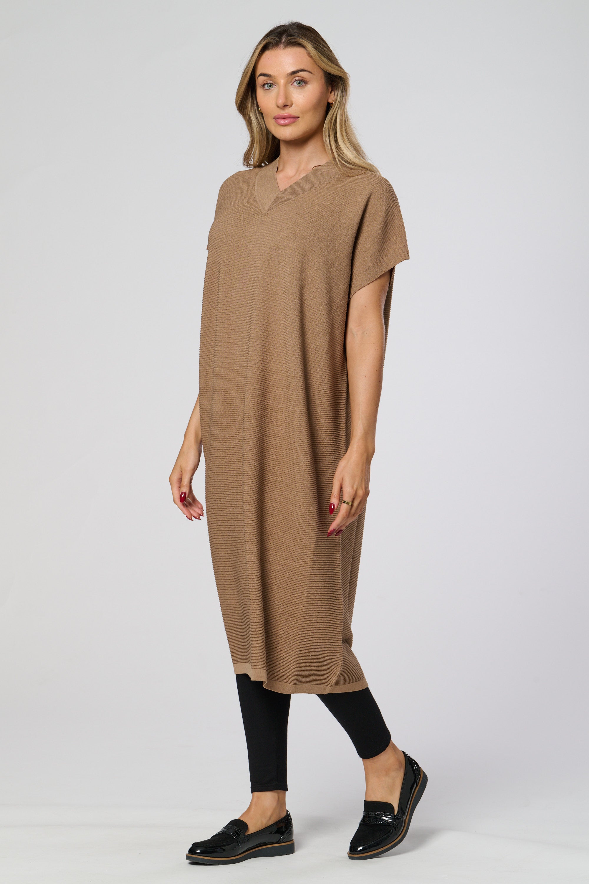 This knitted dress features a V-neck and extended shoulder sleeves for a comfortable yet stylish fit. Midi length and expertly crafted, it offers a timeless and versatile addition to your wardrobe. Made with high-quality materials, this dress is perfect for any occasion.