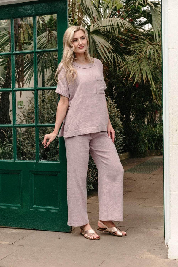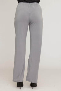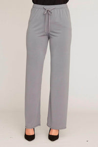 An elasticated wide-leg trouser with mocktie made from a smooth stretch fabric. Little to no need to iron, highly wash and wear-and-tear resistant.