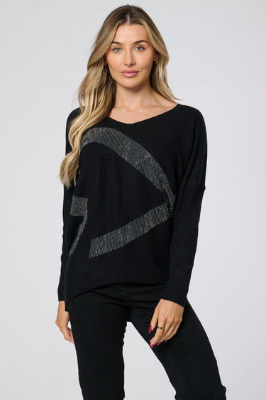 Elevate your casual look with this chic knit top, designed for both comfort and style. Crafted from a soft, lightweight knit, it features a flattering V-neckline and long sleeves for year-round wear. The standout detail is the shimmering metallic diagonal stripe that adds a modern, eye-catching twist to a classic silhouette. Perfect for pairing with jeans or tailored trousers, this versatile piece transitions effortlessly from day to night.