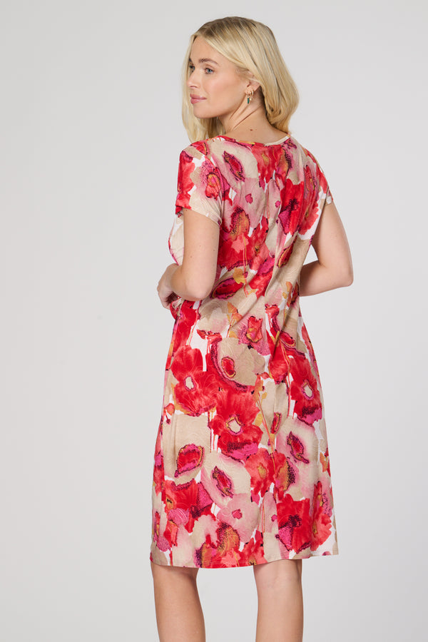 This sophisticated shift-dress boasts flattering ruched detail and elegant bow ties at the waist. Extended shoulder sleeves and a side slit add convenience and comfort. With its luxurious smooth texture and stretchy fabric, it's both fashionable and functional.