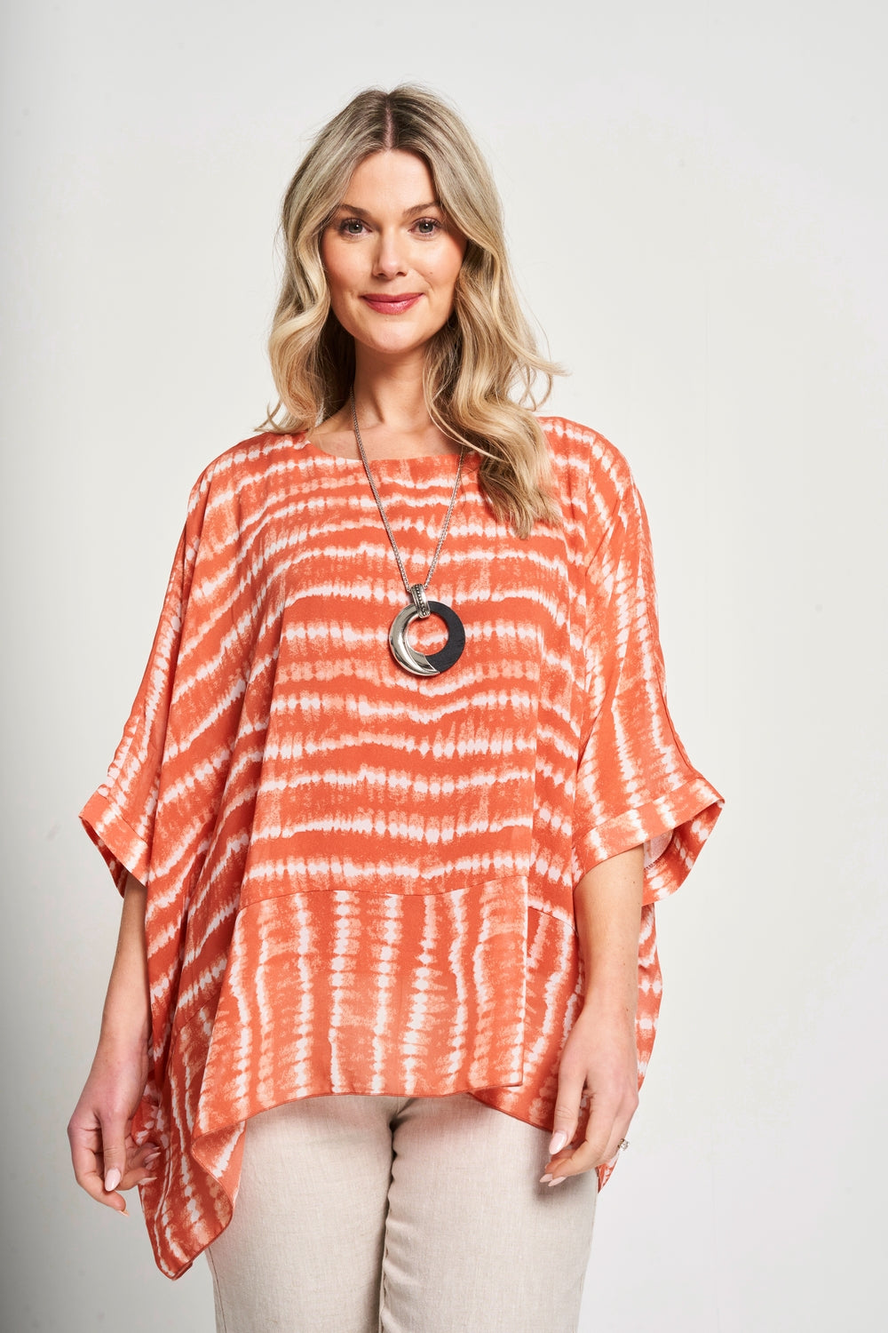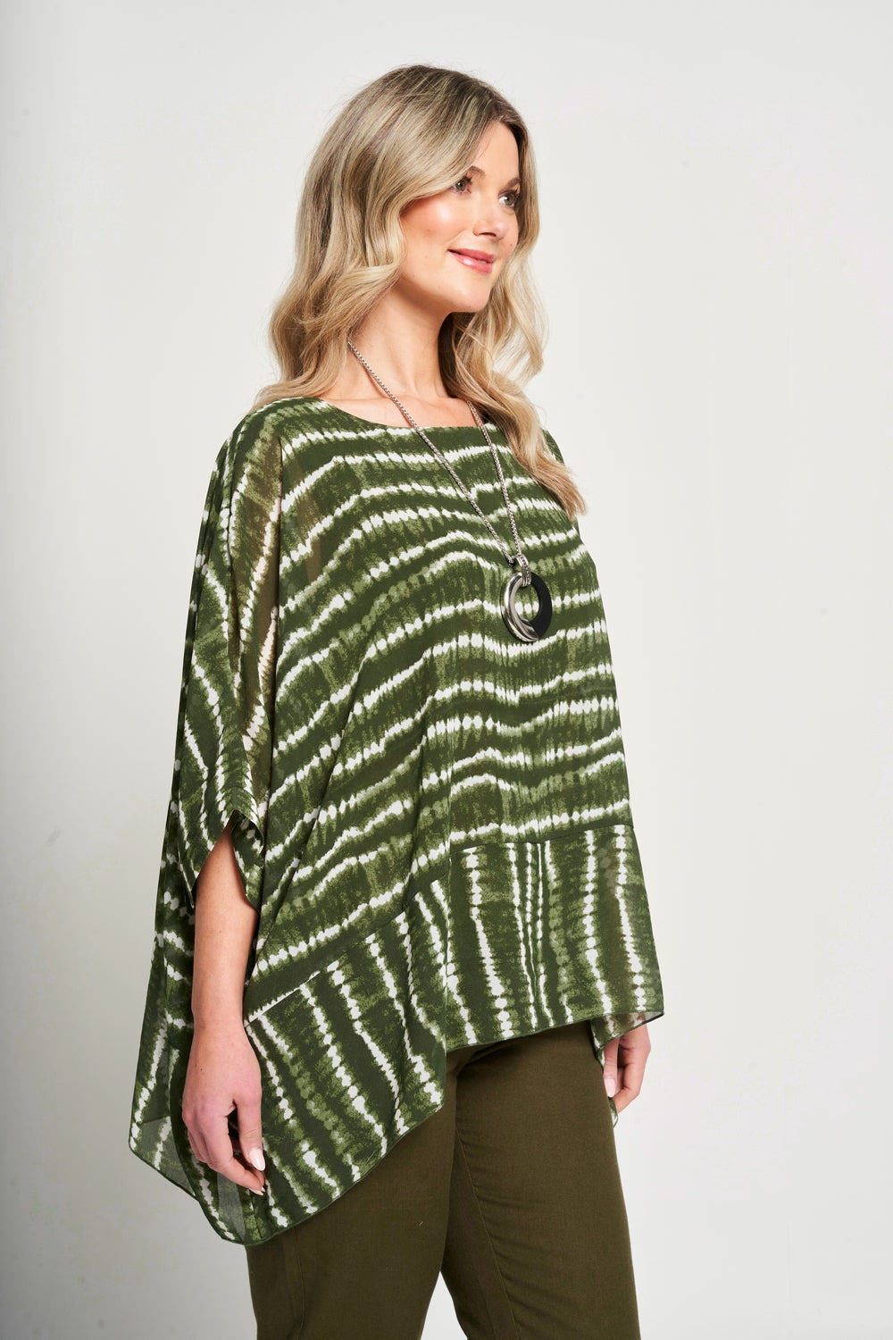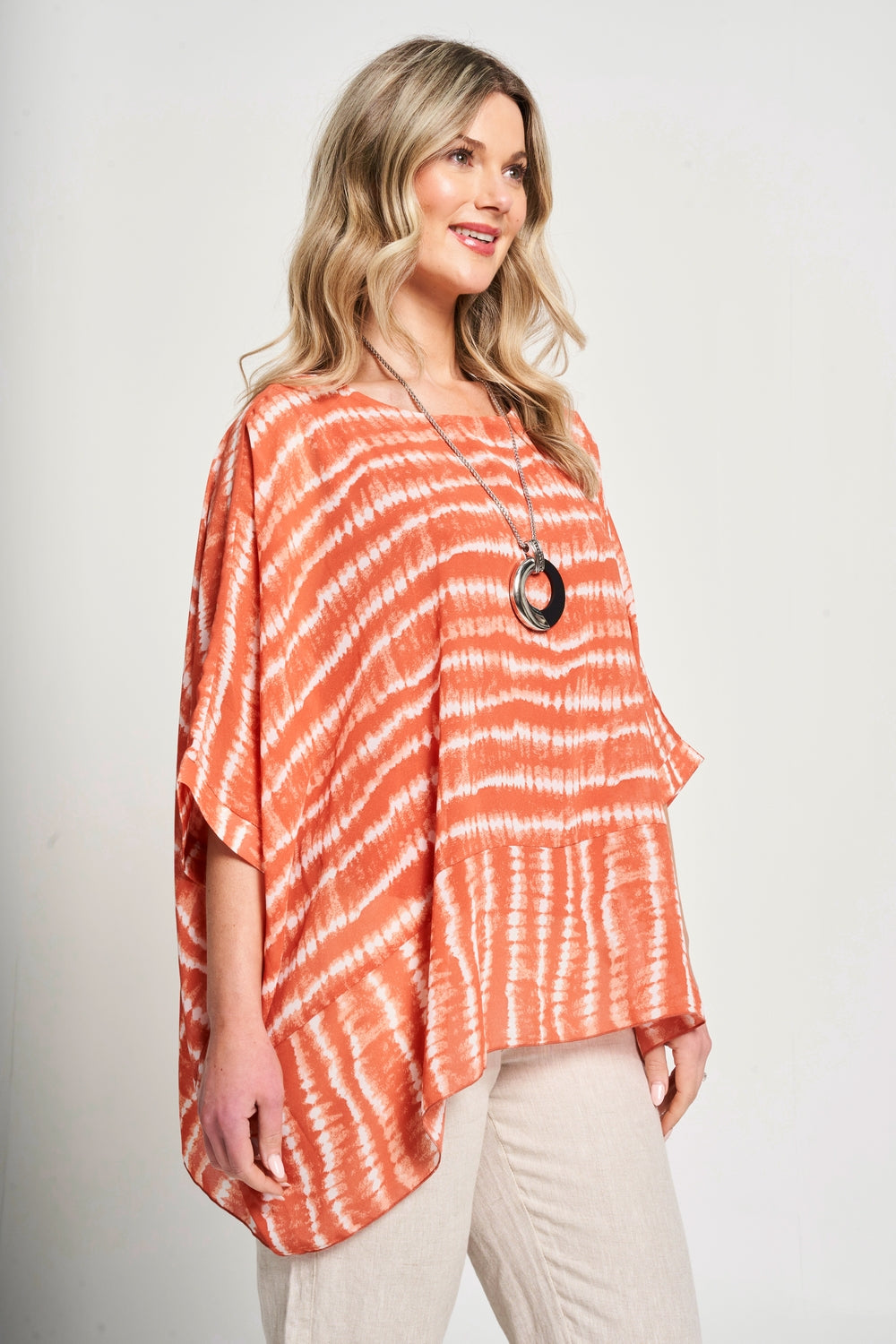 This top features a square shape and oversized fit, providing a modern and comfortable look. The chiffon fabric and viscose lining offer a lightweight and luxurious feel. Complete with a matching necklace* and side dip hem, effortlessly elevate your style.