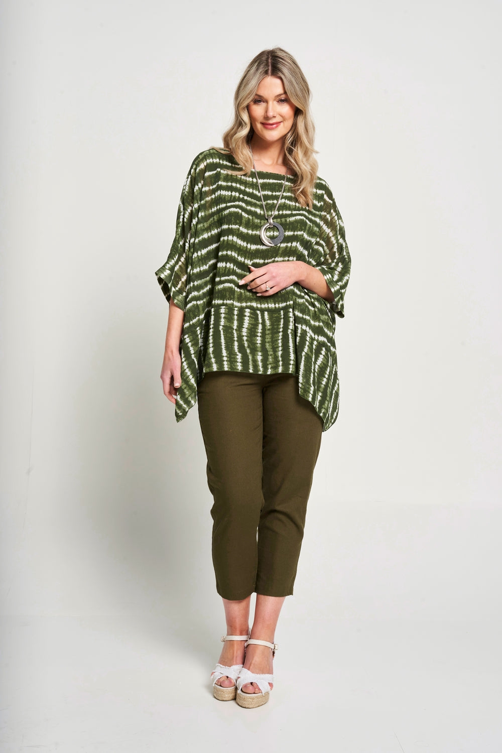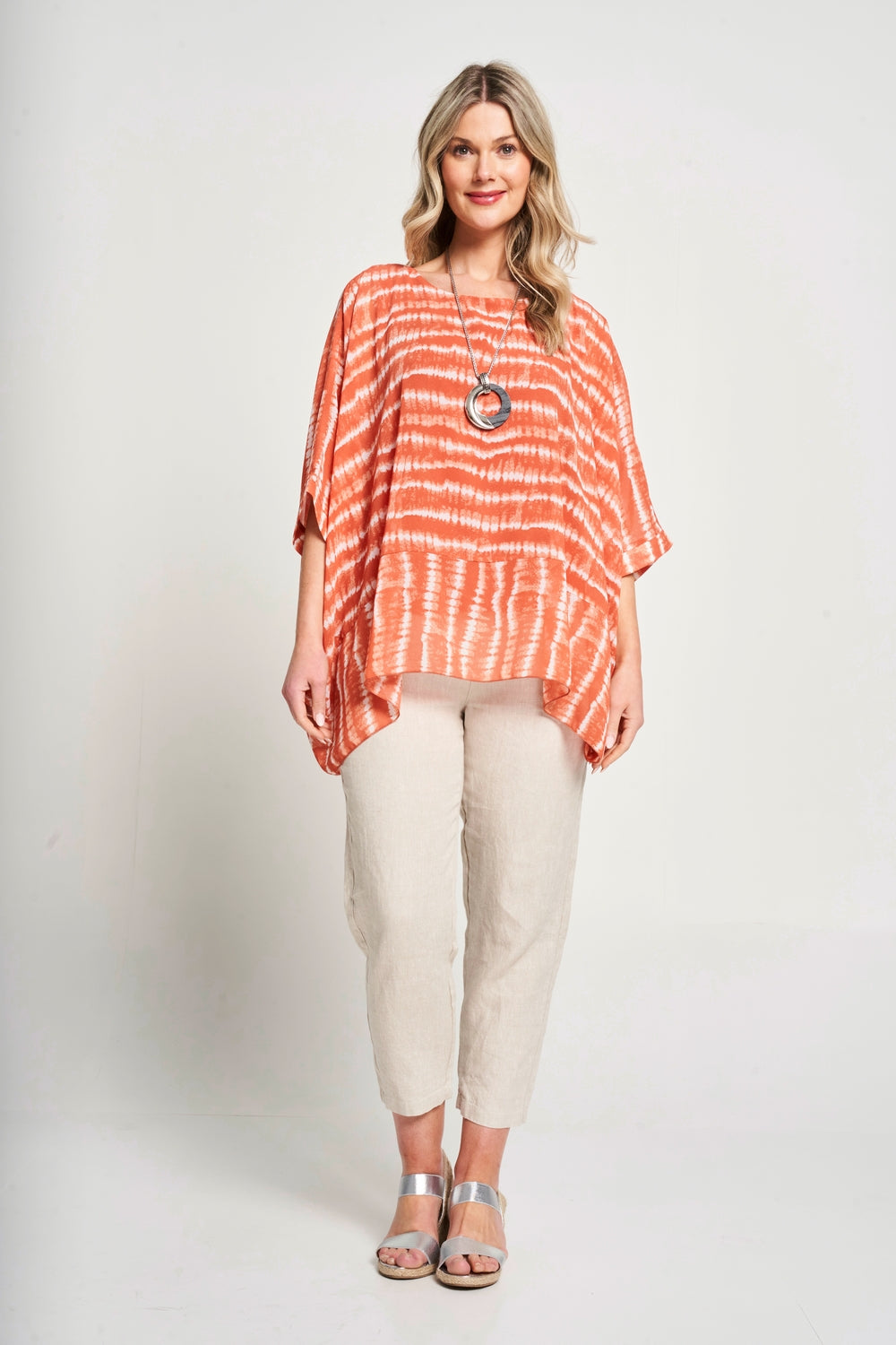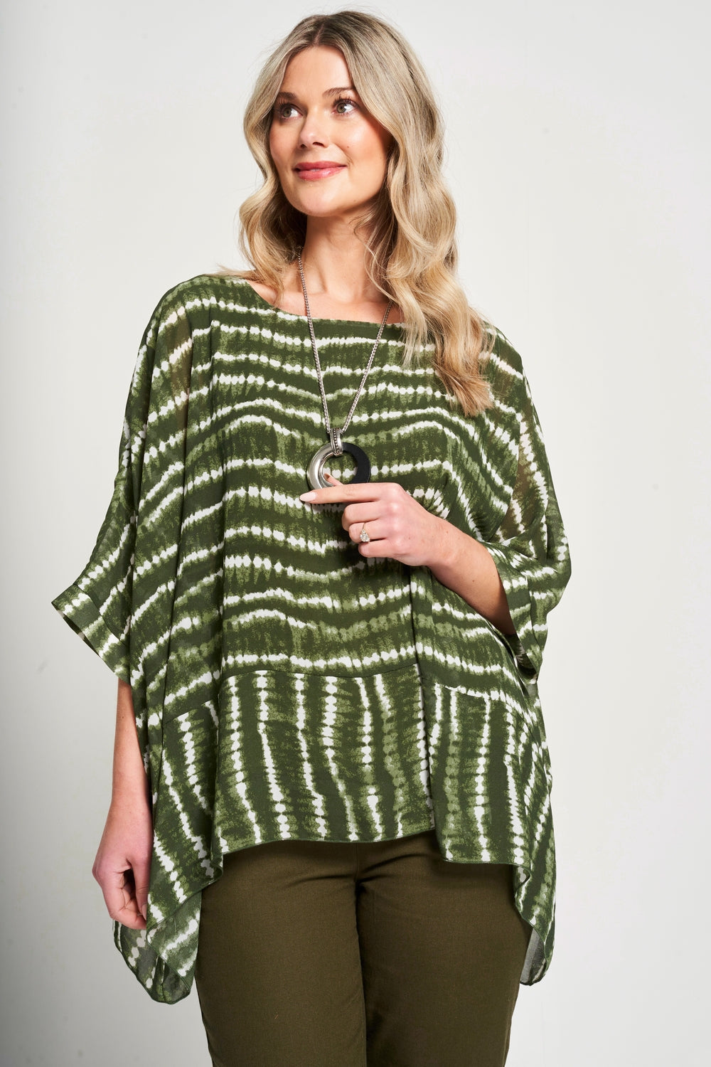 This top features a square shape and oversized fit, providing a modern and comfortable look. The chiffon fabric and viscose lining offer a lightweight and luxurious feel. Complete with a matching necklace* and side dip hem, effortlessly elevate your style.