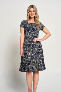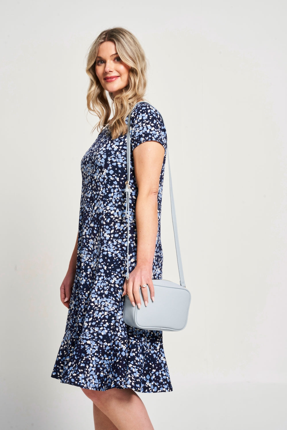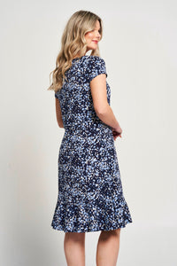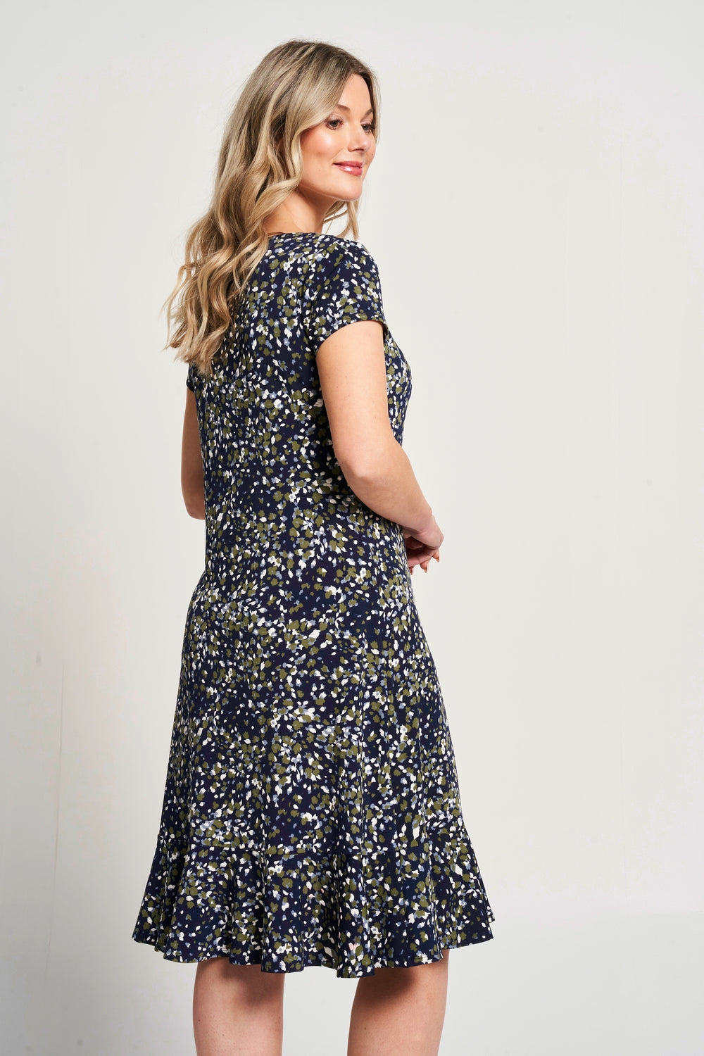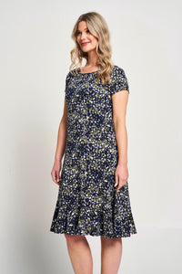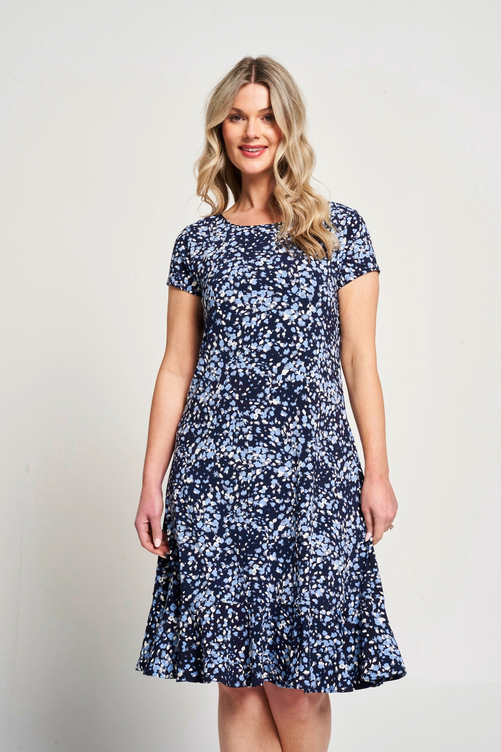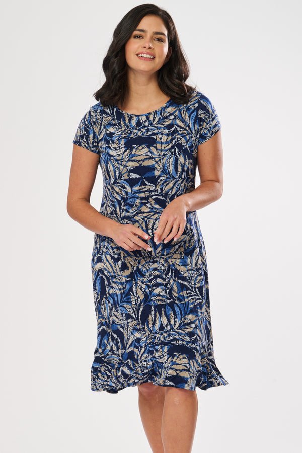 Expertly crafted with a frilled hem and stretch fabric, this dress offers both style and comfort. The boat neckline and short sleeves add a touch of elegance, making it the perfect choice for any occasion. Experience the perfect blend of fashion and functionality with this must-have dress.