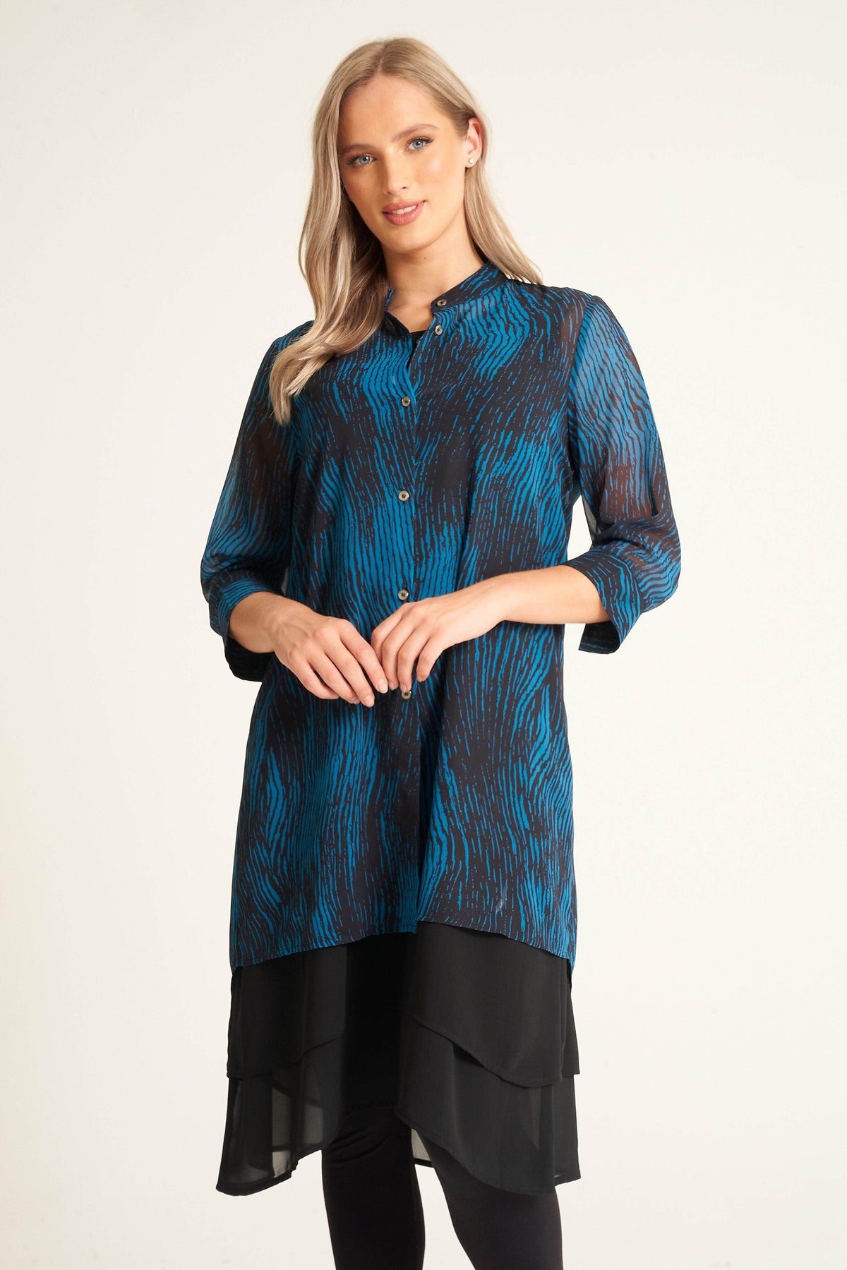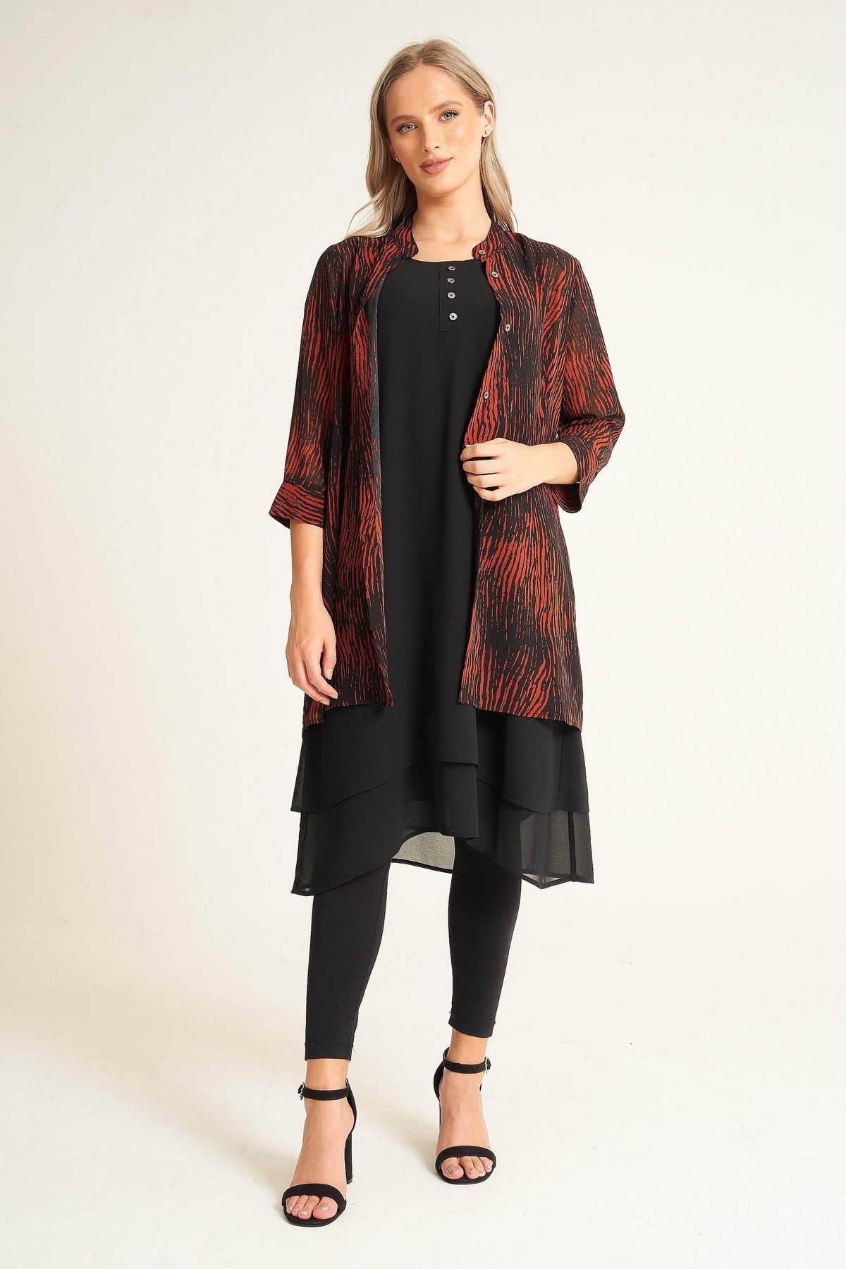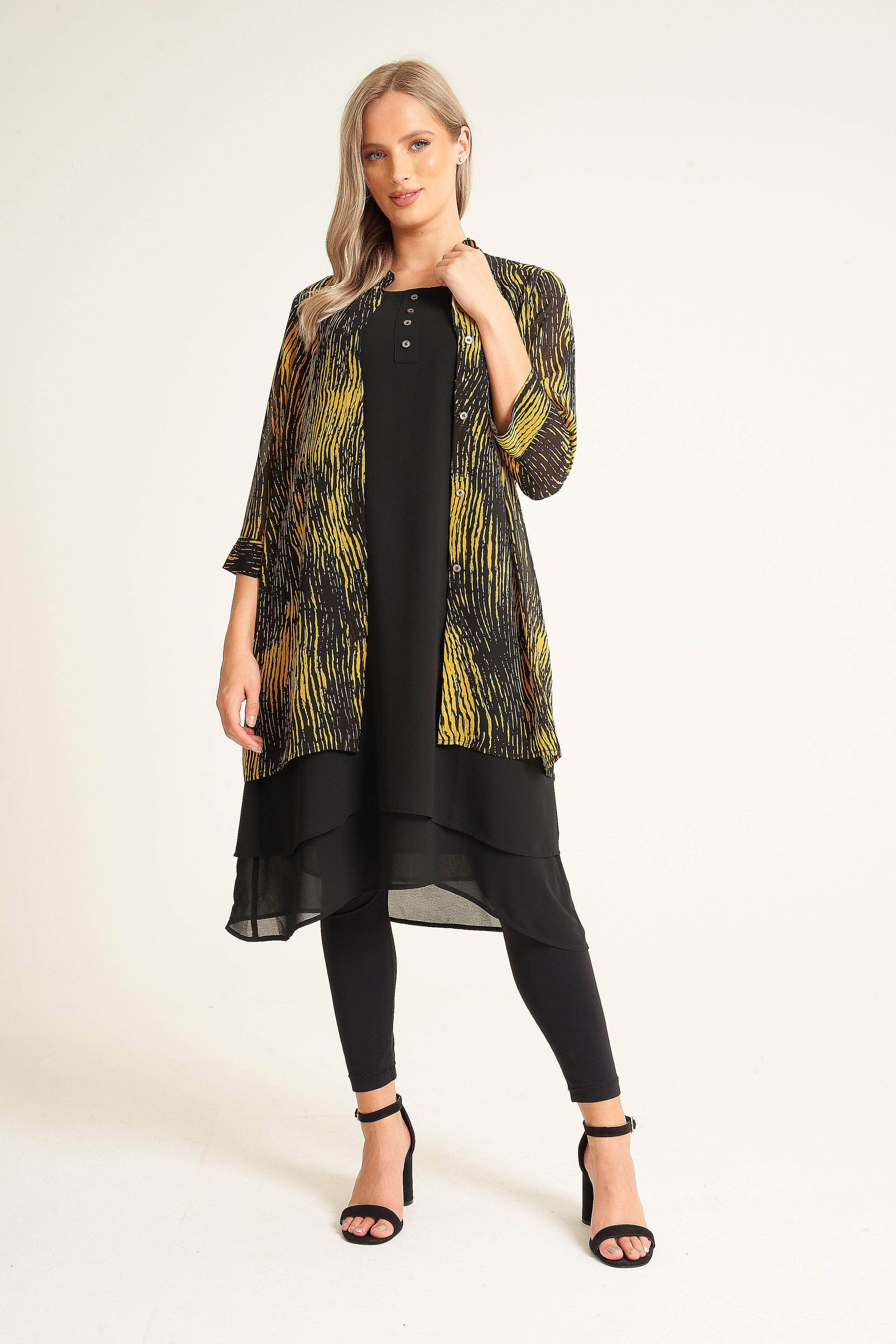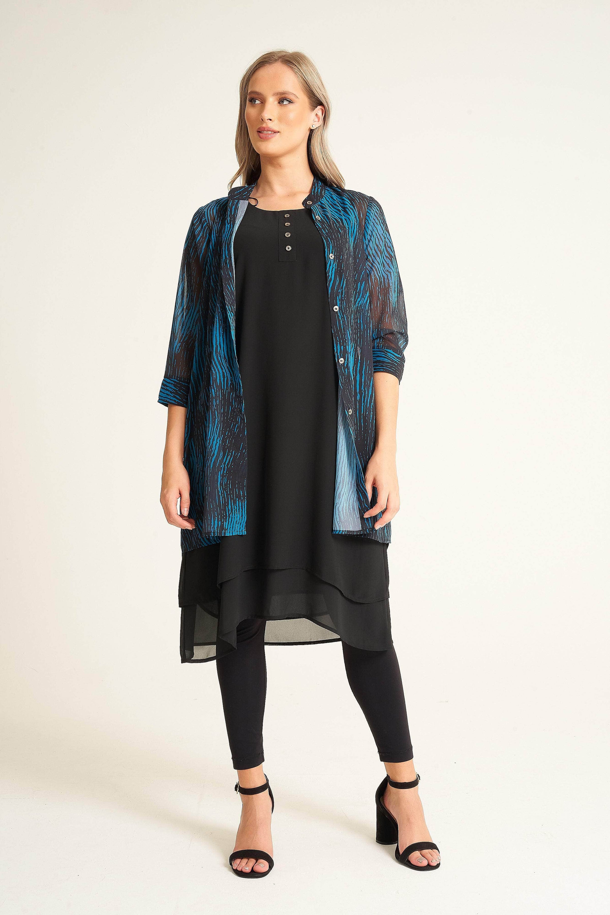 This triple-layer shirt dress presents an elegant combination of style and sophistication with a lightweight printed button through jacket.