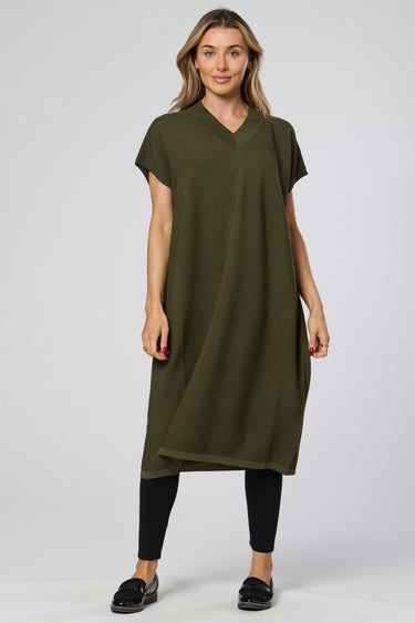 This knitted dress features a V-neck and extended shoulder sleeves for a comfortable yet stylish fit. Midi length and expertly crafted, it offers a timeless and versatile addition to your wardrobe. Made with high-quality materials, this dress is perfect for any occasion.