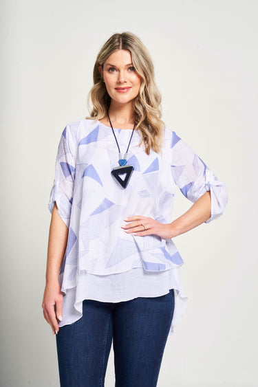 Expertly designed with a split back, double layer design, gathered button tab sleeve, and round neckline, this top offers not only style, but also comfort and versatility. The elliptical flared hem adds a unique touch, while the matching necklace* completes the look. Elevate your wardrobe with this must-have piece.