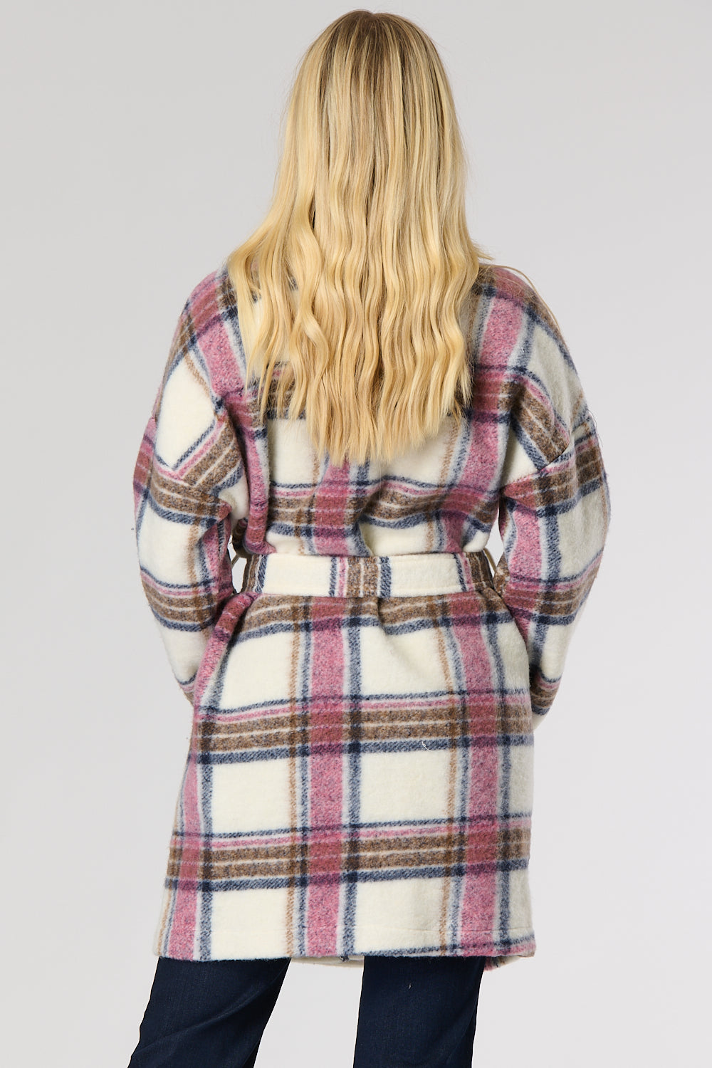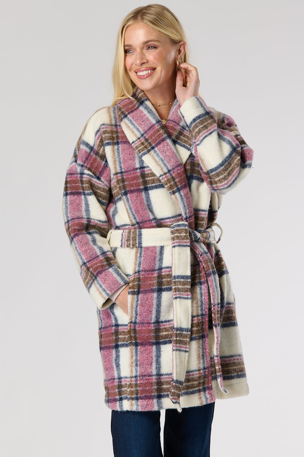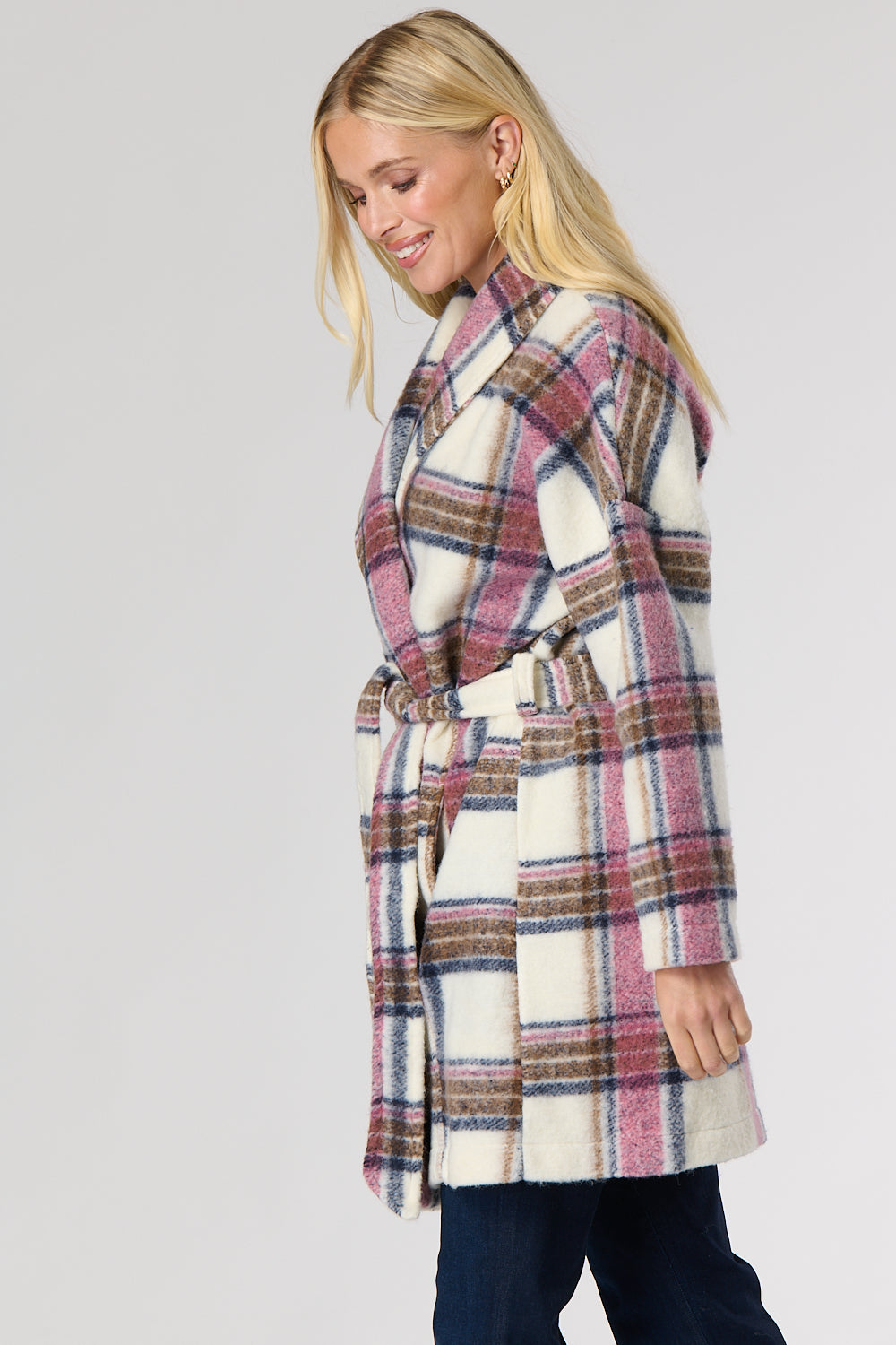 Check wool mix wrap over winter coat featuring stylish side pockets with a belt to provide a figure flattering look. Can also be worn without belt for that casual look.