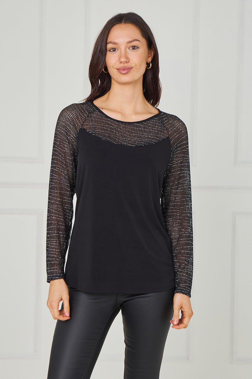 Saloos Women's Black Sparkle Mesh SleeveYoke Top