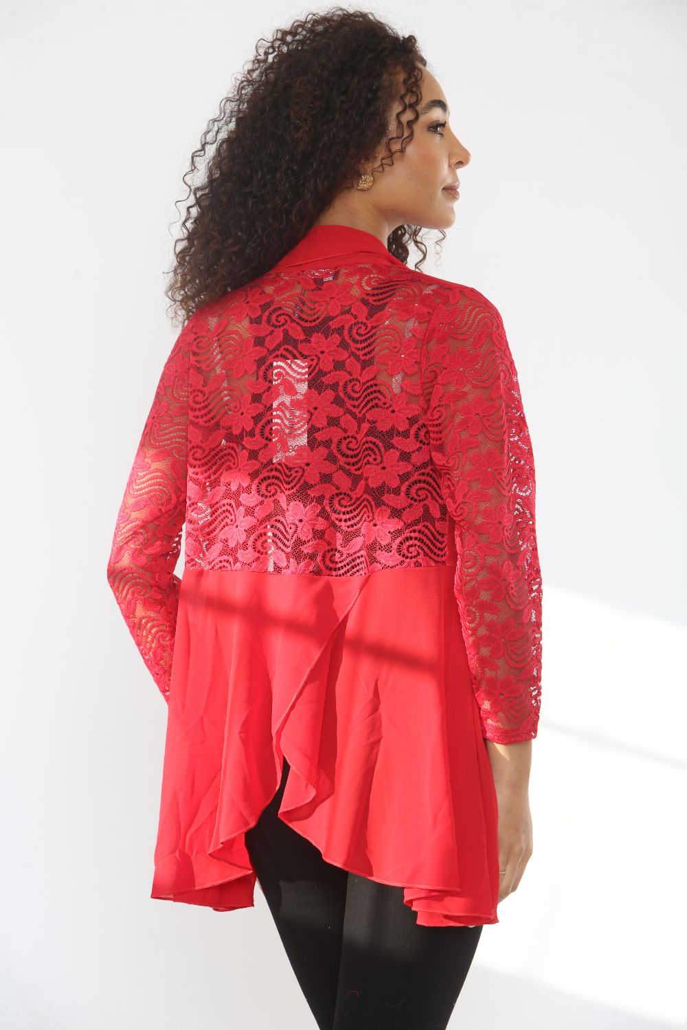 Saloos Women's Red Chiffon Waterfall Floral Lace Back Jacket