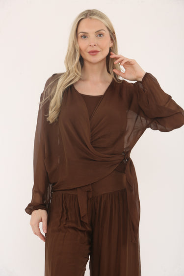This distinguished wrap blouse presents a featherlight, transparent material that cascades with natural grace, forming a subtle, feminine outline. The stretchy vest with spaghetti straps ensures proper coverage. Its extended sleeves and customizable waist binding deliver exceptional comfort and flexibility, positioning this garment as an indispensable layering component appropriate for both everyday and elevated styling contexts.