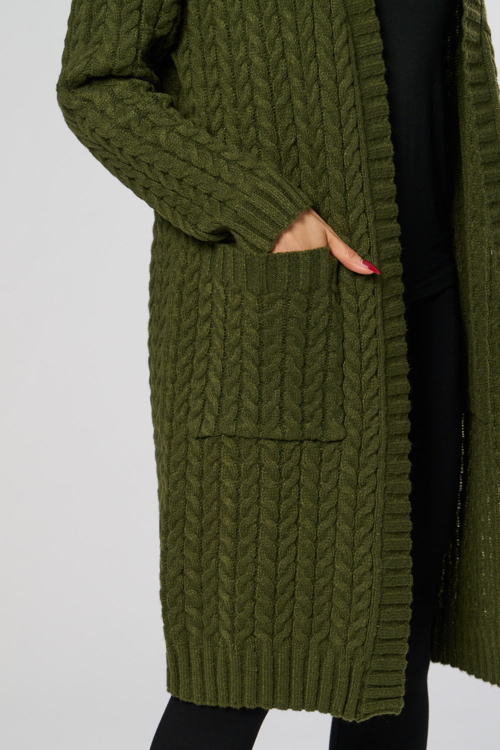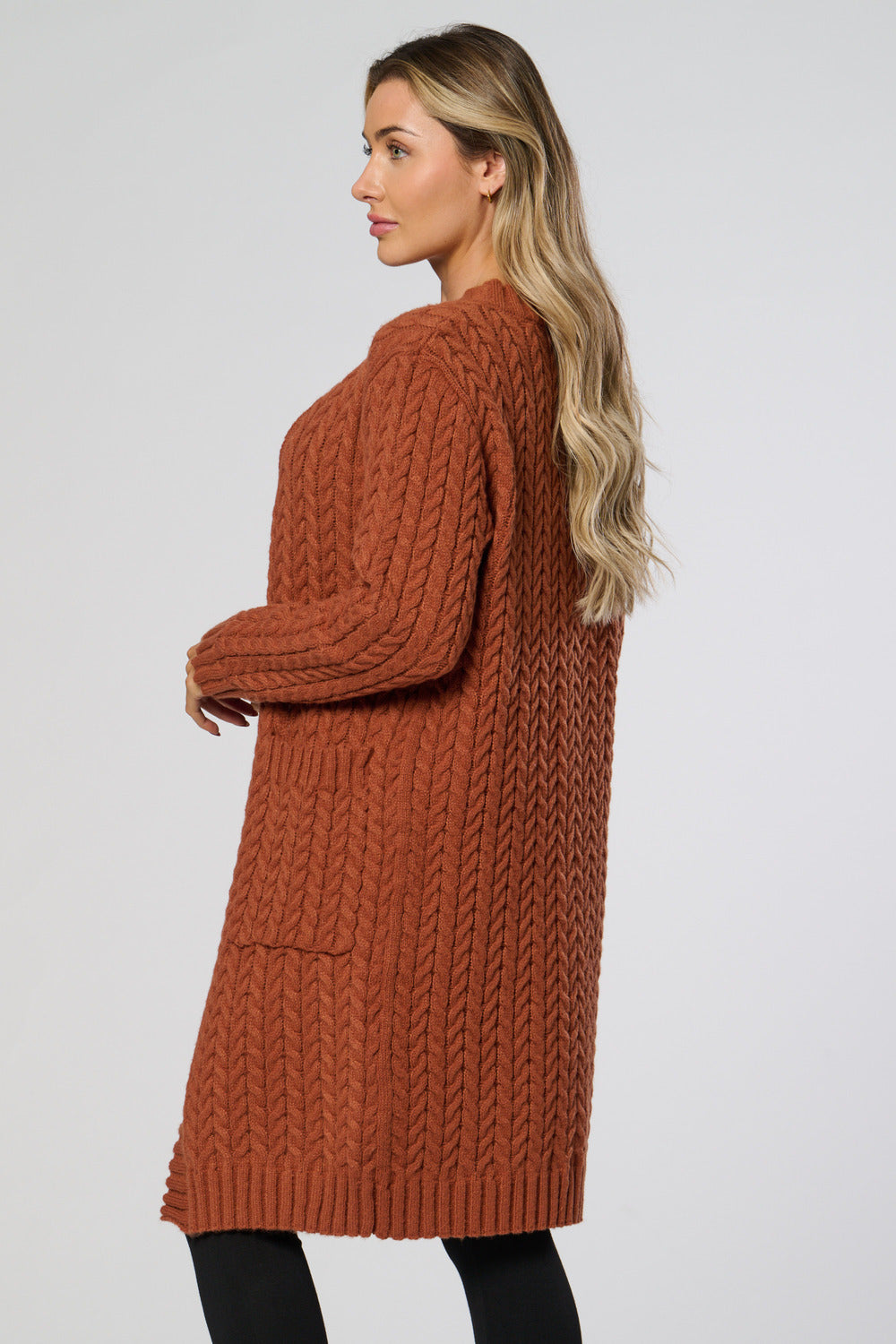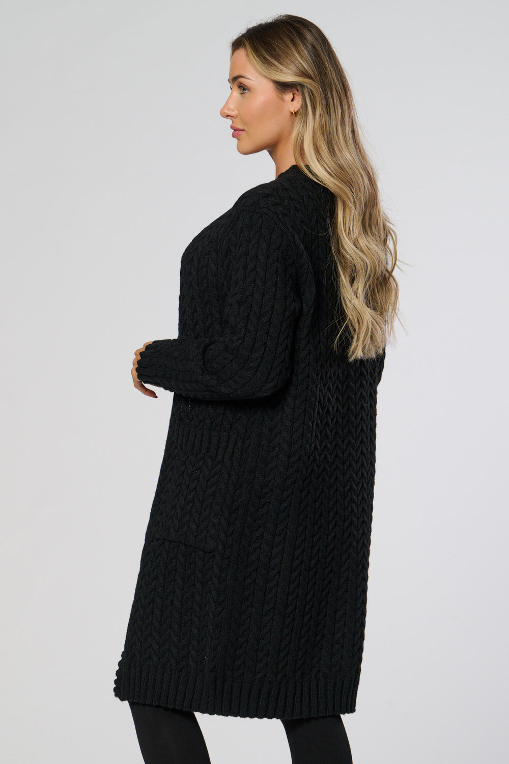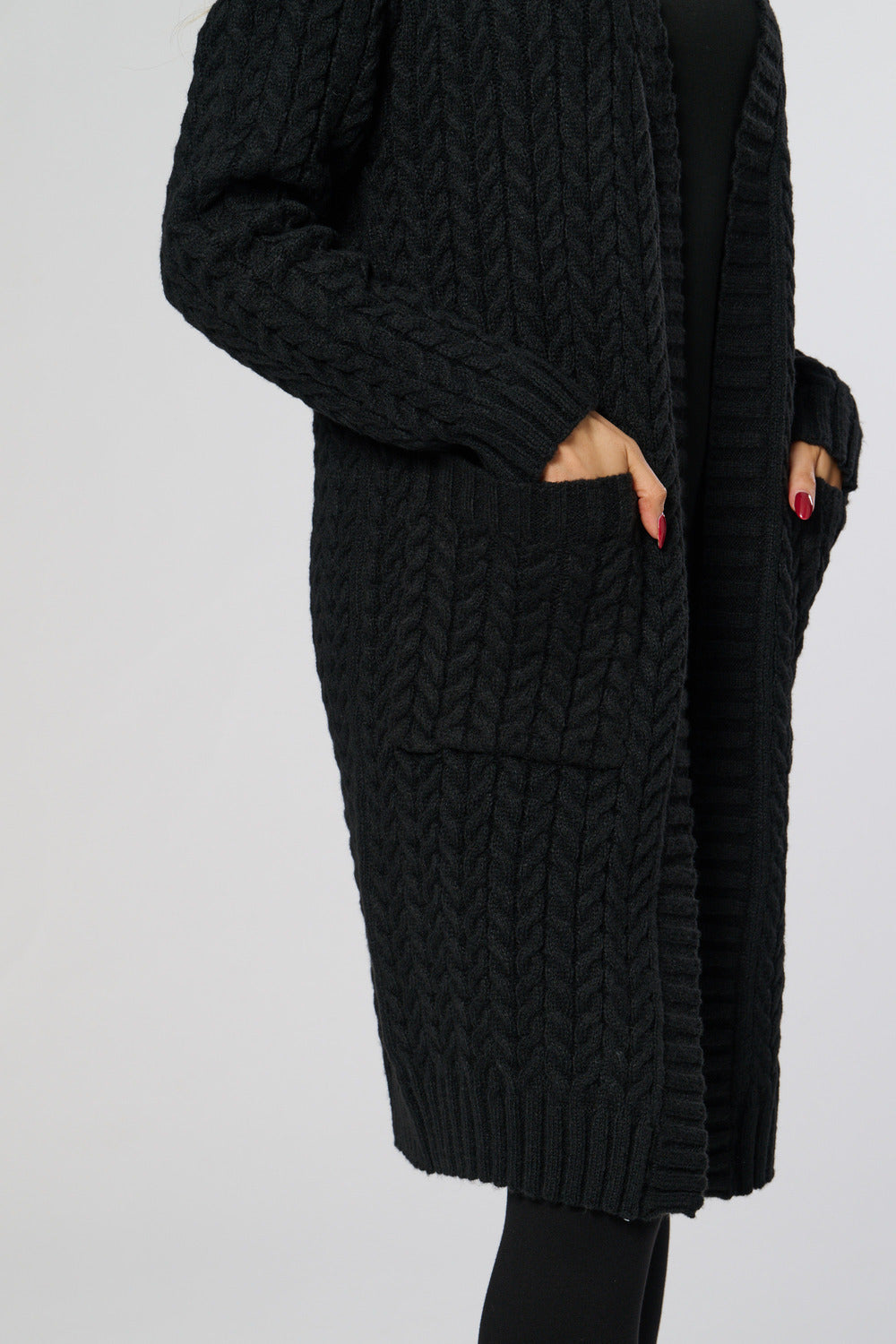 This cardigan is a timeless option for colder temperatures. Made from high-quality cable knit material, it guarantees comfort and warmth. It includes front pockets and long sleeves to ensure cosiness throughout the fall and winter months.