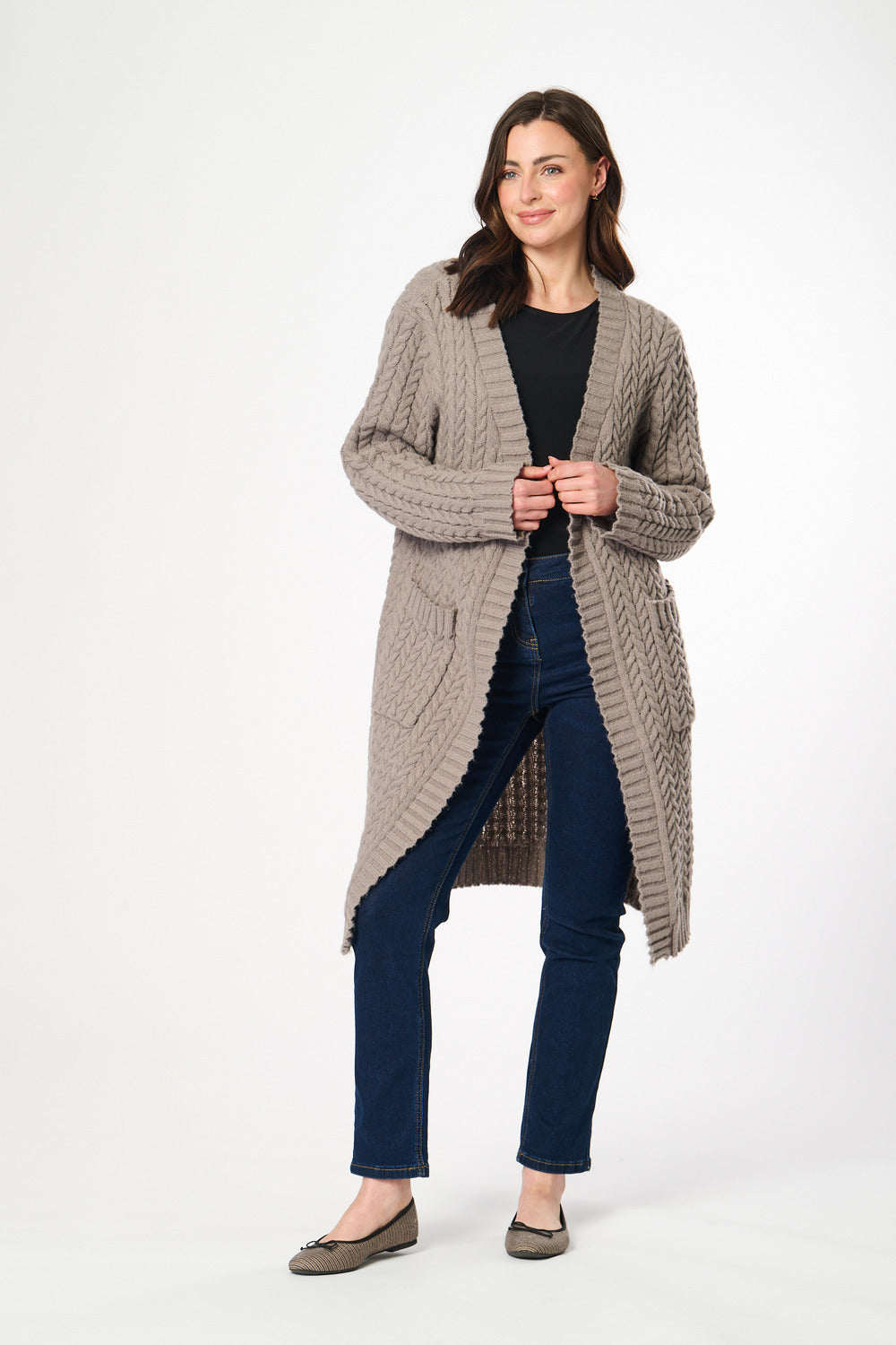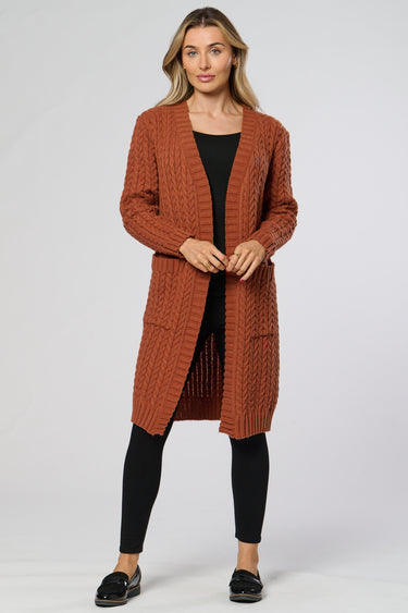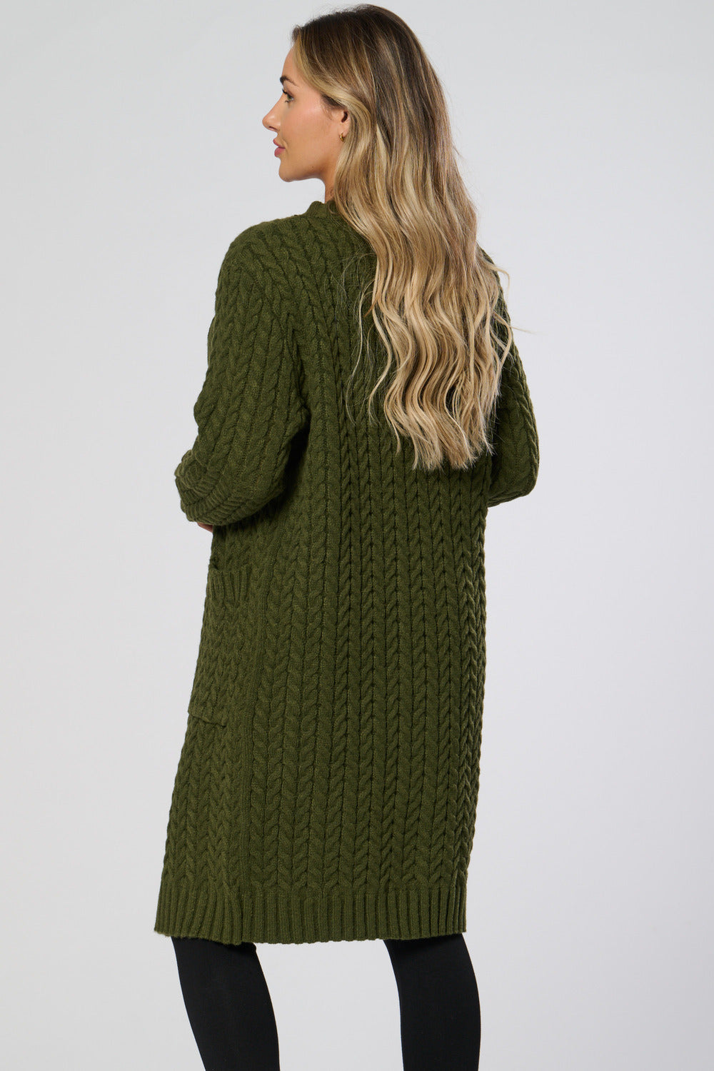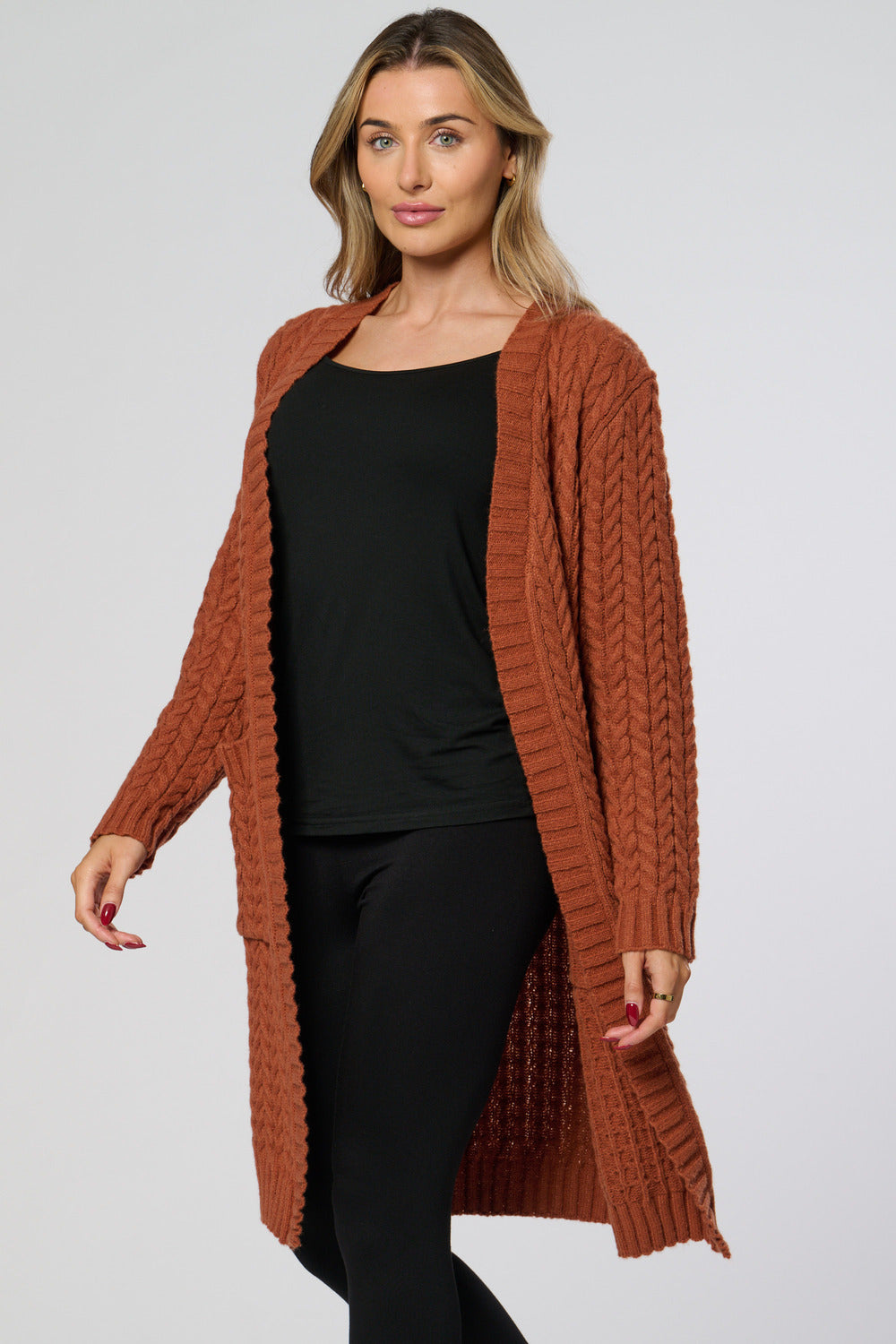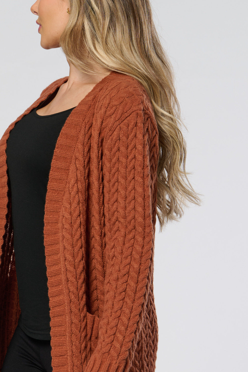 This cardigan is a timeless option for colder temperatures. Made from high-quality cable knit material, it guarantees comfort and warmth. It includes front pockets and long sleeves to ensure cosiness throughout the fall and winter months.