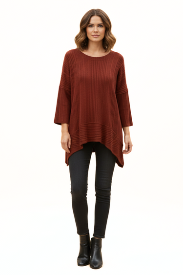 Elevate your everyday style with this chic panelled ribbed top. Designed with a relaxed silhouette, it features a wide round neckline, 3/4 length sleeves, and an asymmetrical hemline for a flattering drape. The textured ribbed knit adds a modern touch while keeping it effortlessly cozy. Perfect for pairing with jeans, leggings, or sleek trousers, this versatile piece transitions seamlessly from casual outings to polished ensembles.