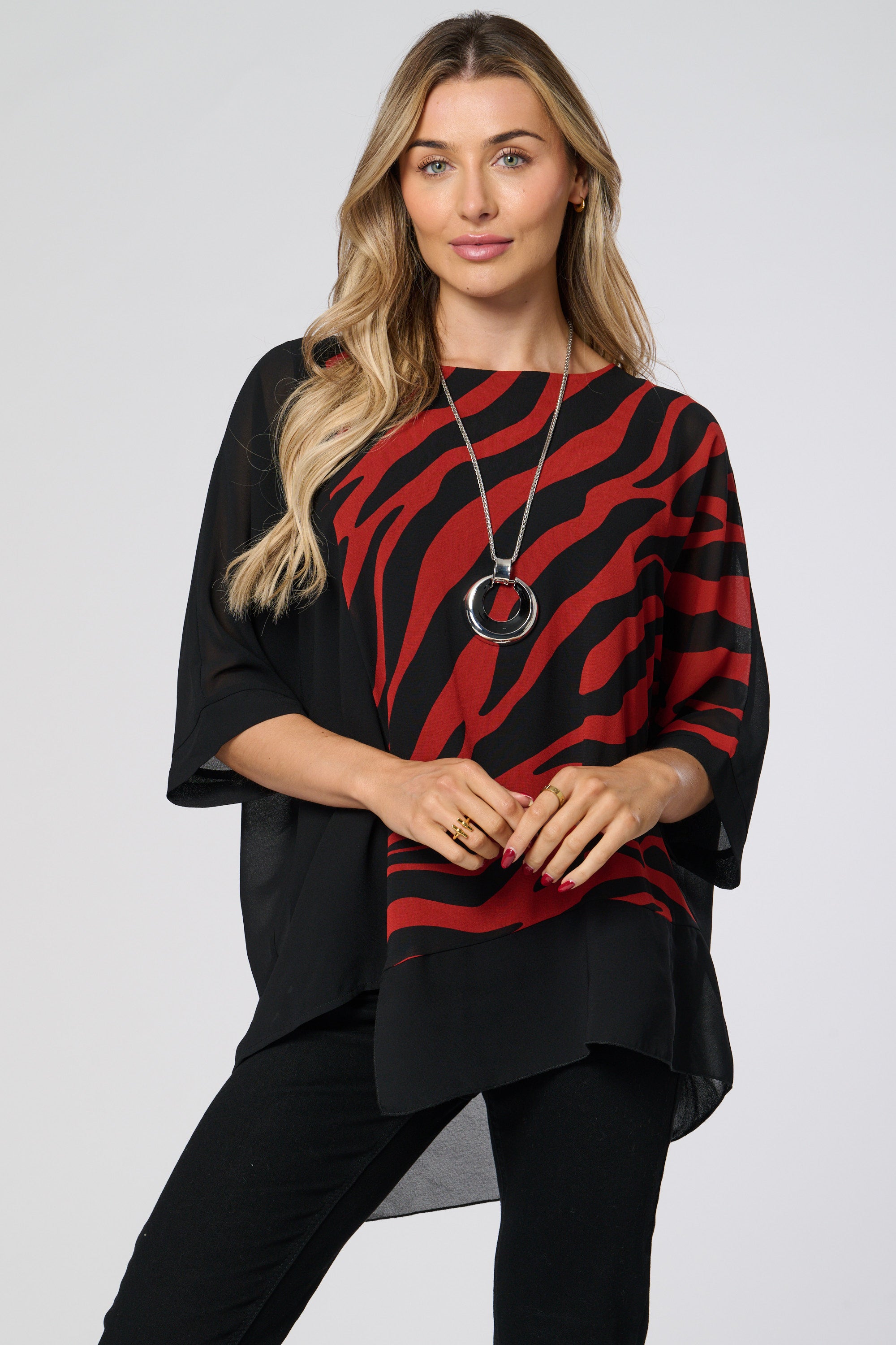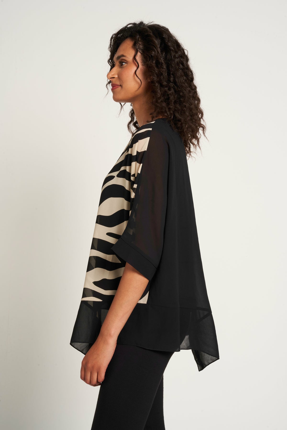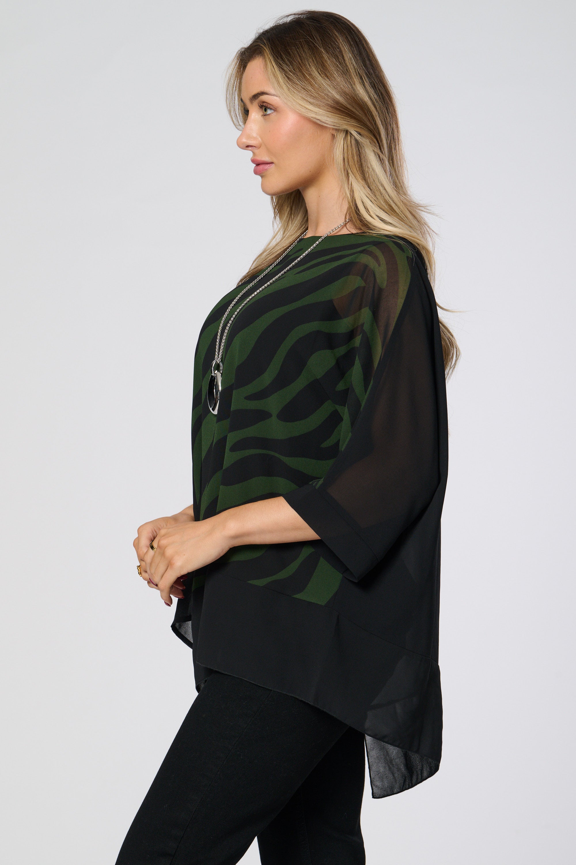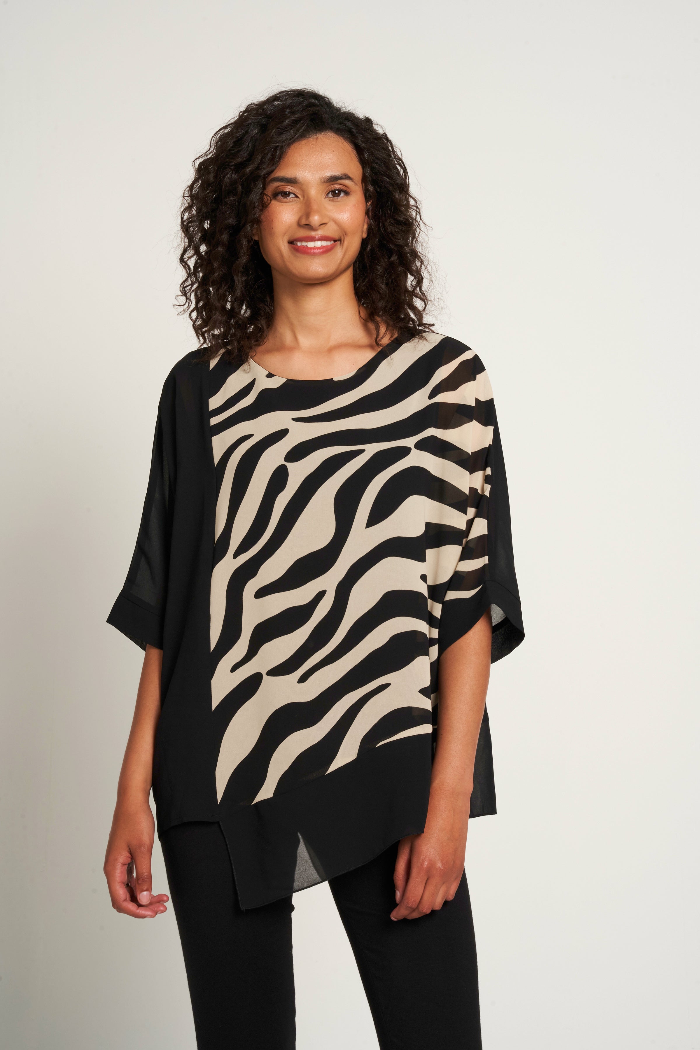 Designed for comfort and style, this top features a unique batwing shape, elbow length sleeves, and a round neck. The double layer construction ensures a professional, polished look. Stay cool and confident all day long in this print/plain top.