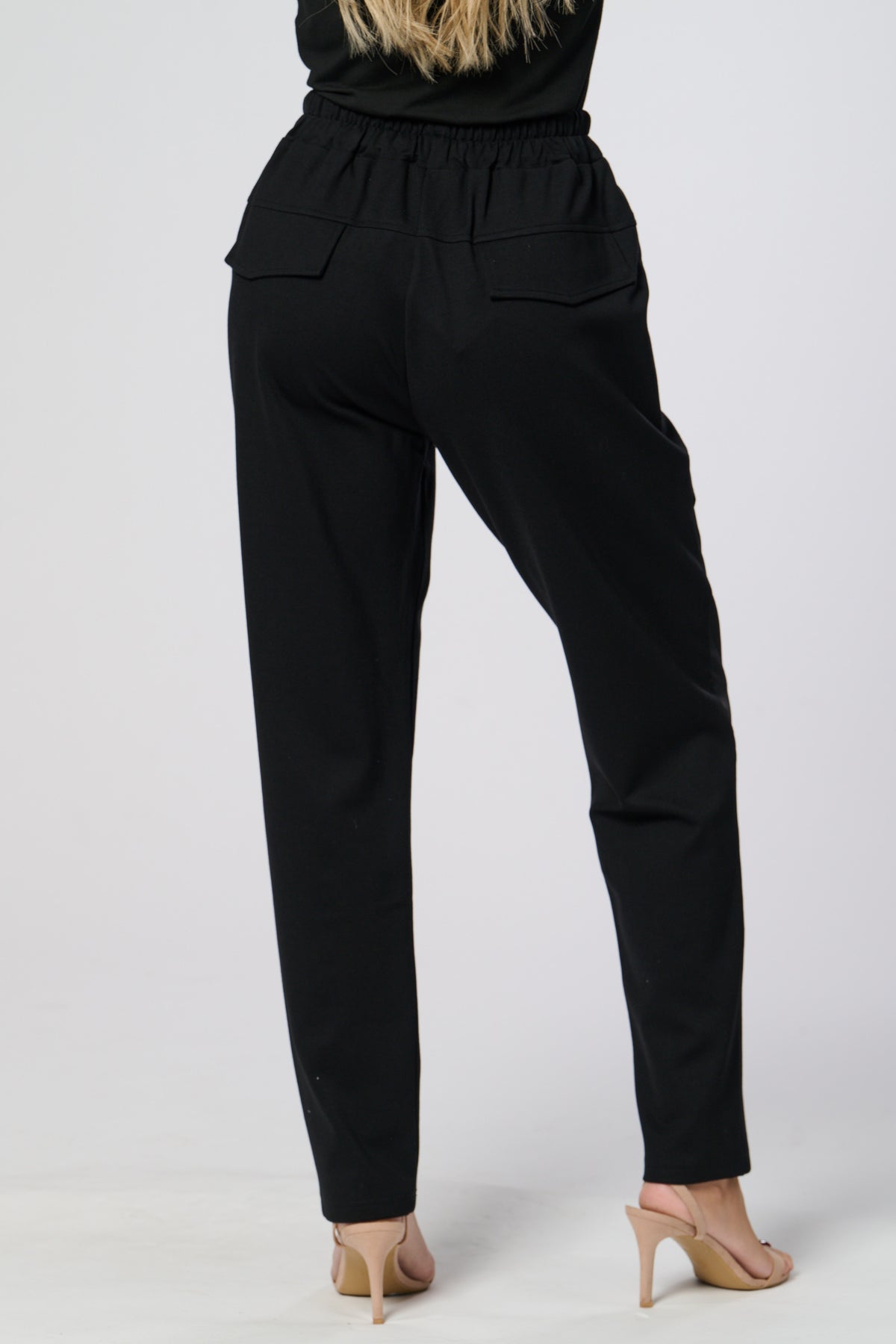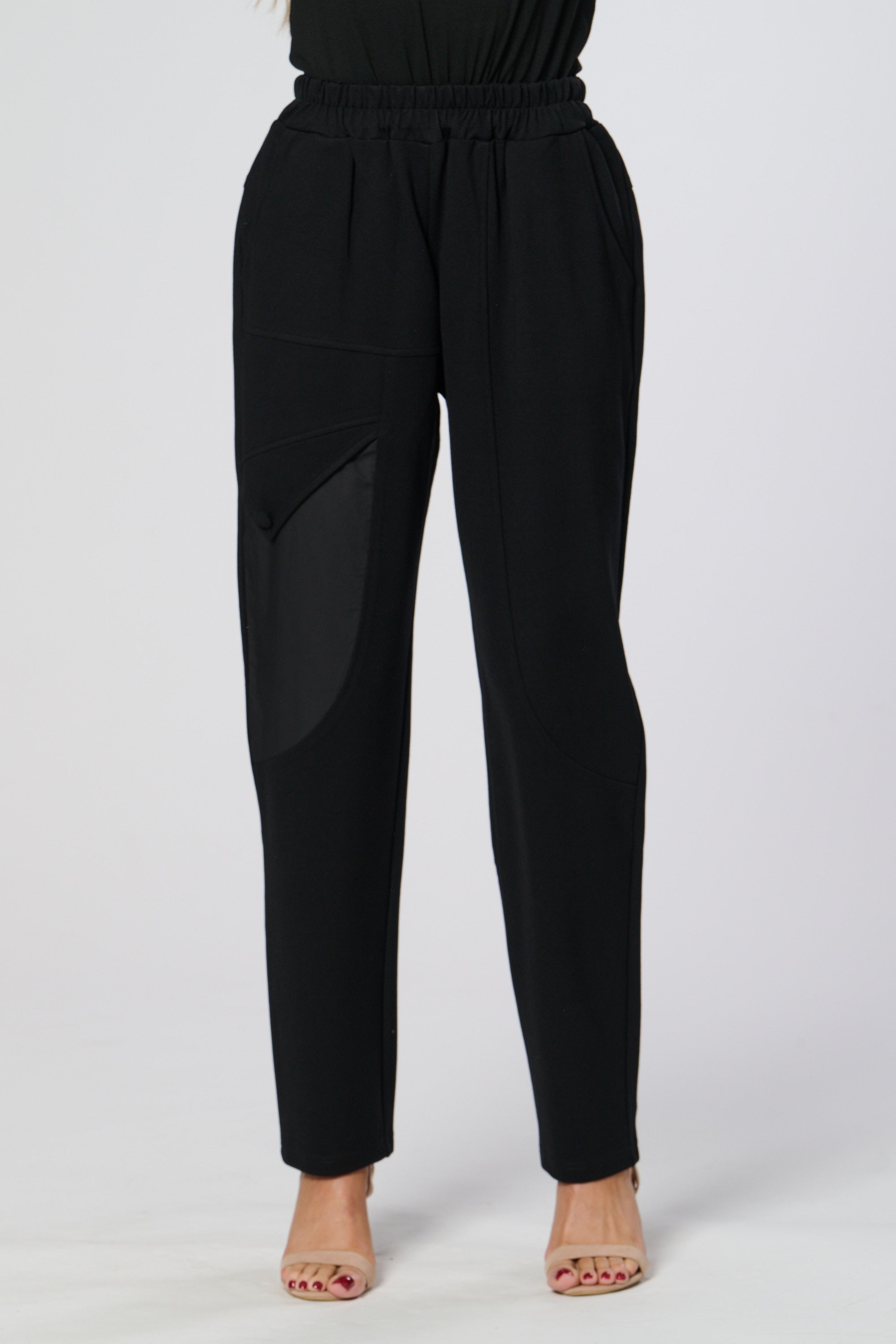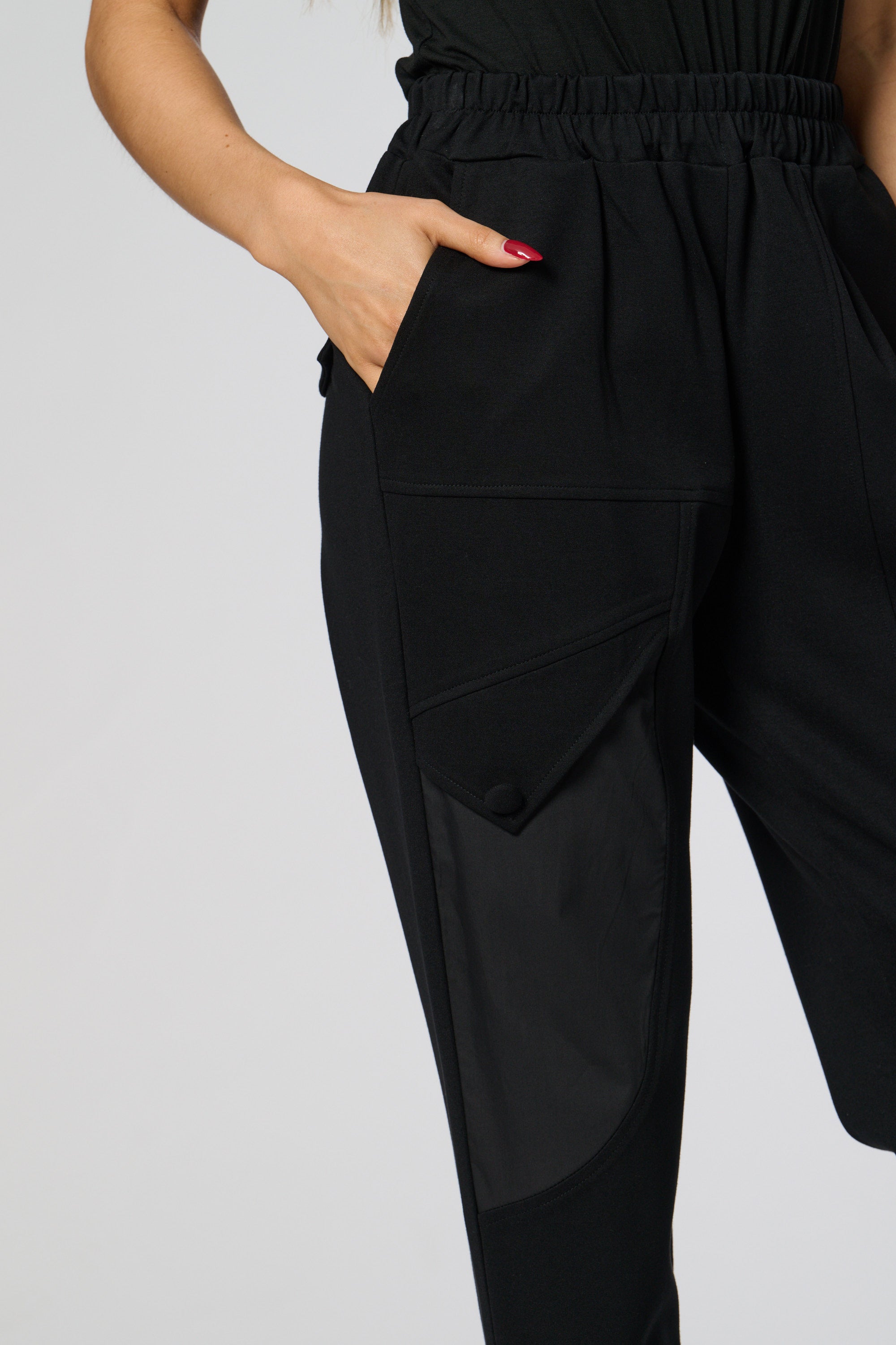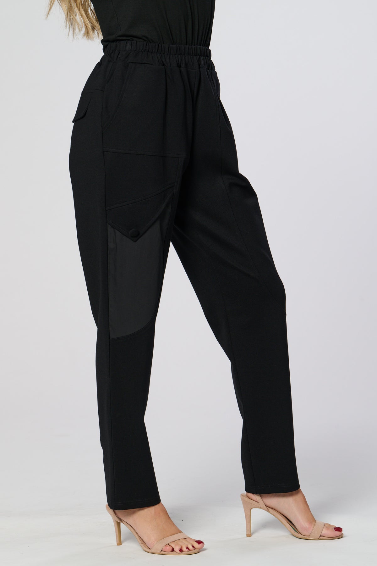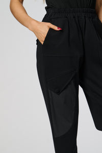 These sleek black trousers combine comfort and style with a relaxed, tapered fit and elasticated waistband. The standout contrast side panel adds a modern, utilitarian touch, while subtle waist pleats create a flattering silhouette. Perfect for both casual and refined looks.