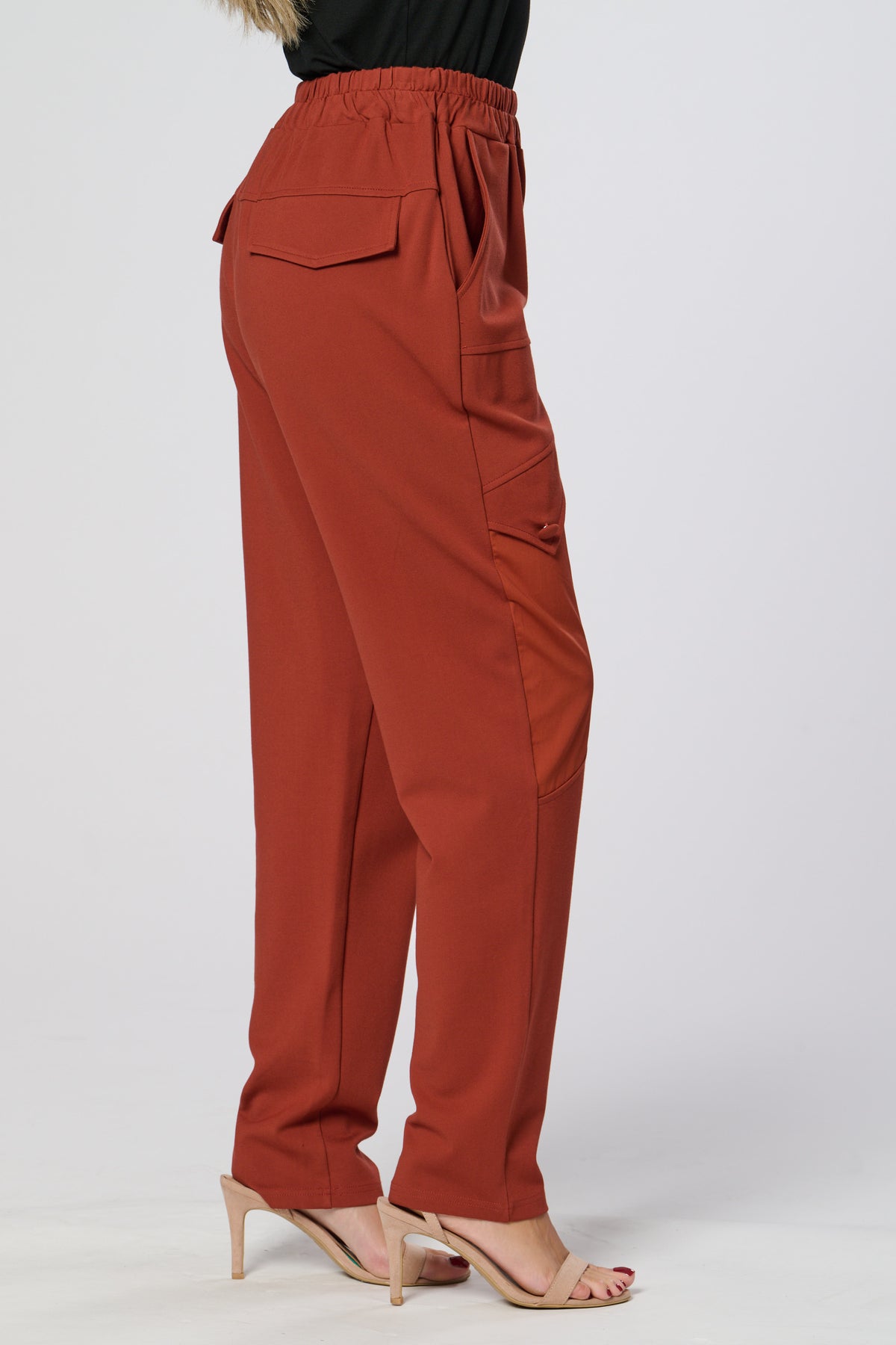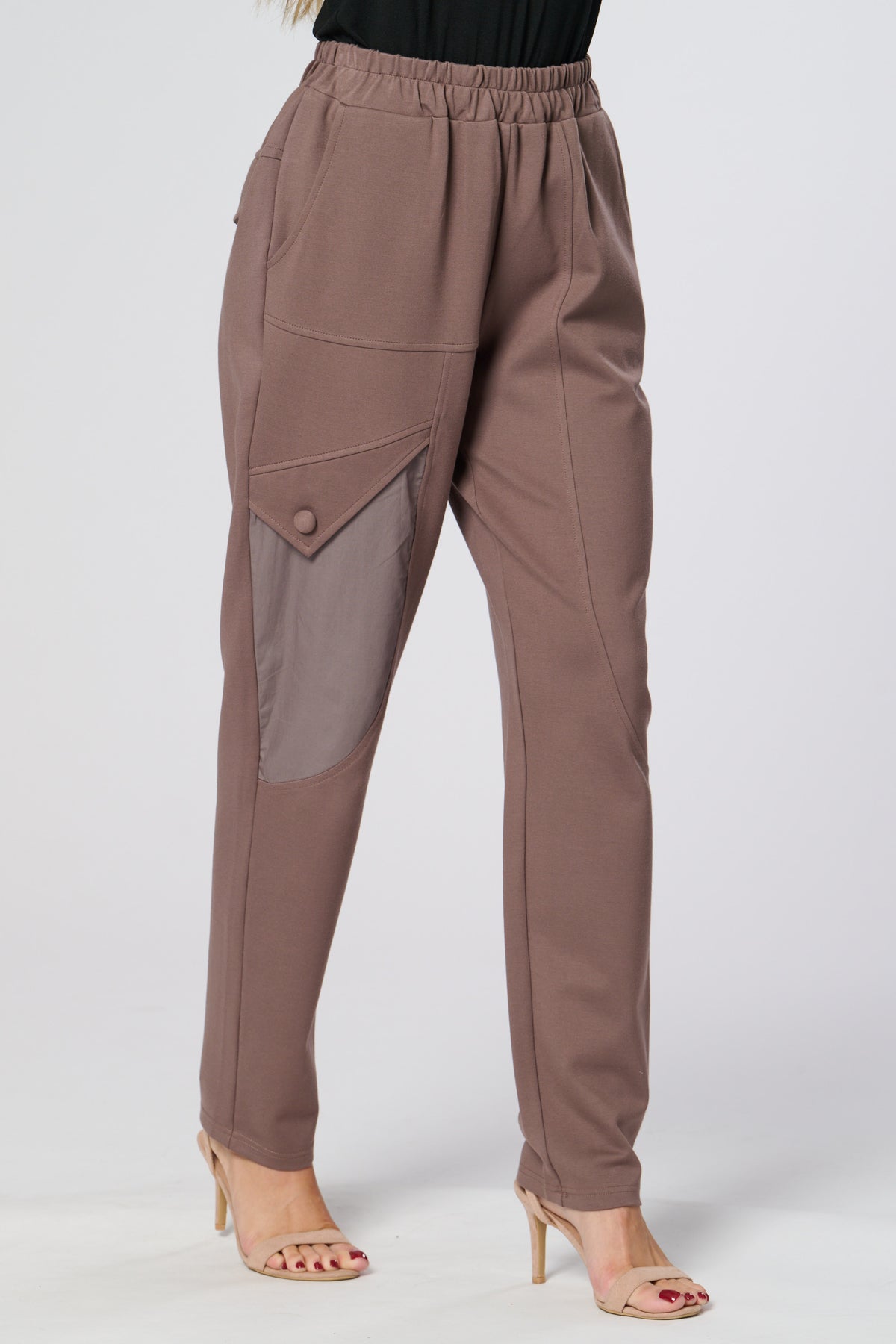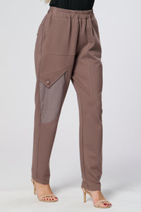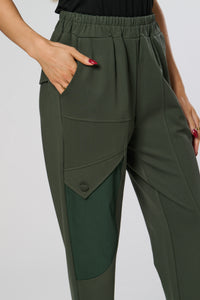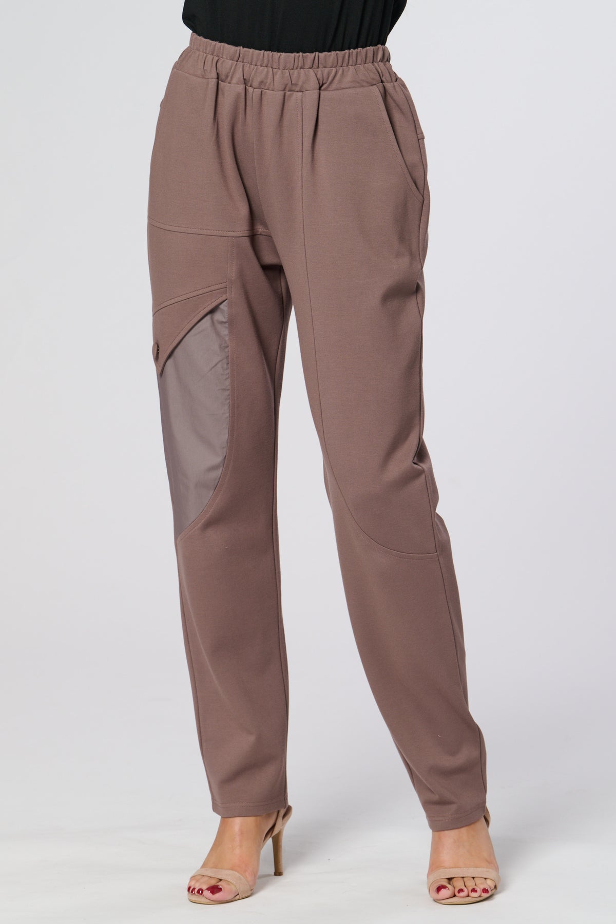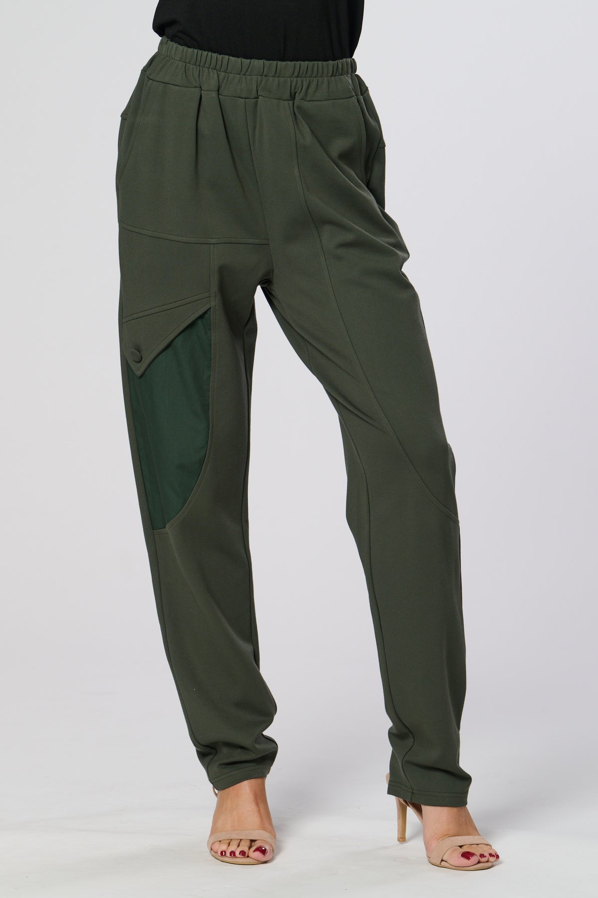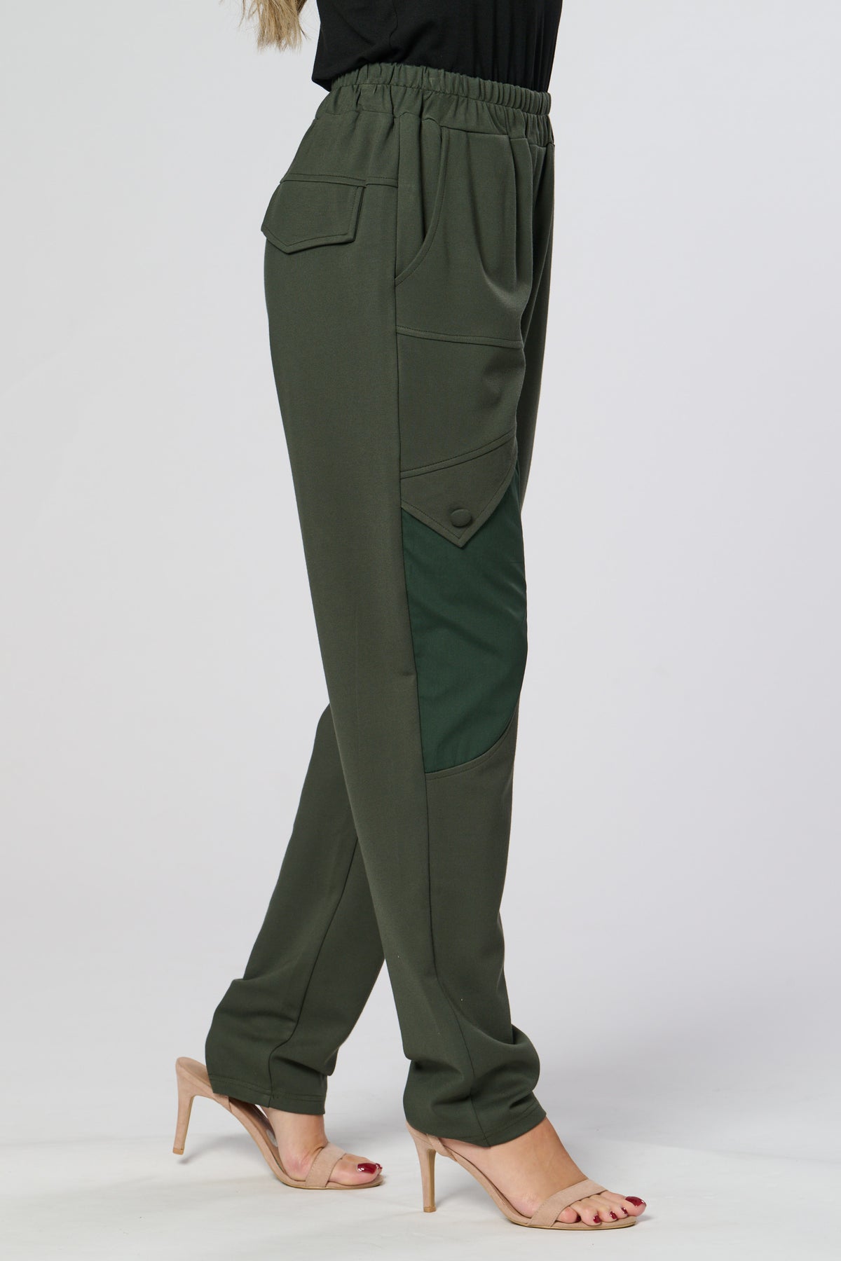 These sleek black trousers combine comfort and style with a relaxed, tapered fit and elasticated waistband. The standout contrast side panel adds a modern, utilitarian touch, while subtle waist pleats create a flattering silhouette. Perfect for both casual and refined looks.