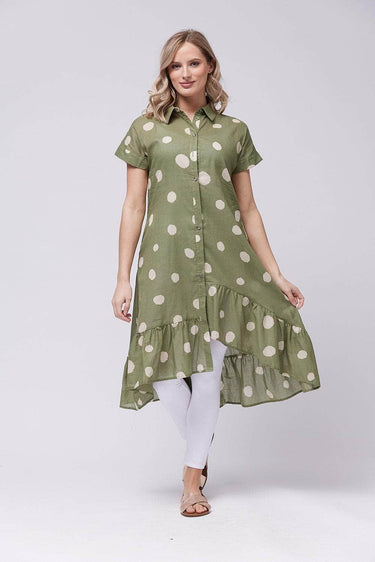 Introducing Saloos Uneven Front Dress—your perfect choice for effortless style. Featuring an uneven front, a frilled hem and front button closure, you'll look chic and on-trend. The extended shoulder short sleeves and side pockets offer practicality, while the classic polka print gives you eye-catching flair.