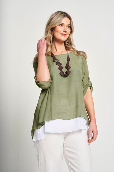 This top features a double layer design with a contrasting underlayer, adding dimension and visual interest. The ruched tab sleeves and round neck provide a flattering fit, while the lightweight fabric keeps you comfortable. The split back adds a unique touch, and it comes with a matching necklace*.