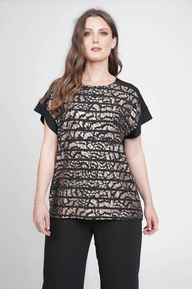 Extended shoulder sleeve top featuring metallic striped and animal design. Textured fabric with loose short sleeves. Perfect for evening or party wear.