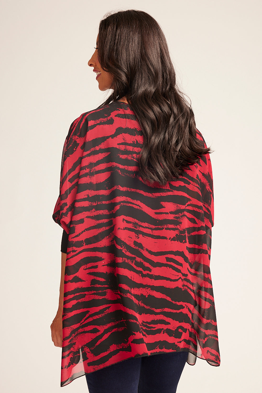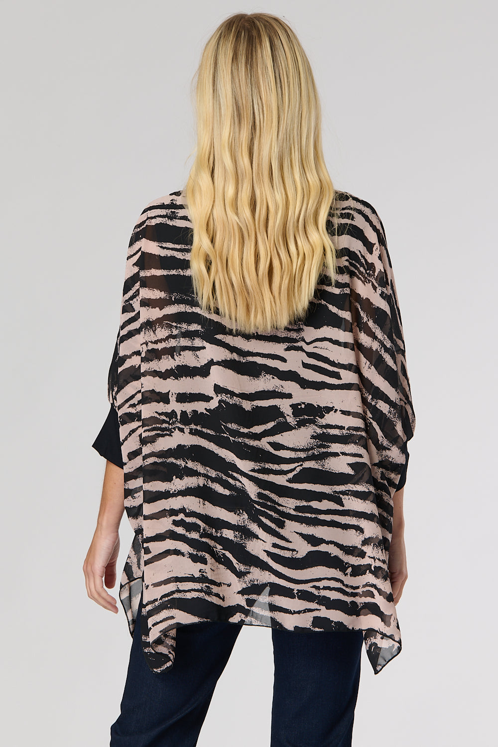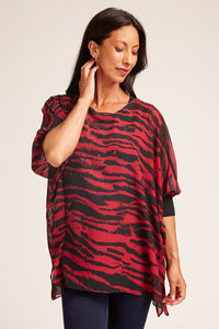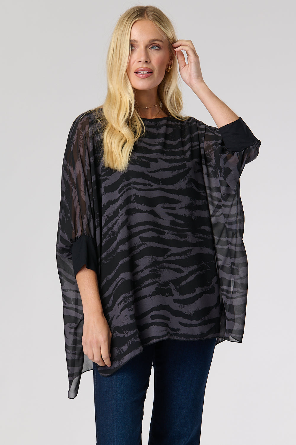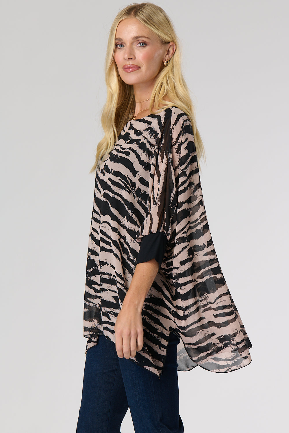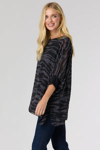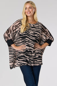 This top features an elegant double-layer design: a lightweight chiffon over-layer with a unique animal print, and a figure-grazing black underlayer. 3/4 length batwing sleeves with contrasting cuffs and a curved hem add an extra touch of style to this alluring piece. Show it off with jeans and heels for a glamorous look.