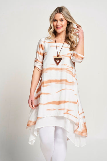 This dress features a double layer design and A-line silhouette, providing a flattering and comfortable fit. Its button tab gathered sleeves and round neck add stylish details, while the included matching necklace completes the look. With a side dip seam, this dress offers a unique touch to any outfit.