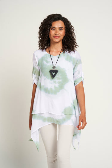 Effortlessly chic with a touch of bohemian flair, this A-line tunic features a double layer design for added dimension. The side dips provide a flattering silhouette, while the tie & dye print adds a playful pop of colour. Complete the look with the ruched sleeves and matching necklace*.