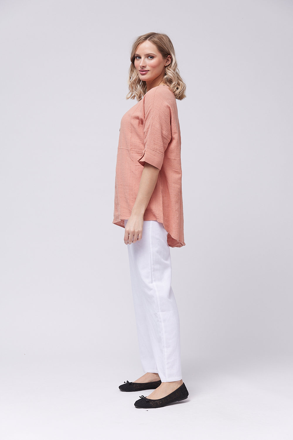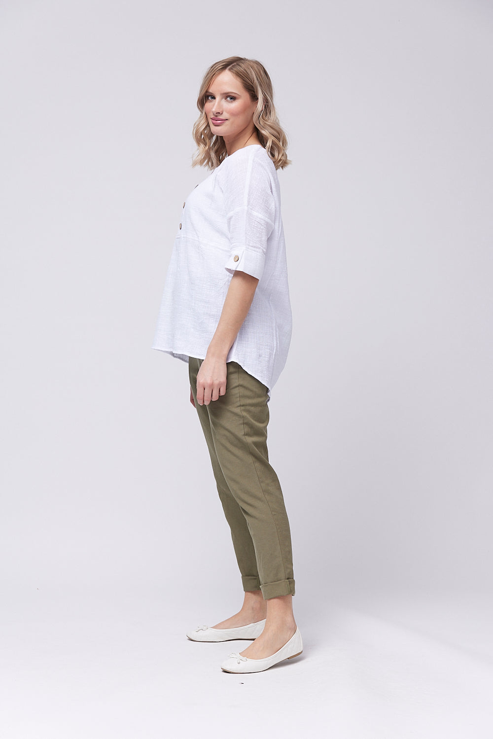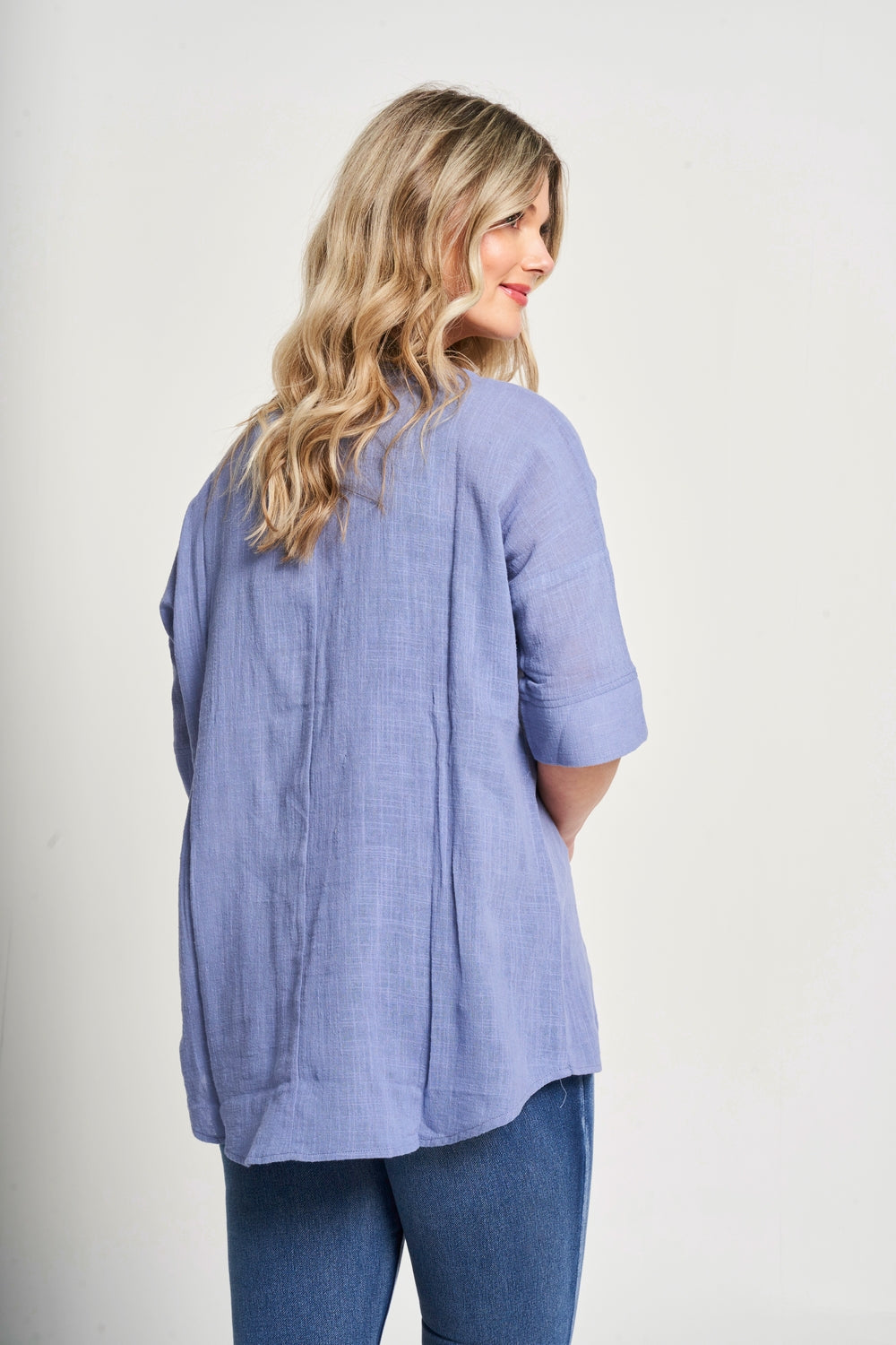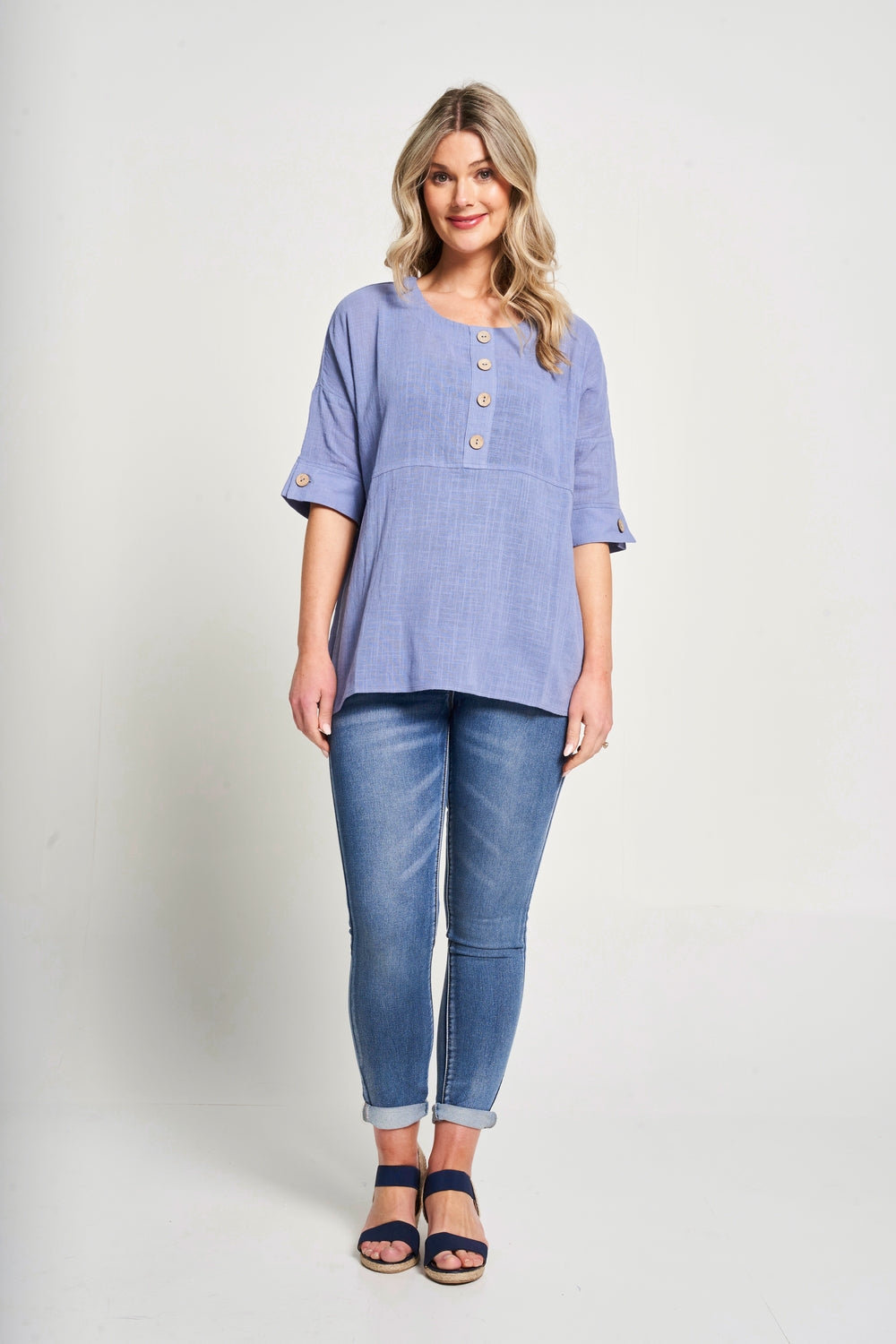 An oversized top featuring a distinctive button placket and chic elbow-length sleeves with button accents. The dip-back design adds a modern twist to this classic piece. Enjoy comfortable, effortless style with this versatile top.