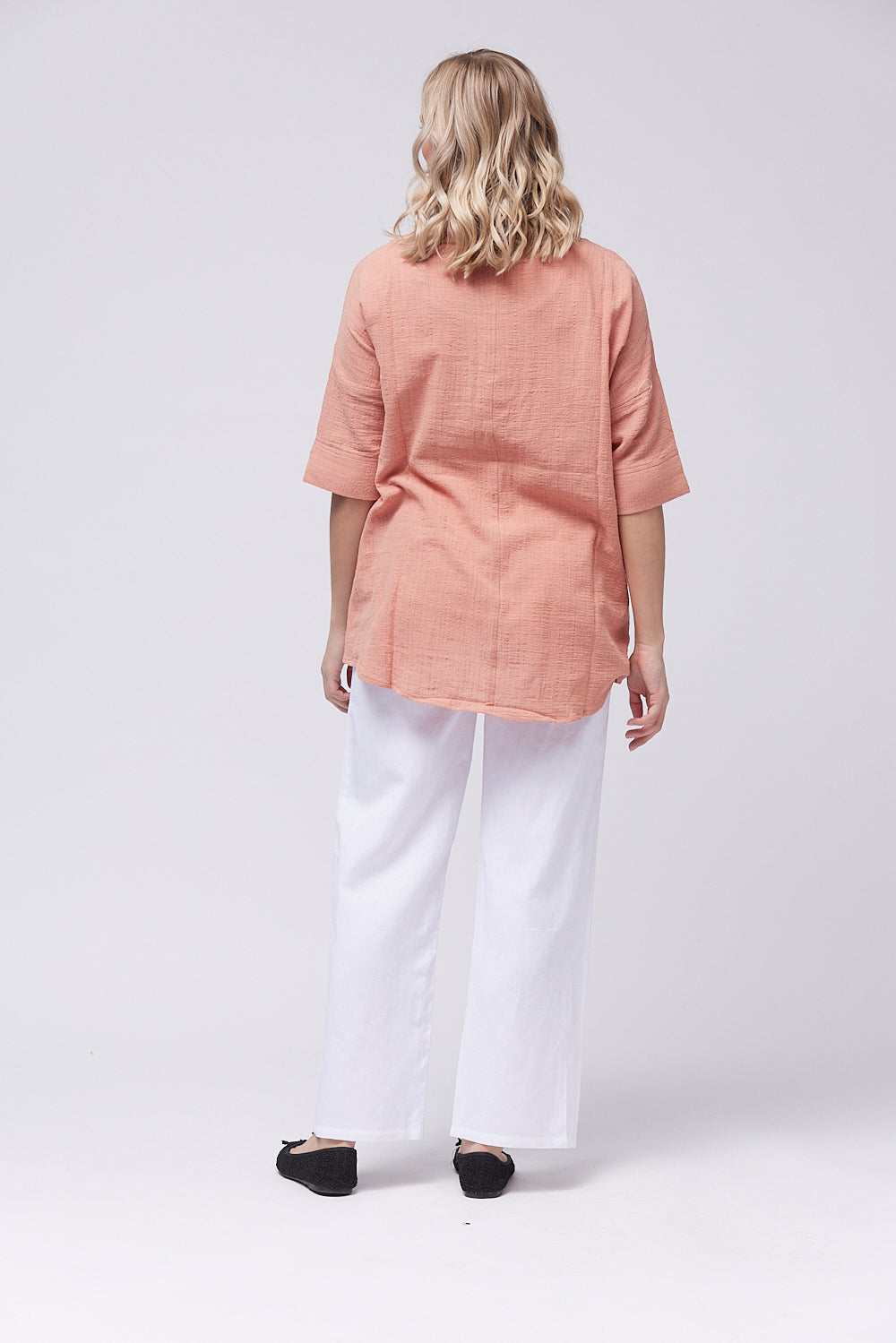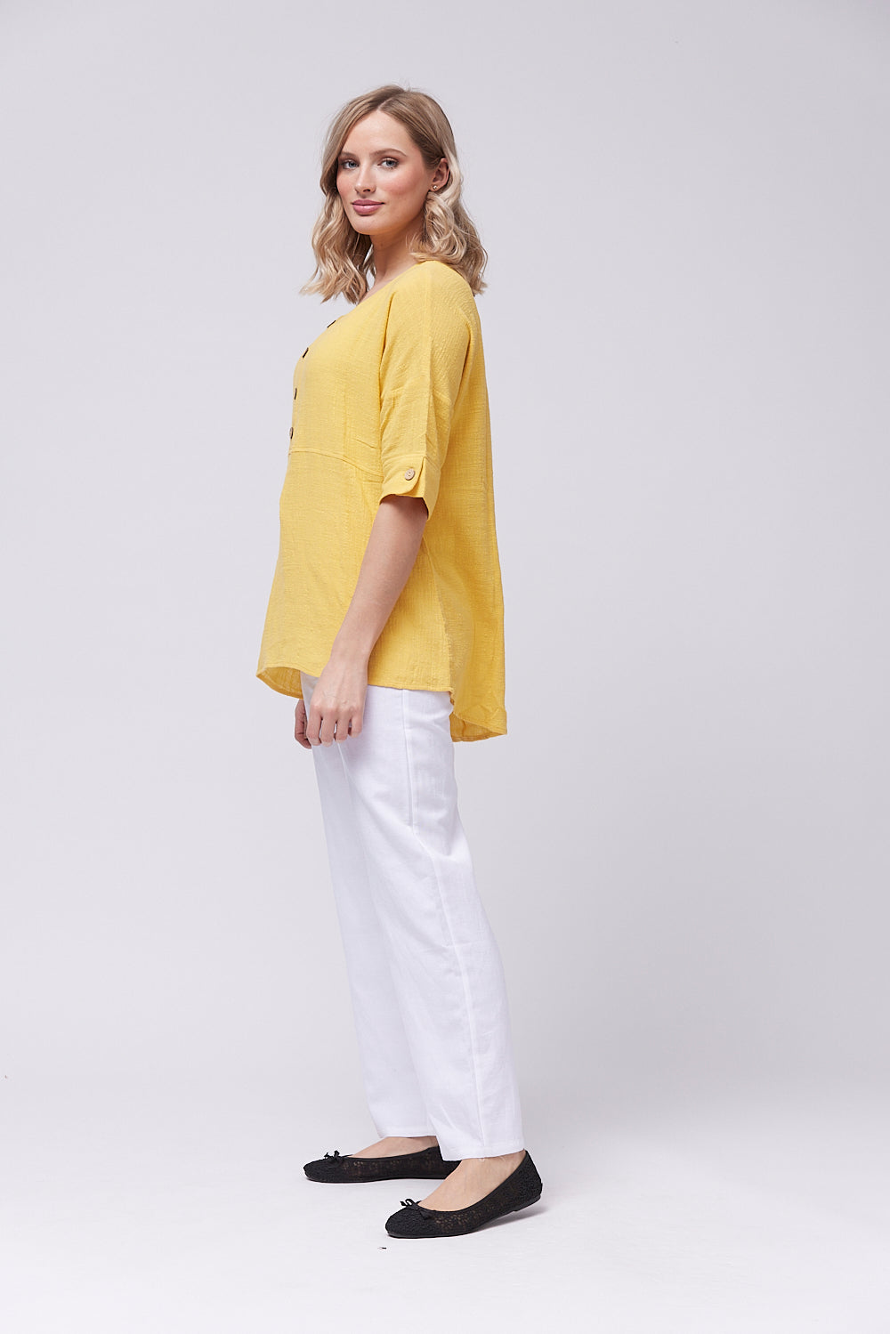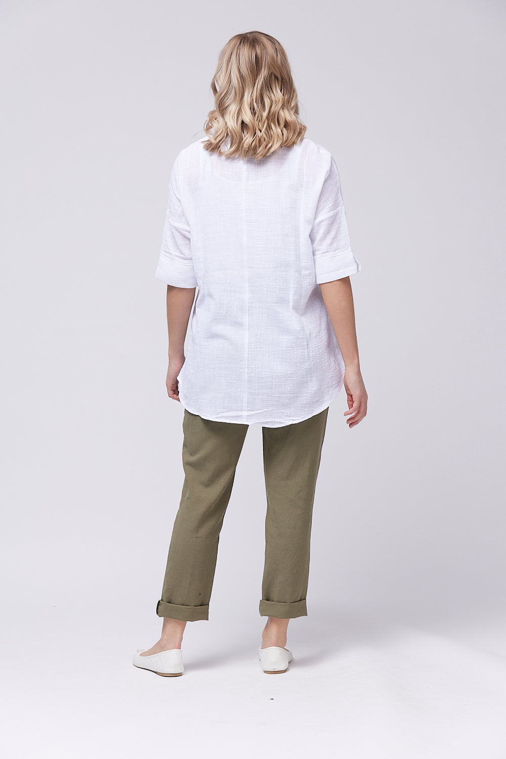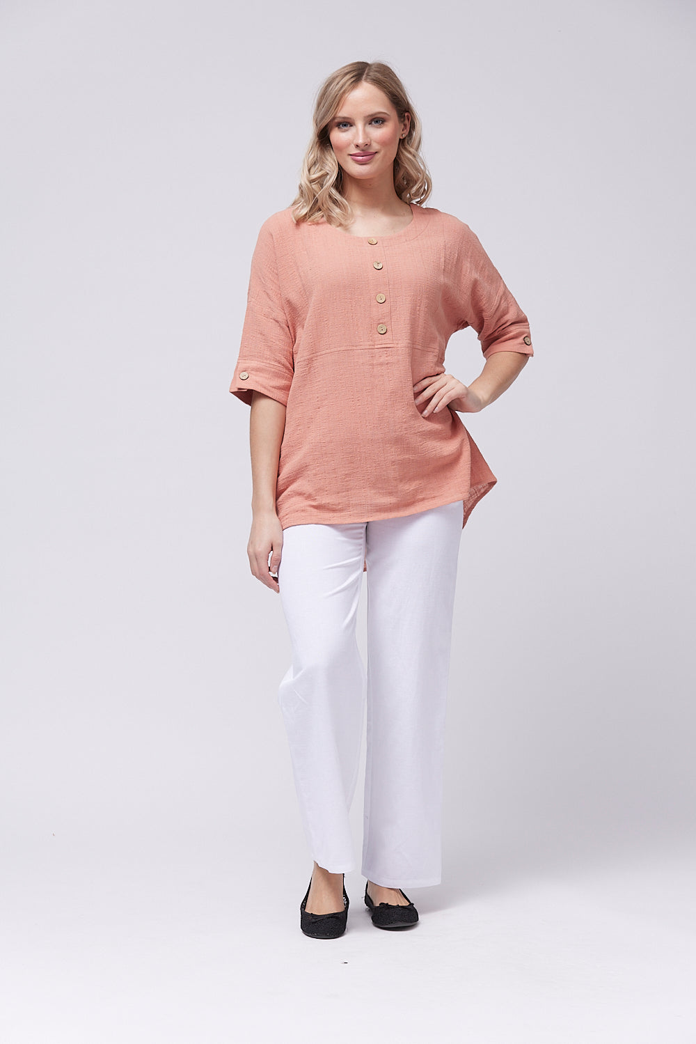 An oversized top featuring a distinctive button placket and chic elbow-length sleeves with button accents. The dip-back design adds a modern twist to this classic piece. Enjoy comfortable, effortless style with this versatile top.