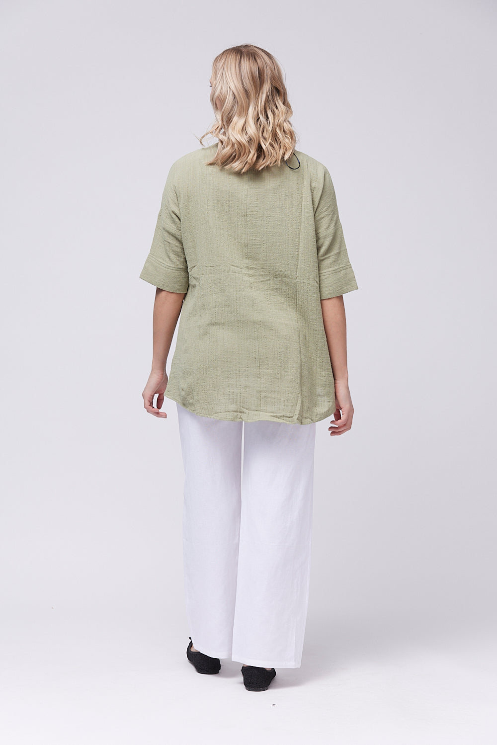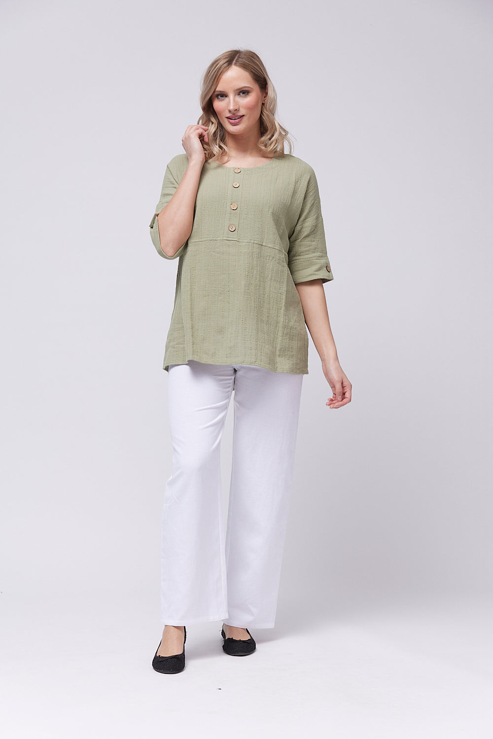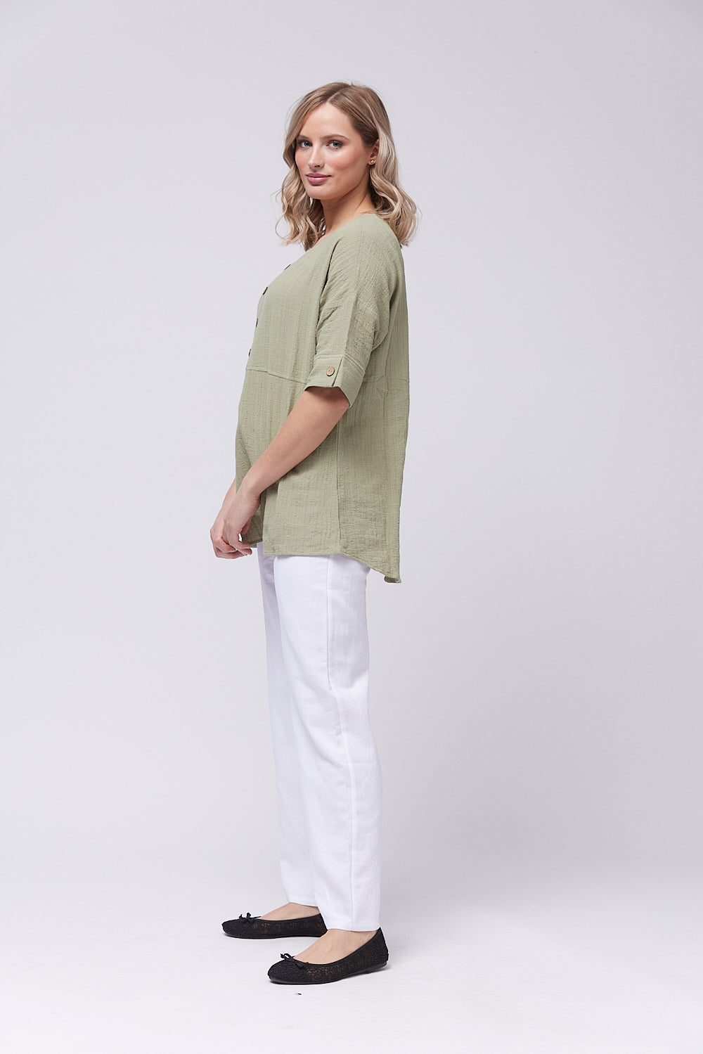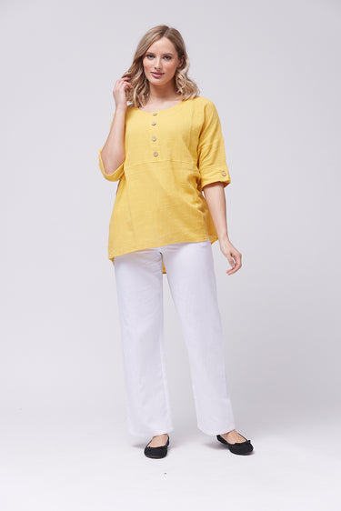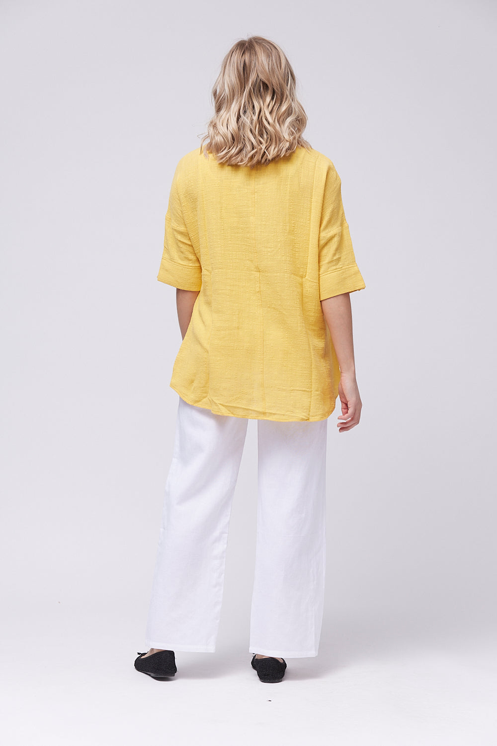 An oversized top featuring a distinctive button placket and chic elbow-length sleeves with button accents. The dip-back design adds a modern twist to this classic piece. Enjoy comfortable, effortless style with this versatile top.